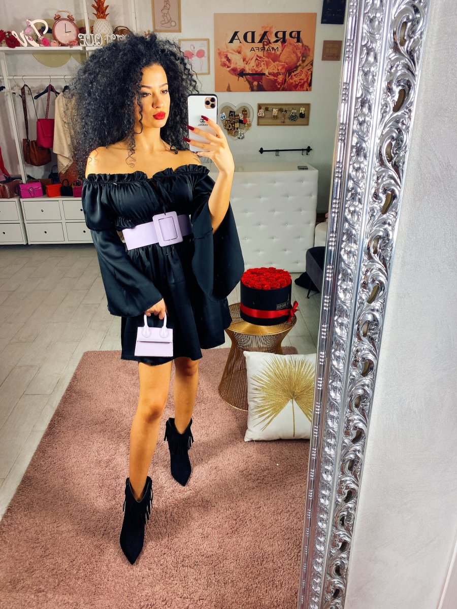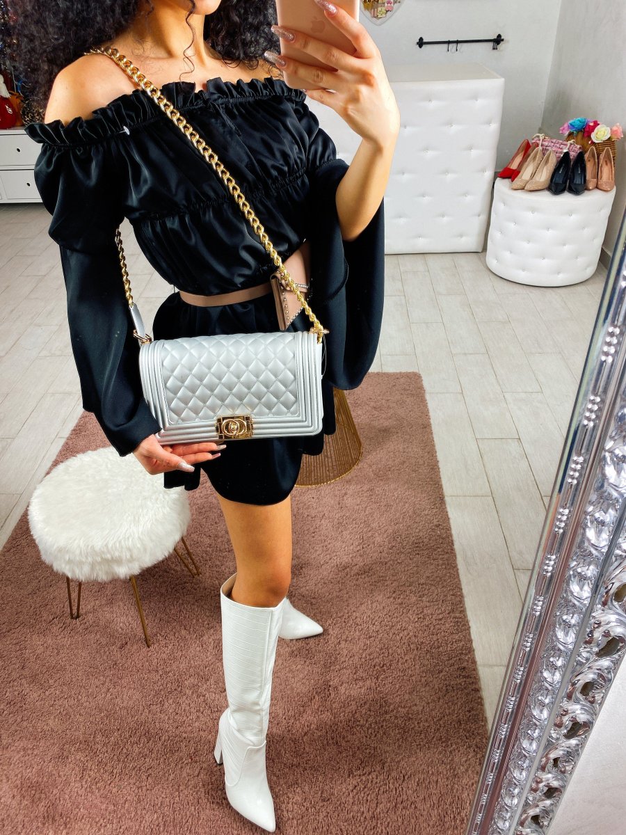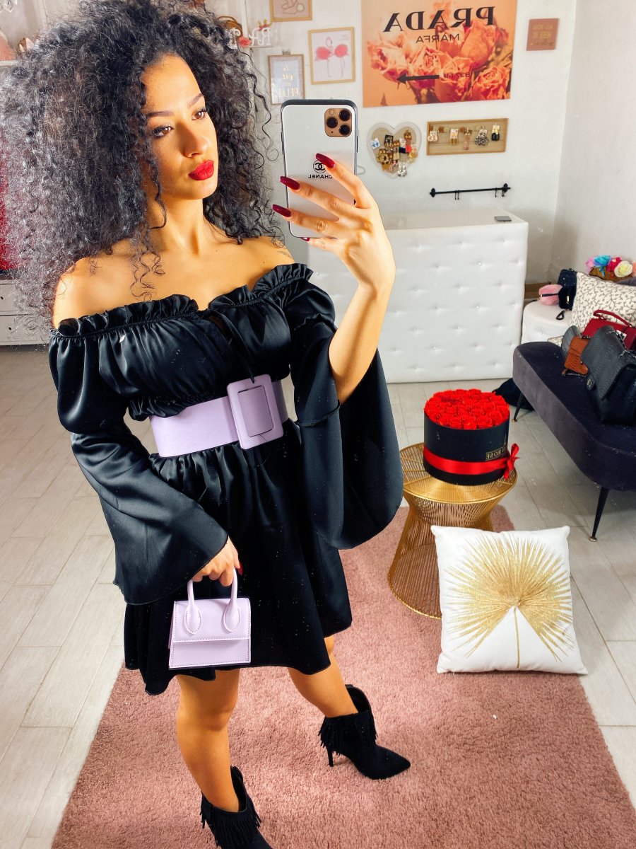 Abito in raso con scollo a barchetta e arricciatura. Manica lunga con spacco. Tessuto comodo e elasticizzato. Fodera a pantaloncino