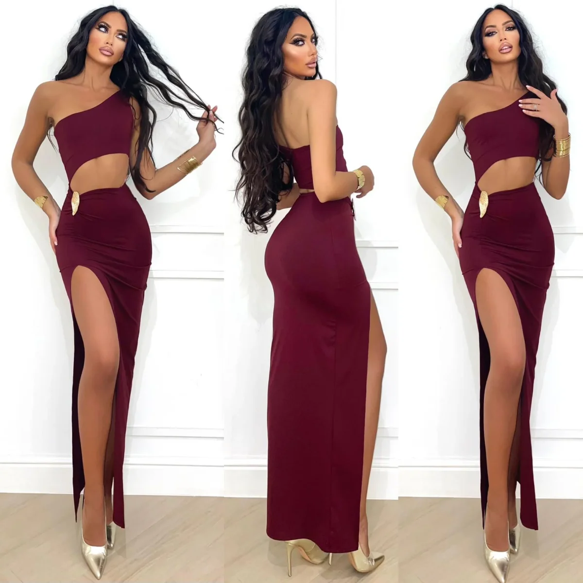 Lasciati sedurre dall’ eleganza del nostro Atena Dress, un abito lungo monospalla color bordeaux con dettagli dorati che valorizzano il punto vita e la silhouette. Il taglio cut-out strategico e lo spacco vertiginoso creano un equilibrio perfetto tra sensualità e raffinatezza.
