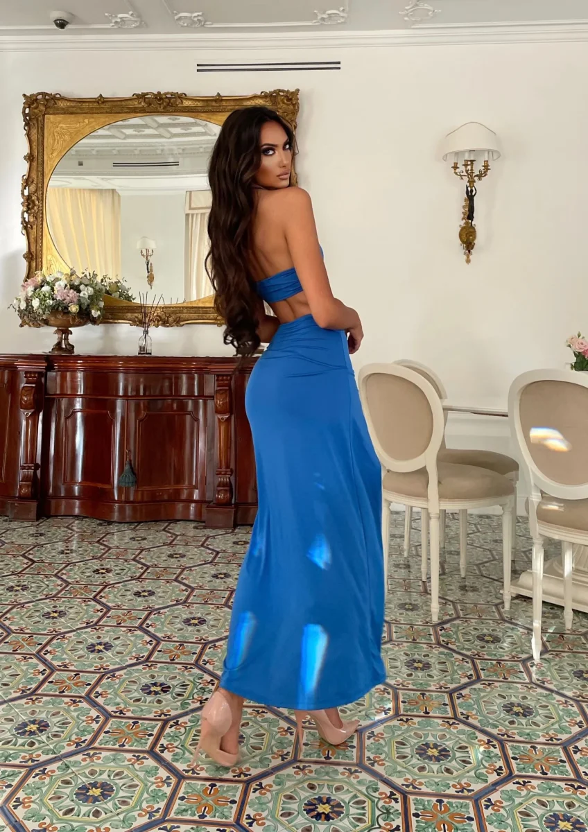 Abito lungo in tessuto elasticizzato con dettaglio sul davanti argento