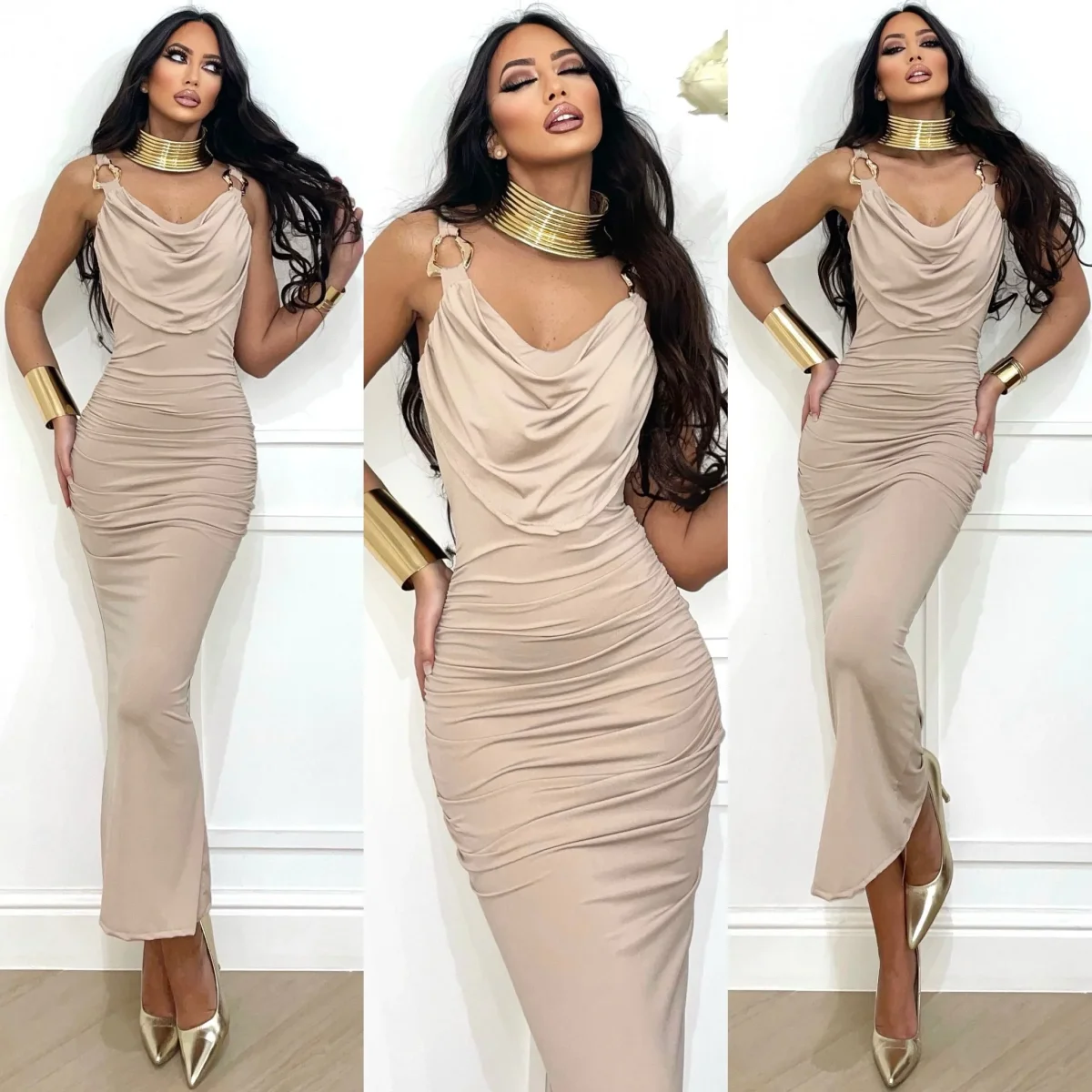 Abito in lycra aderente e elasticizzato con fodera, coppe e spalline con gioiello. Schiena incrociata