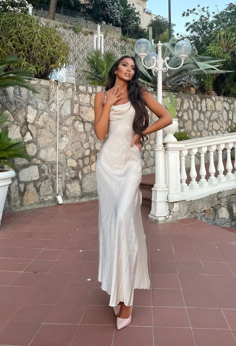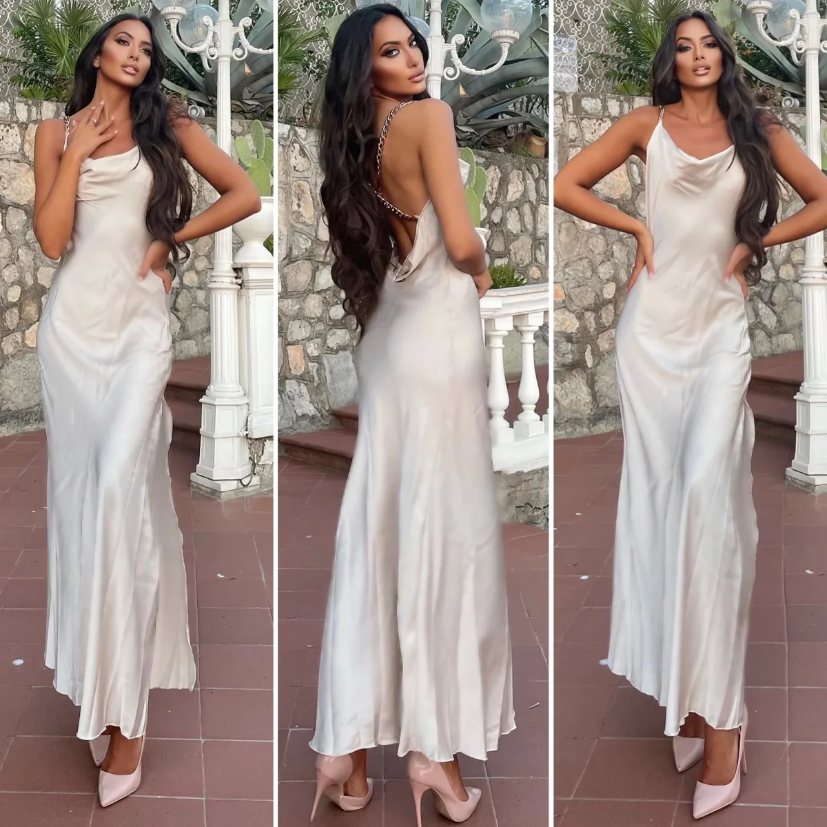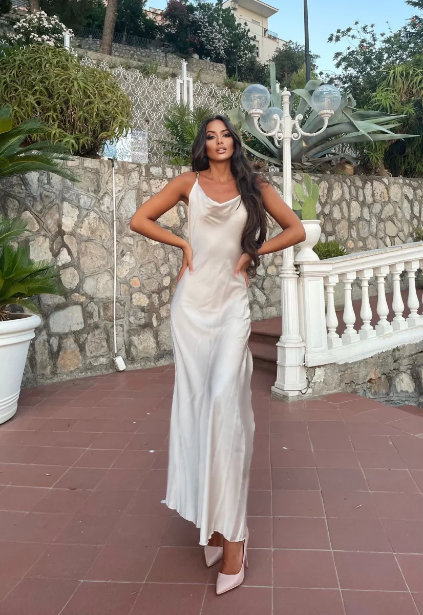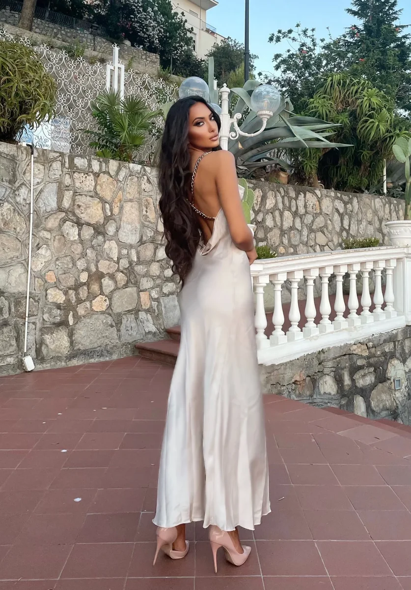 Abito arancio lungo con catena sulla schiena e incrocio a X , piccolo spacco sul fondo.