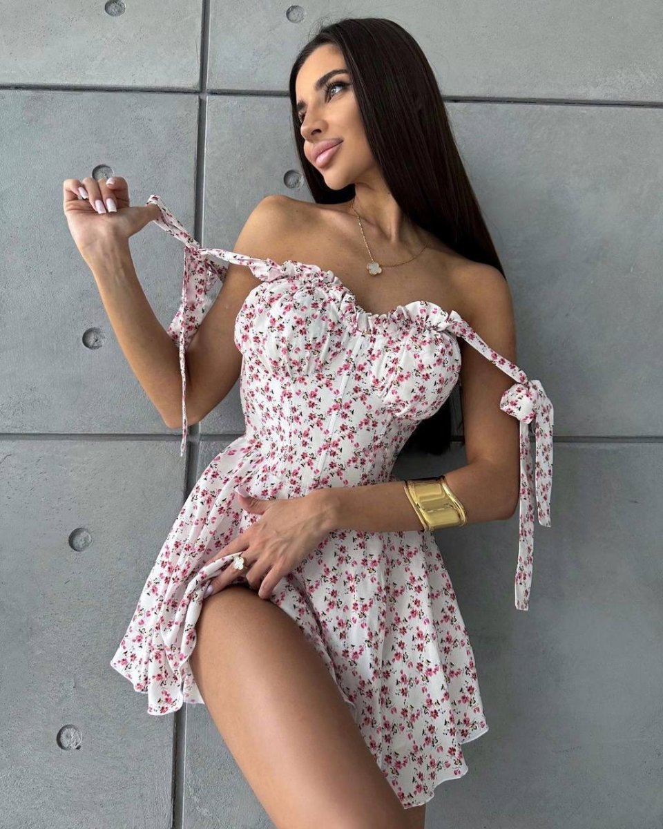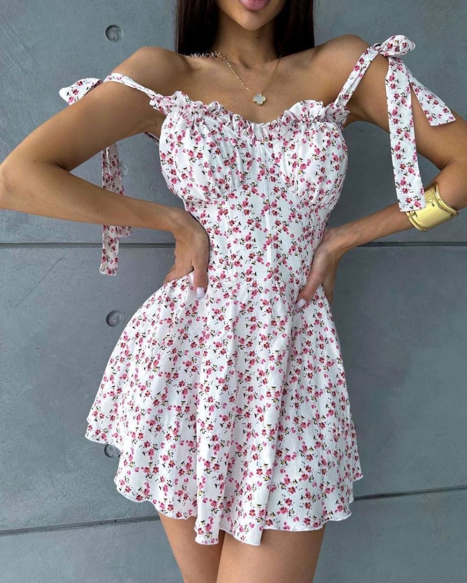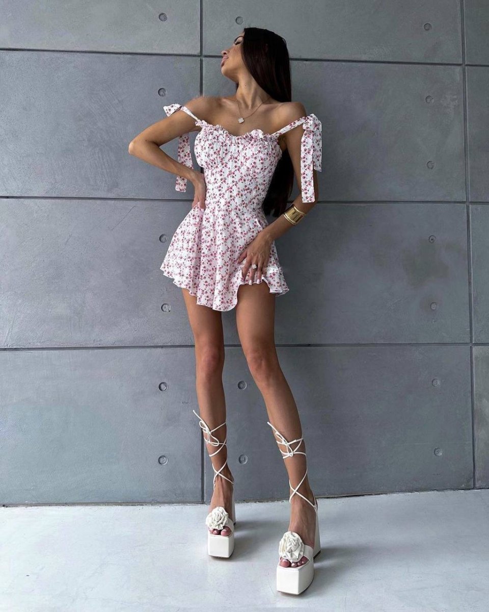Abito bianco a fiorellini senza coppe e fiocchetti sulle spalline, taglio in vita e gonna ampia. Fodera a pantaloncino.