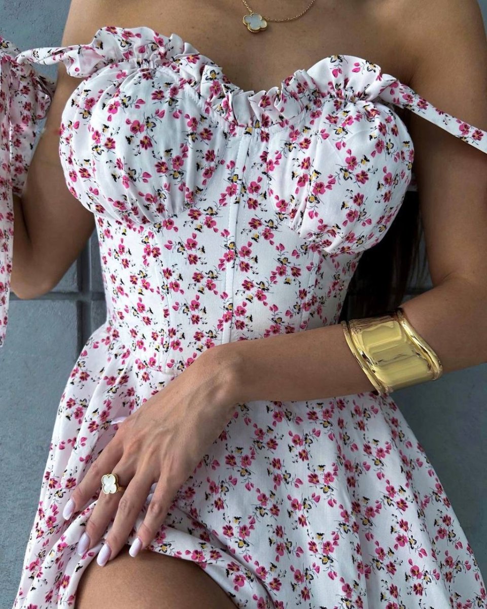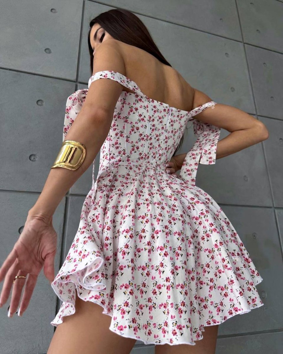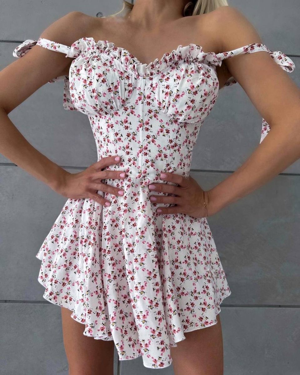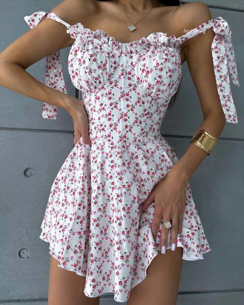 Abito bianco a fiorellini senza coppe e fiocchetti sulle spalline, taglio in vita e gonna ampia. Fodera a pantaloncino.