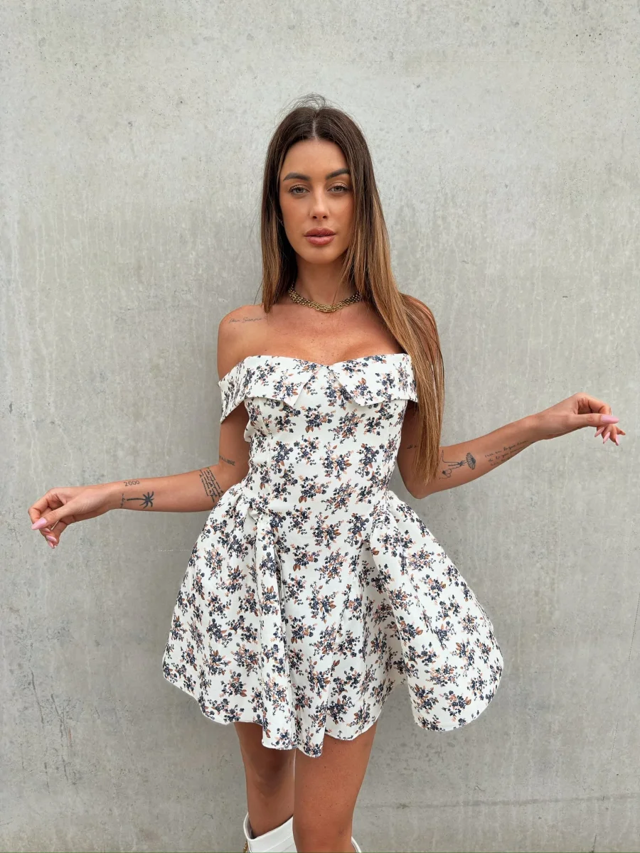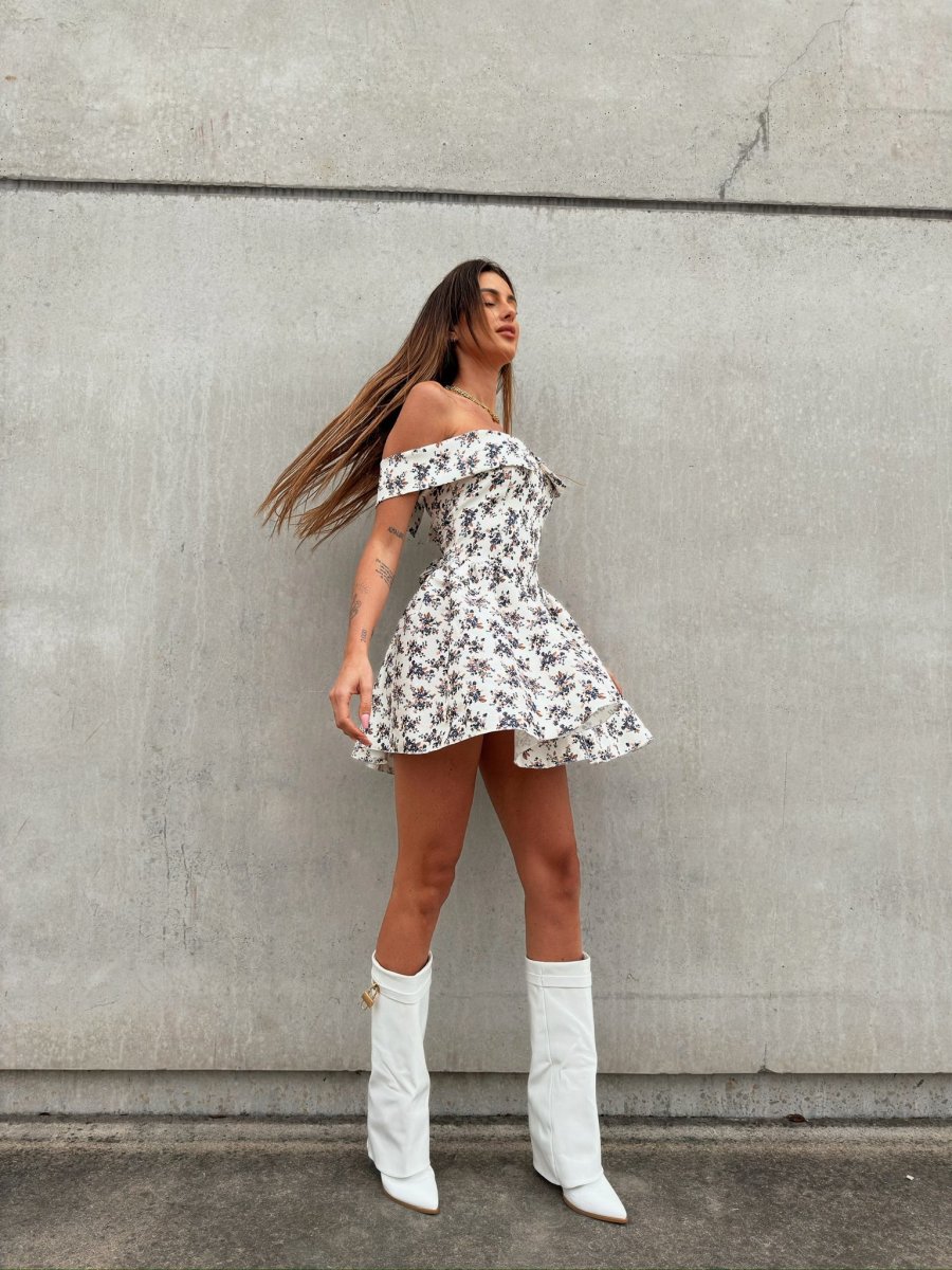 Abito con scollo a barchetta dotato anche di spalline e zip nel dietro. Fiocco nel dietro