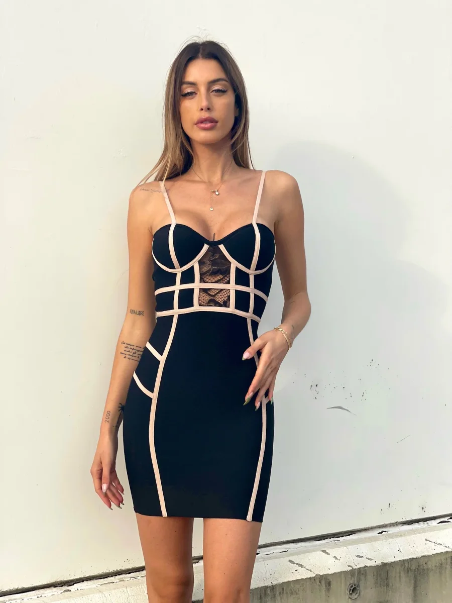 Abito aderente bustier con coppe piccolissime e chiusura con zip. Bellissimi dettagli rosa e pizzo. Aderisce perfettamente al corpo.