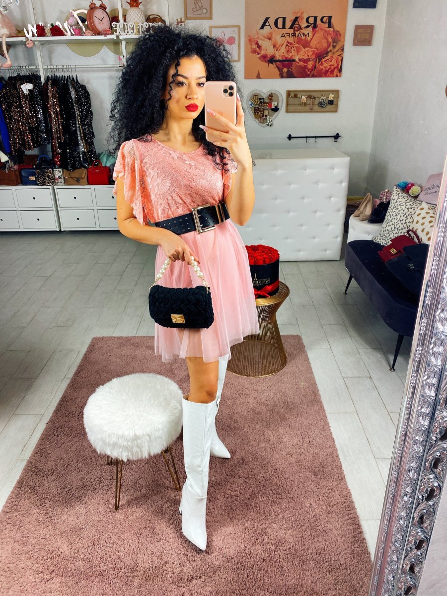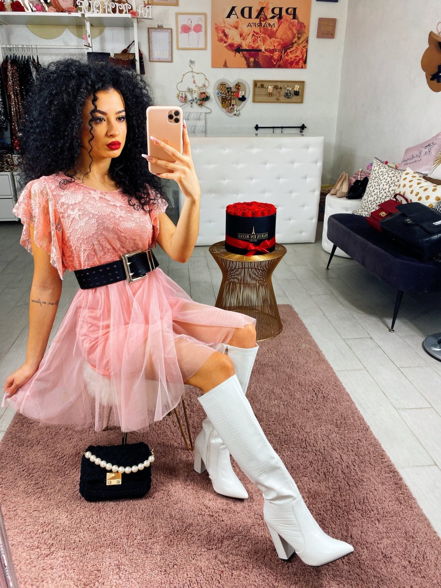 Abito con gonna in tulle e cinturino abbinato. Corpino ricamato con conchiglie e stelle marine.