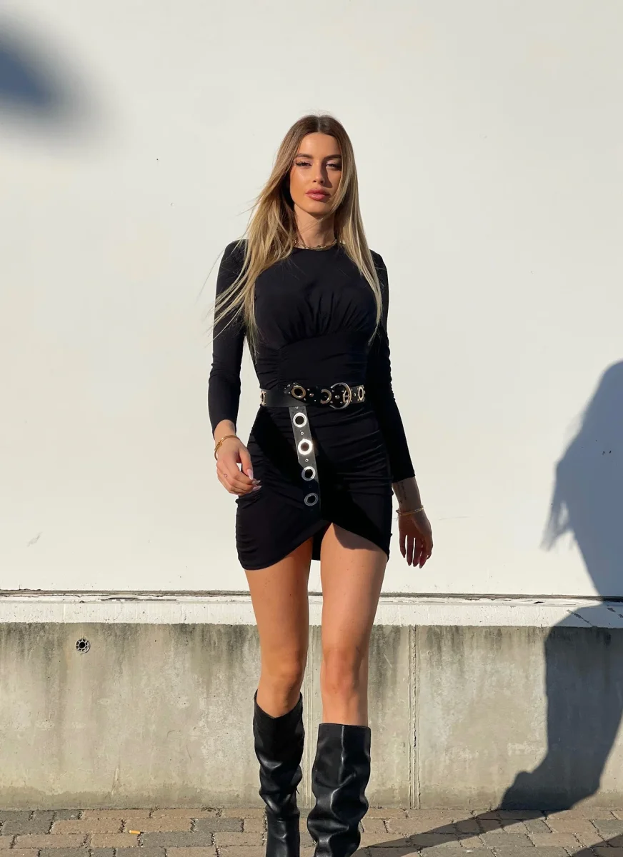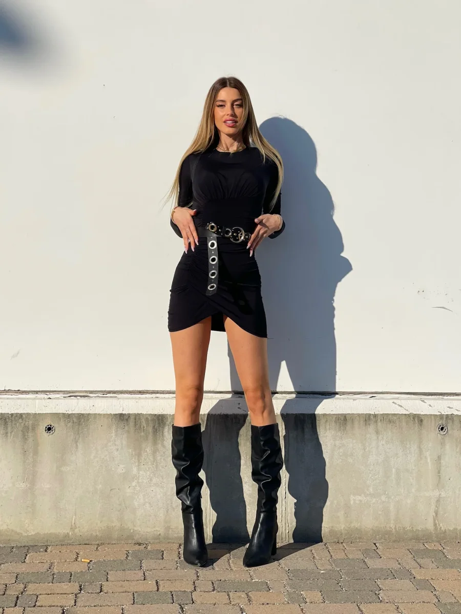 Abito in viscosa elasticizzata con coppe e arricciatura laterale. Gonna asimmetrica a portafoglio.
