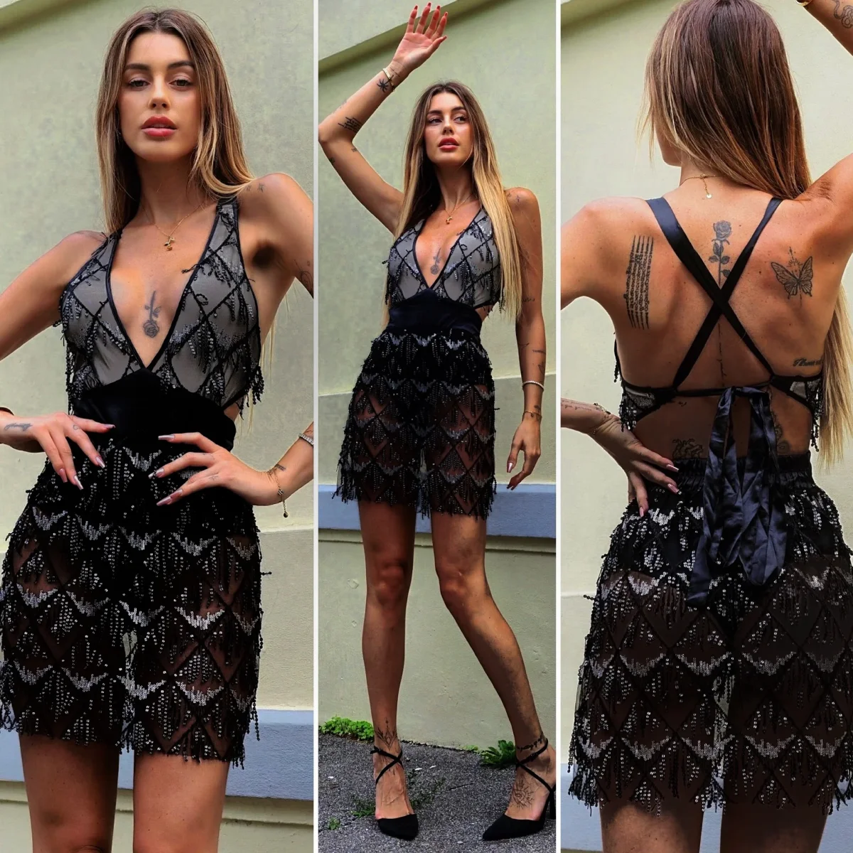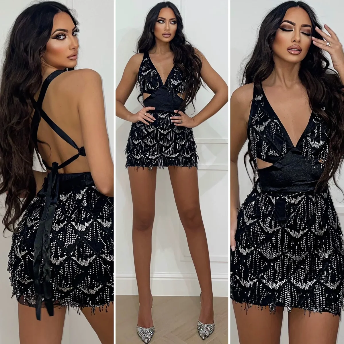 Recensisci per primo “Abito con frange e paillettes nero scollo a V”