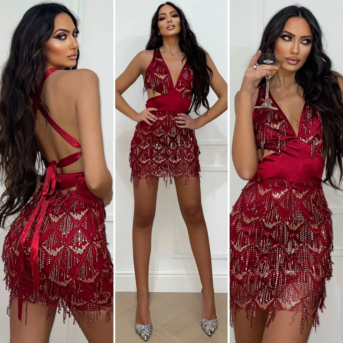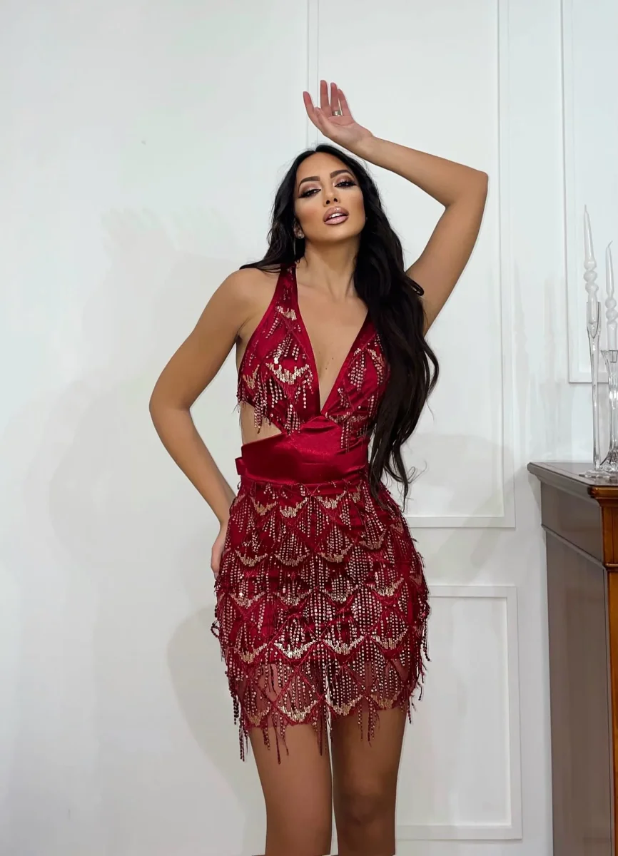 Recensisci per primo “Abito con frange e paillettes rosso scollo a V”