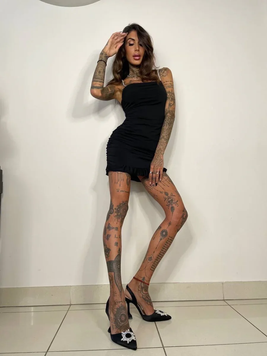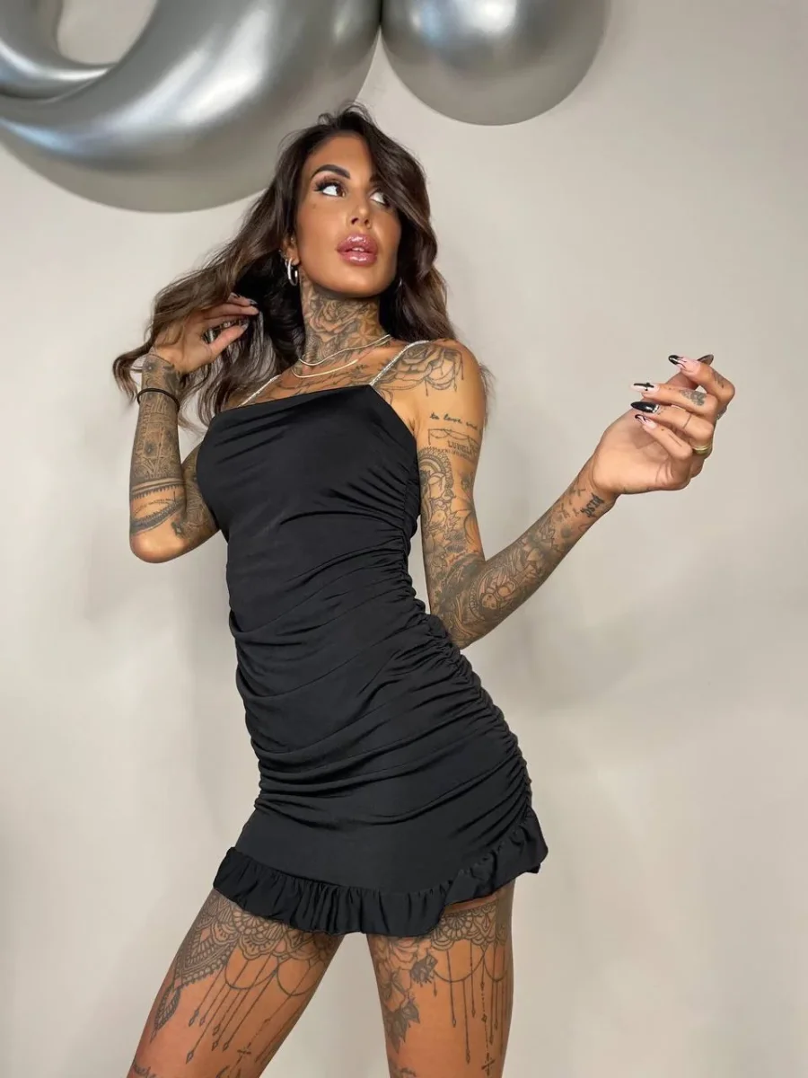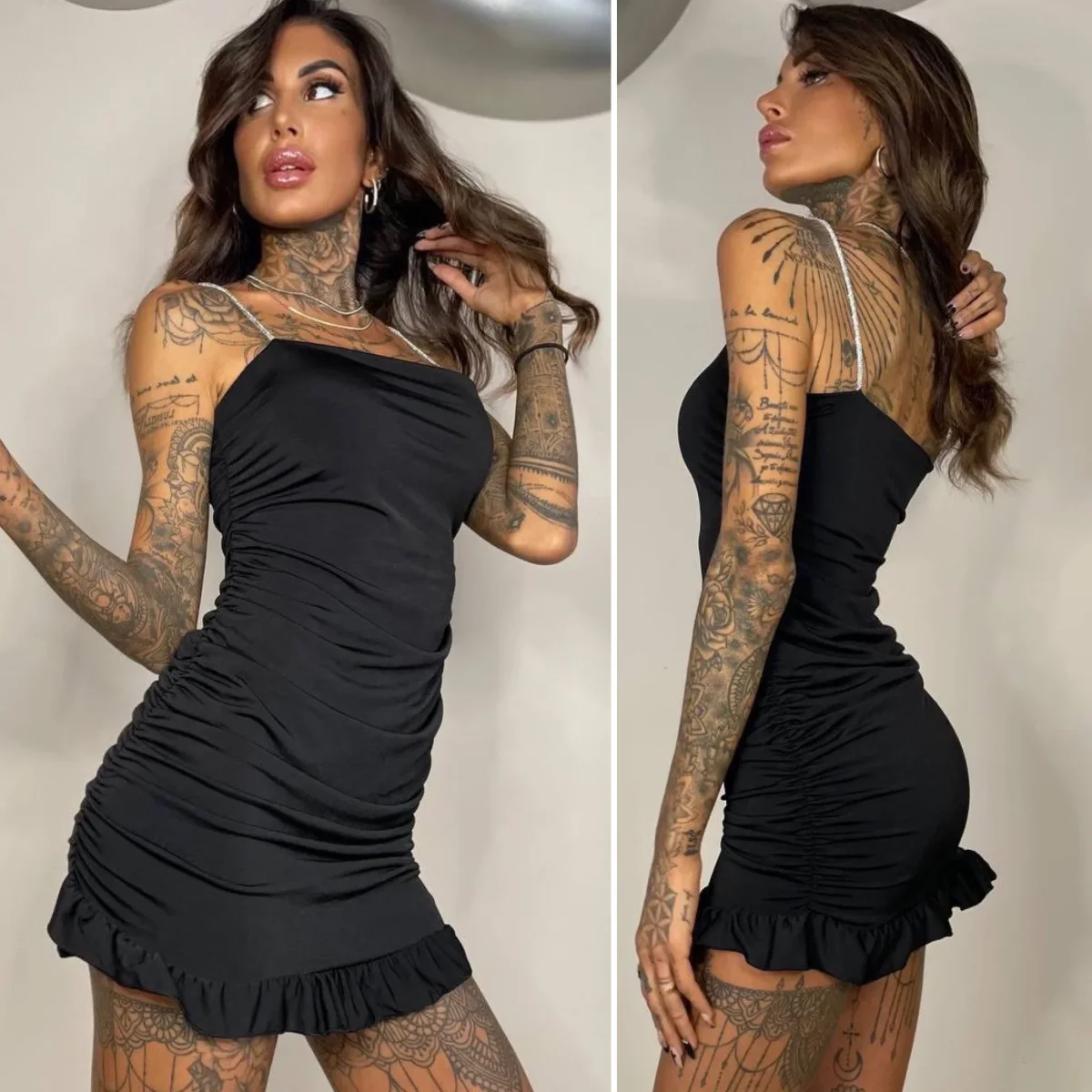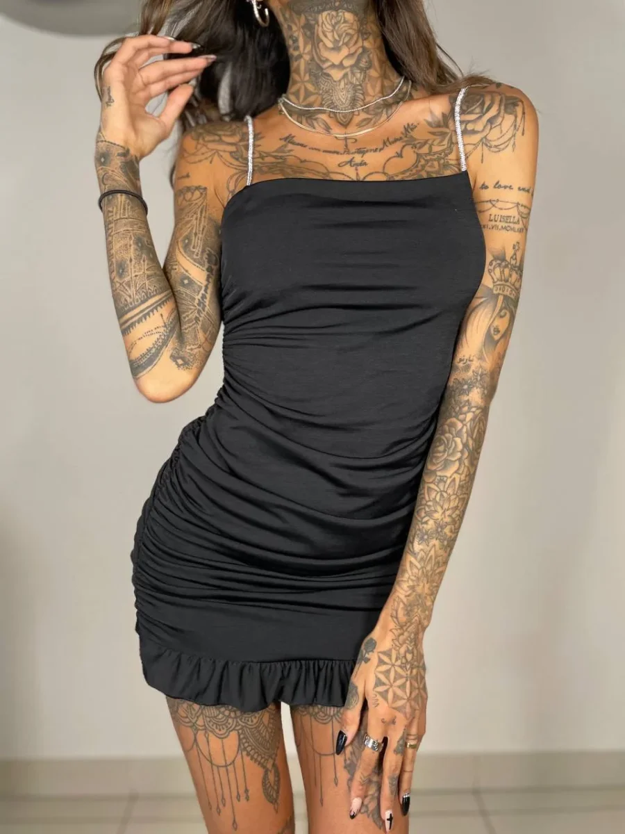 Abito in tessuto elasticizzato con spalline in strass e Rouches sul fondo