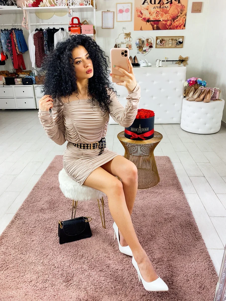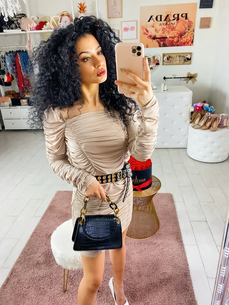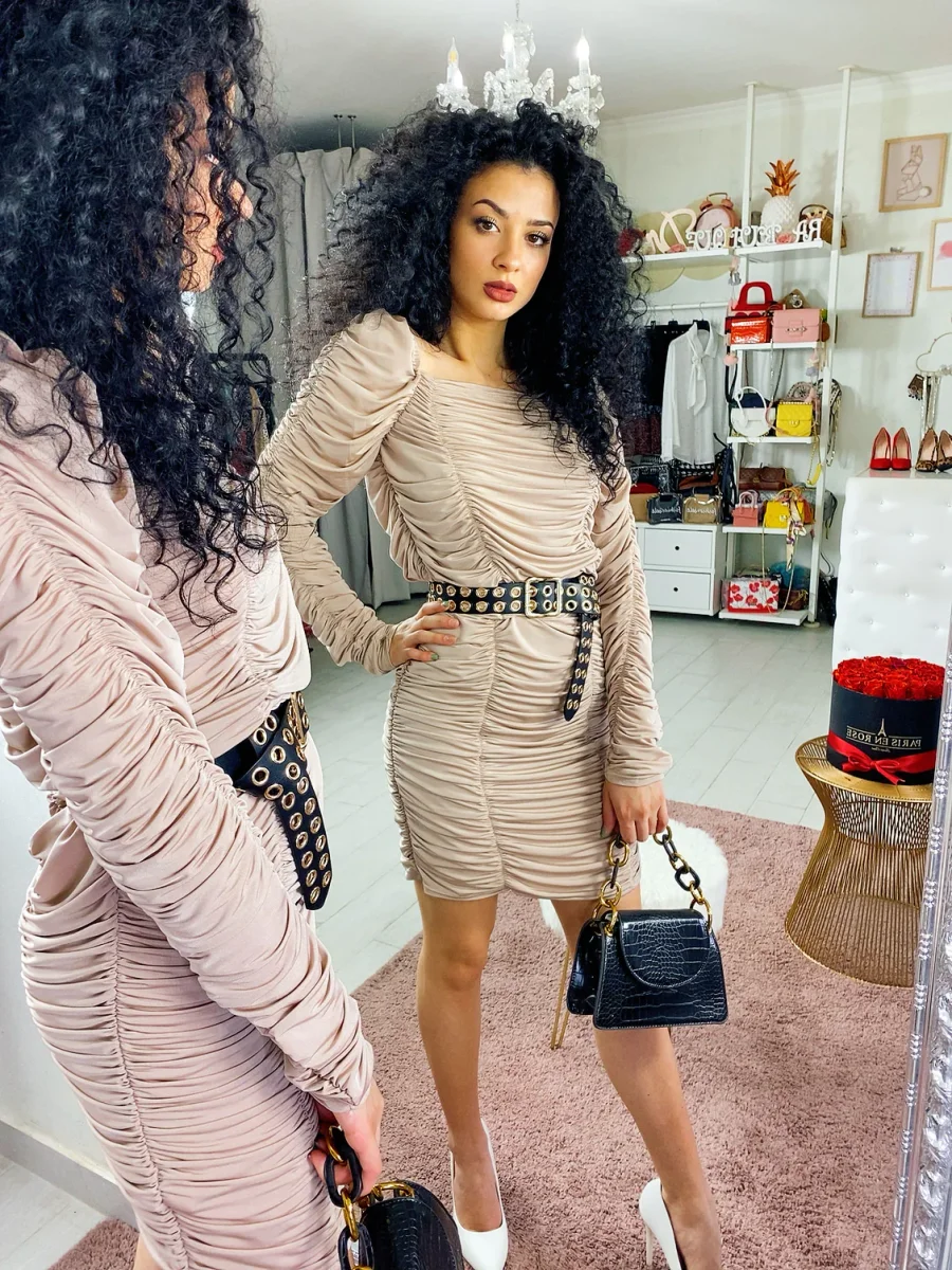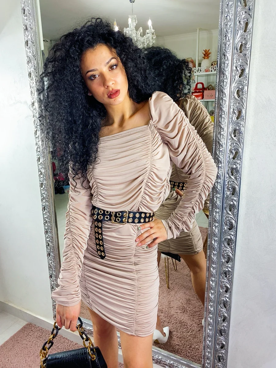 Abito lungo sopra al ginocchio con rouge e scollo. Può essere arricciato e accorciato anche con un maxi cinturone