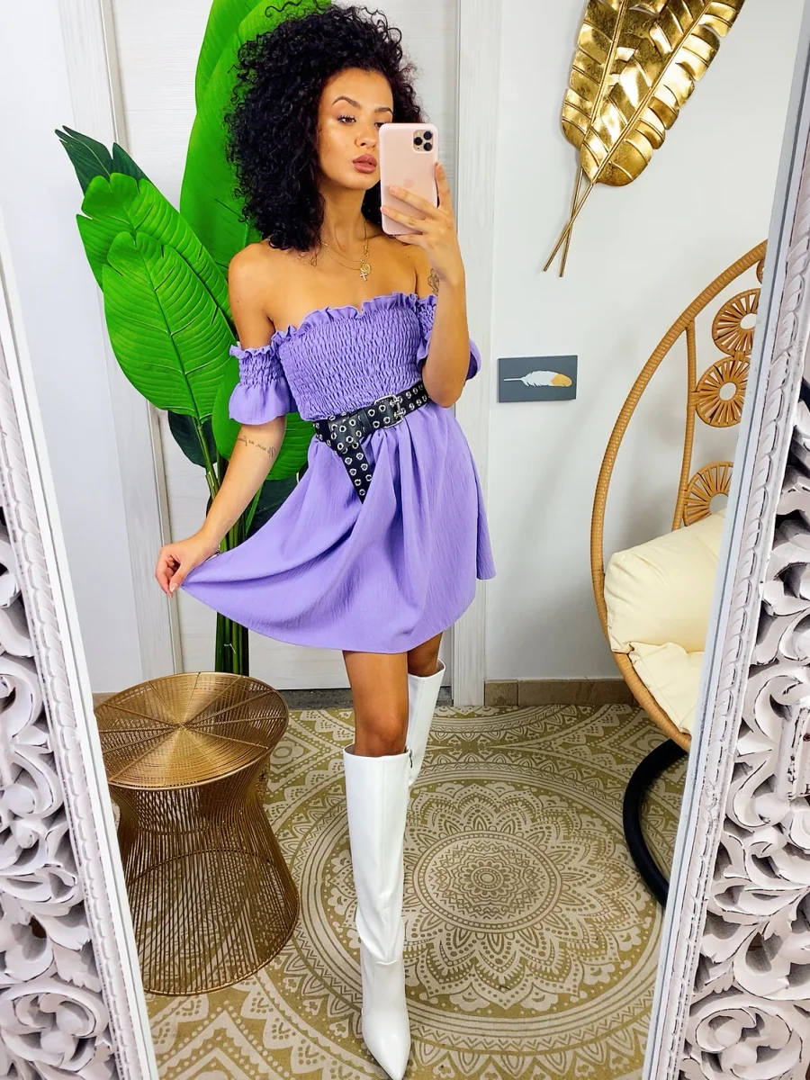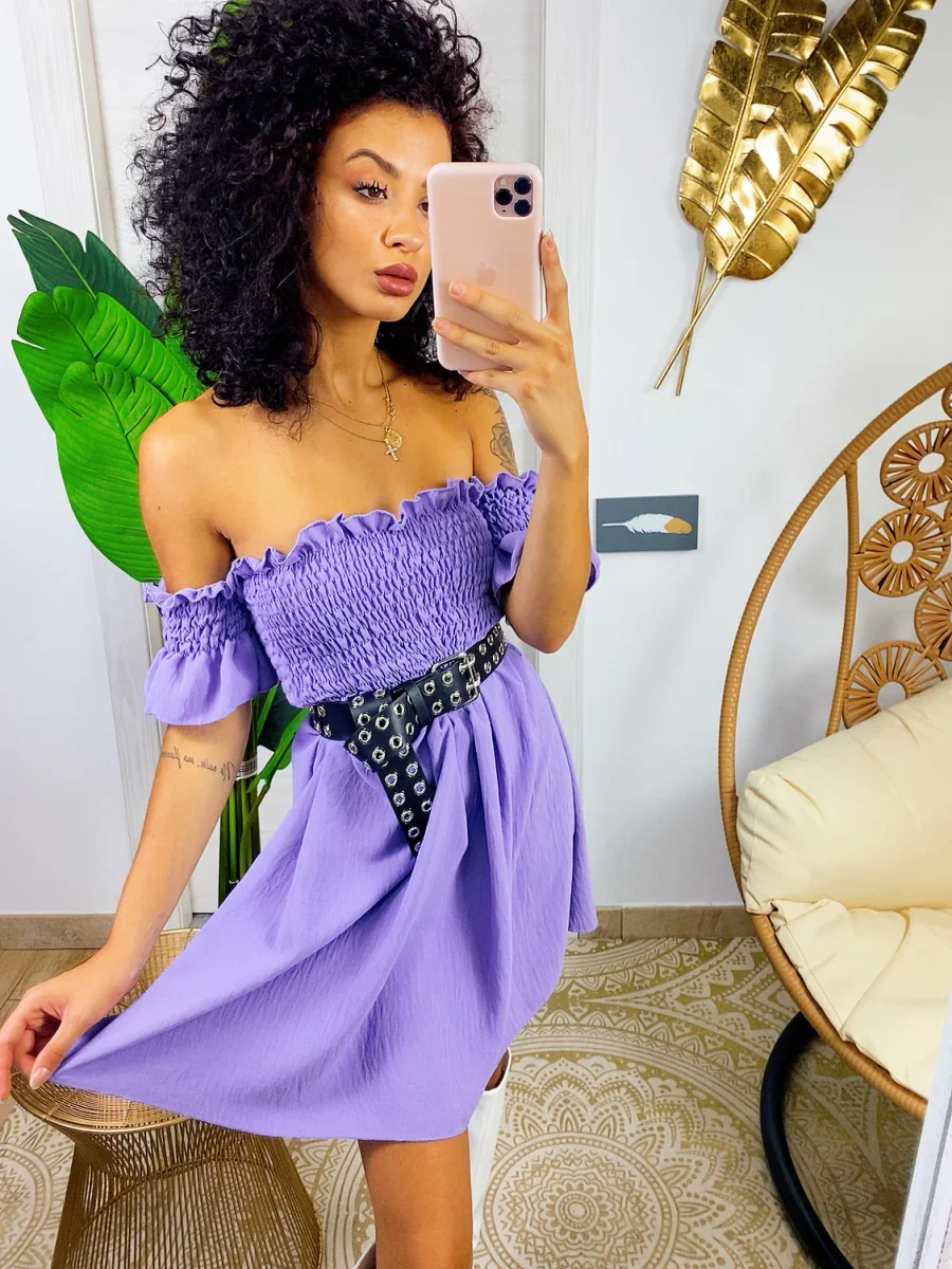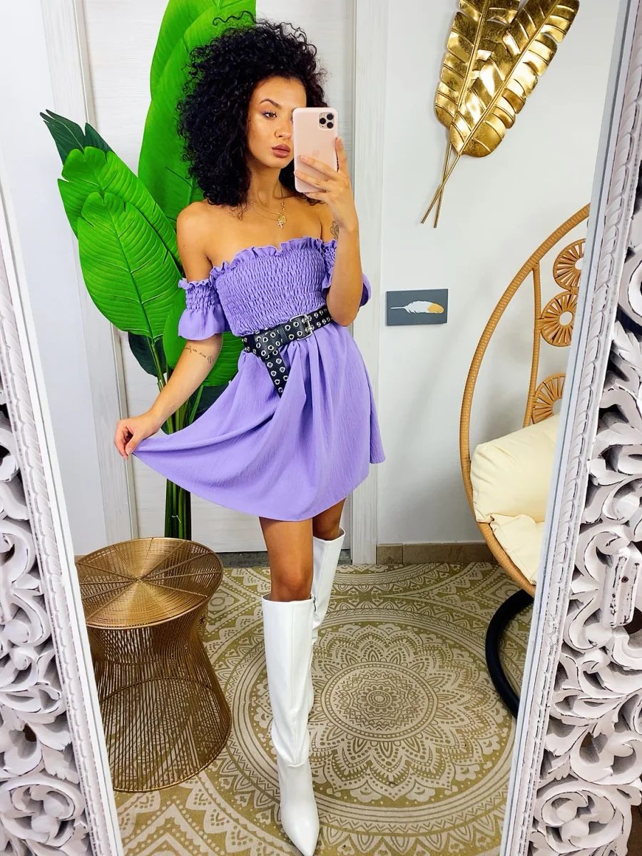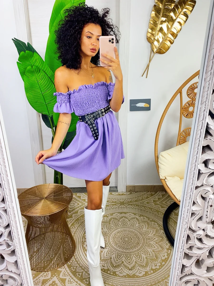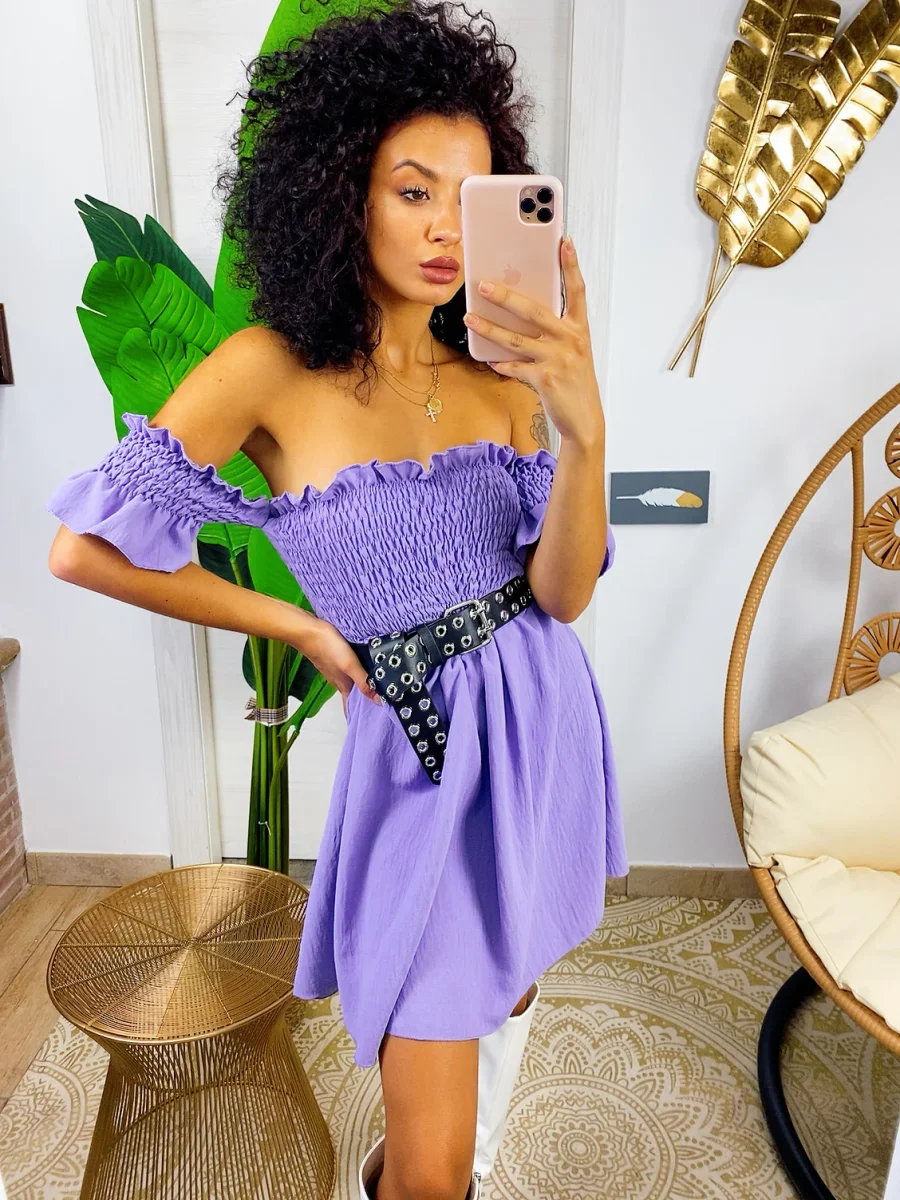 Abito con scollo a barchetta e arricciatura maniche corte. Arricciatura sul busto . Vestibilità elasticizzata.