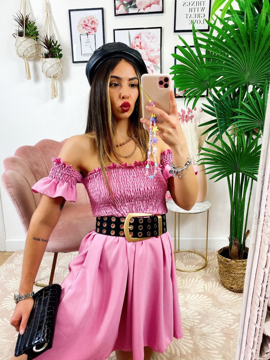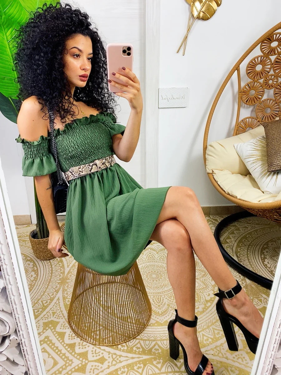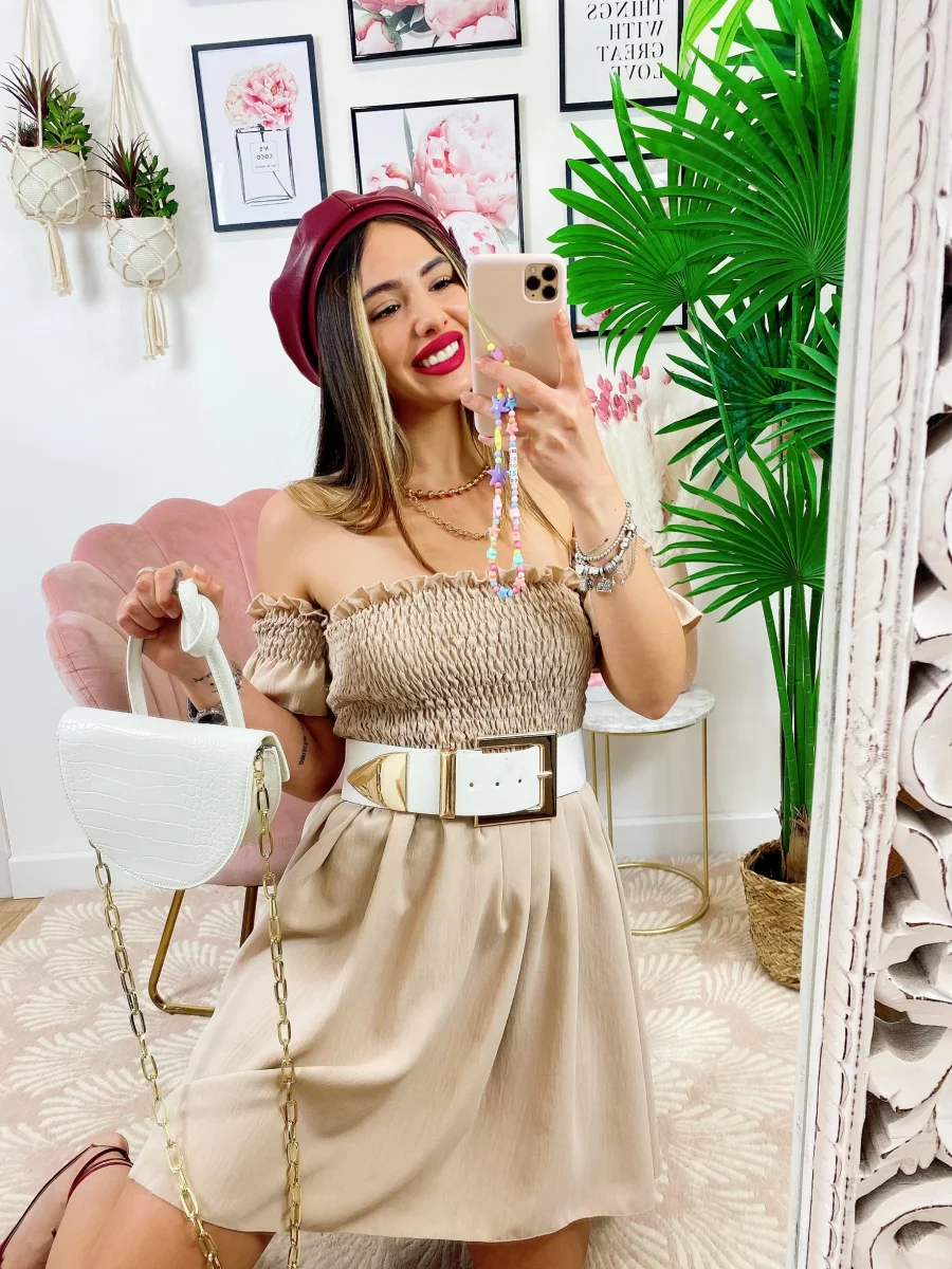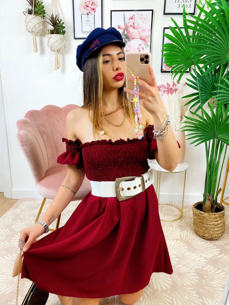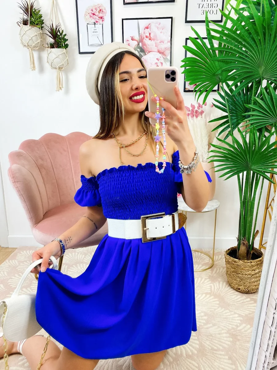 Abito con scollo a barchetta e arricciatura maniche corte. Arricciatura sul busto . Vestibilità elasticizzata