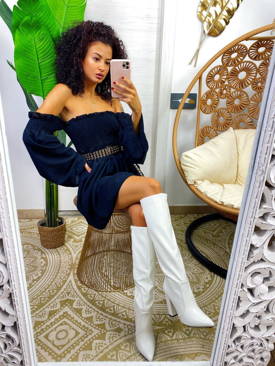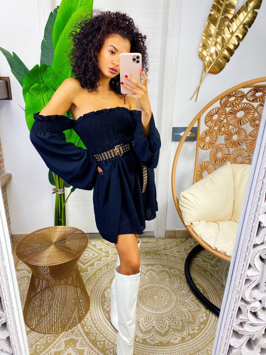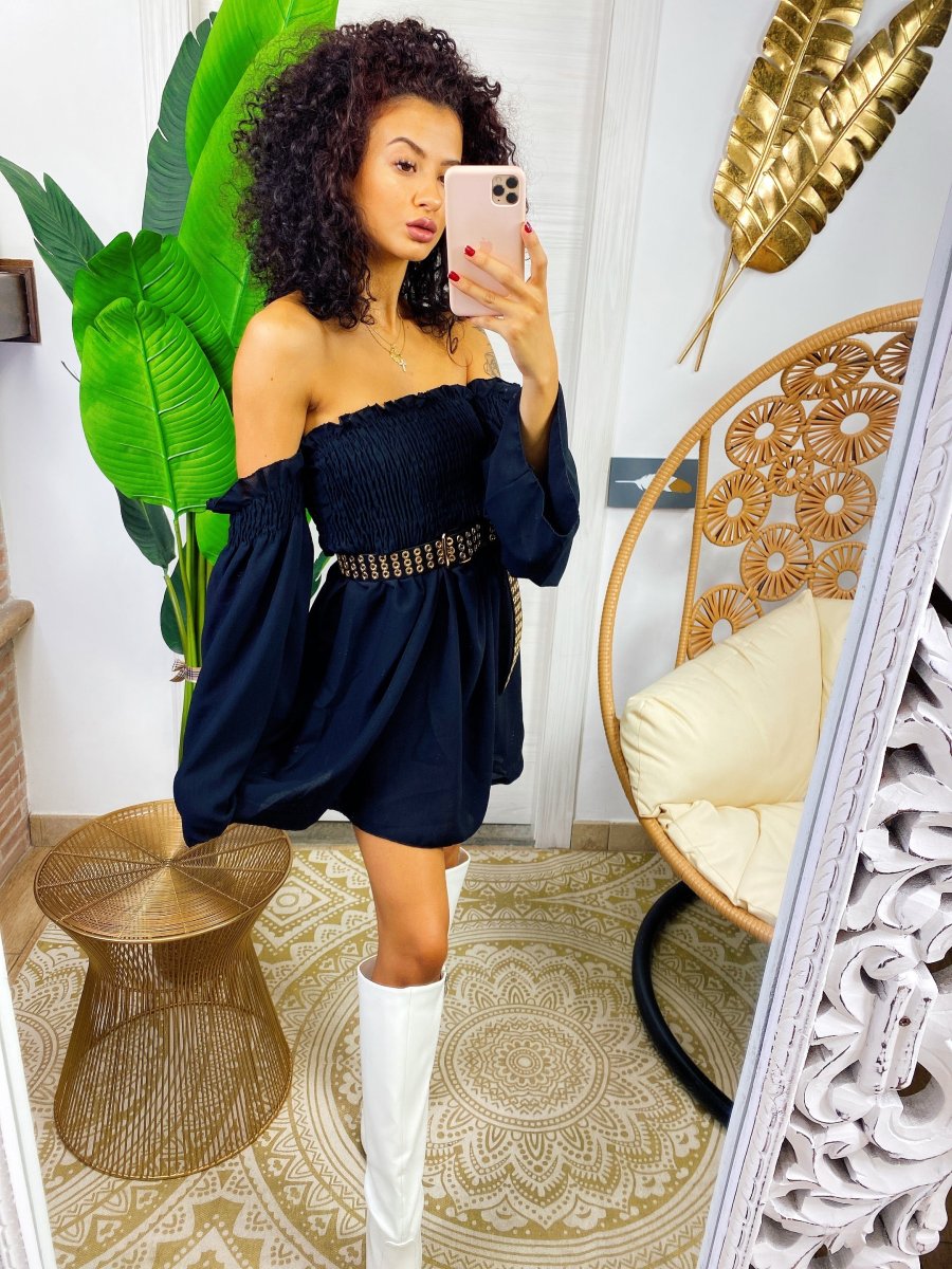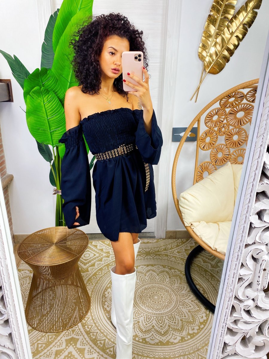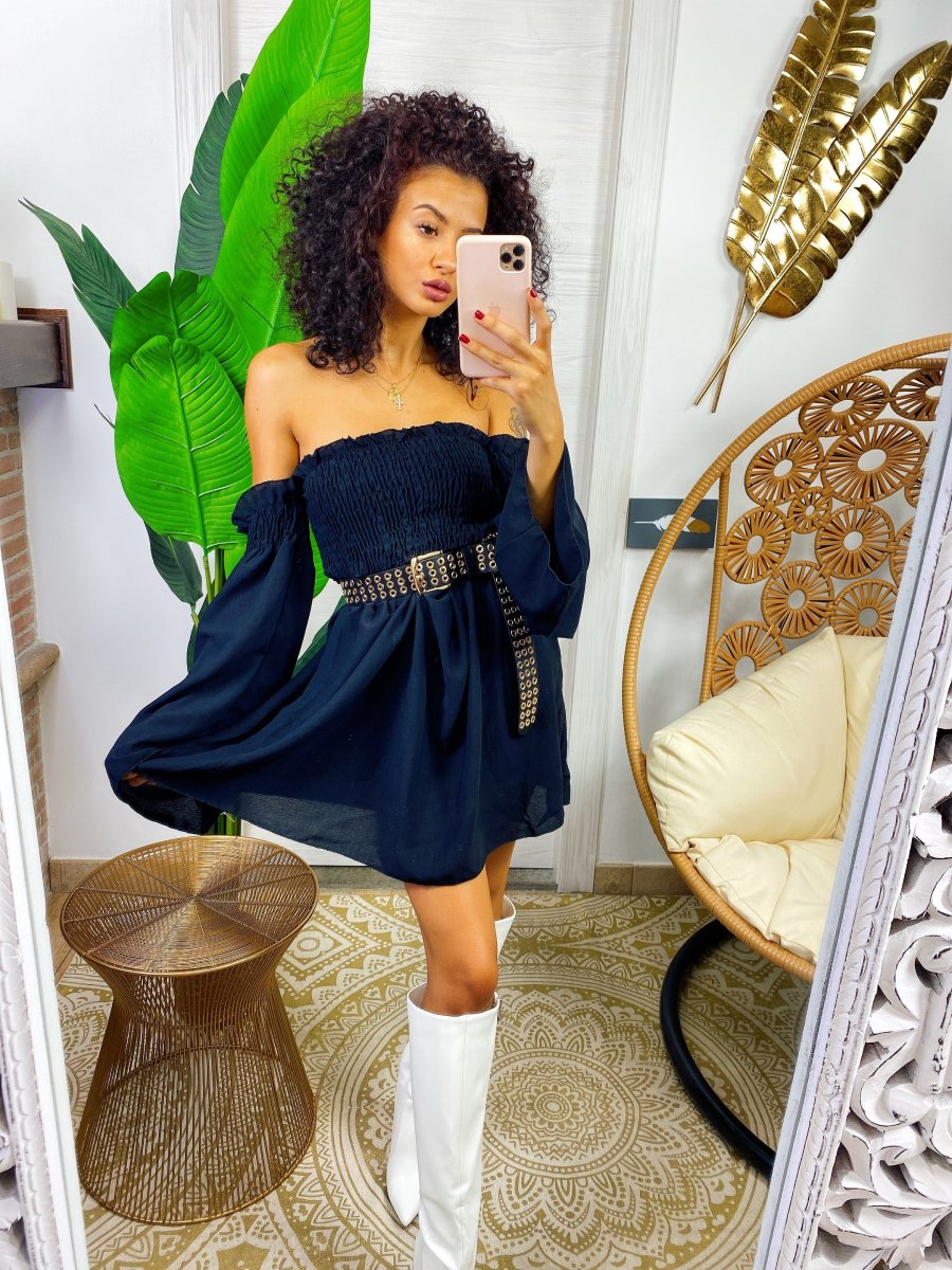Abito con scollo a barchetta e arricciatura manica lunga. Arricciatura sul busto . Vestibilità elasticizzata.