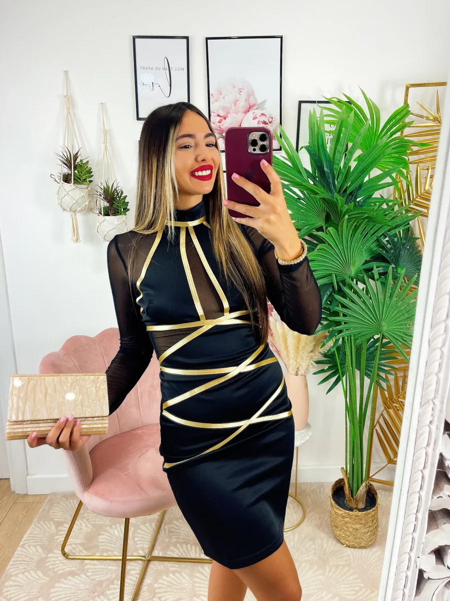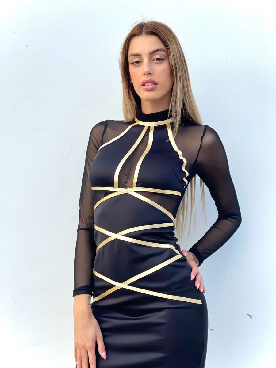 Abito con trasparenze e dettagli oro