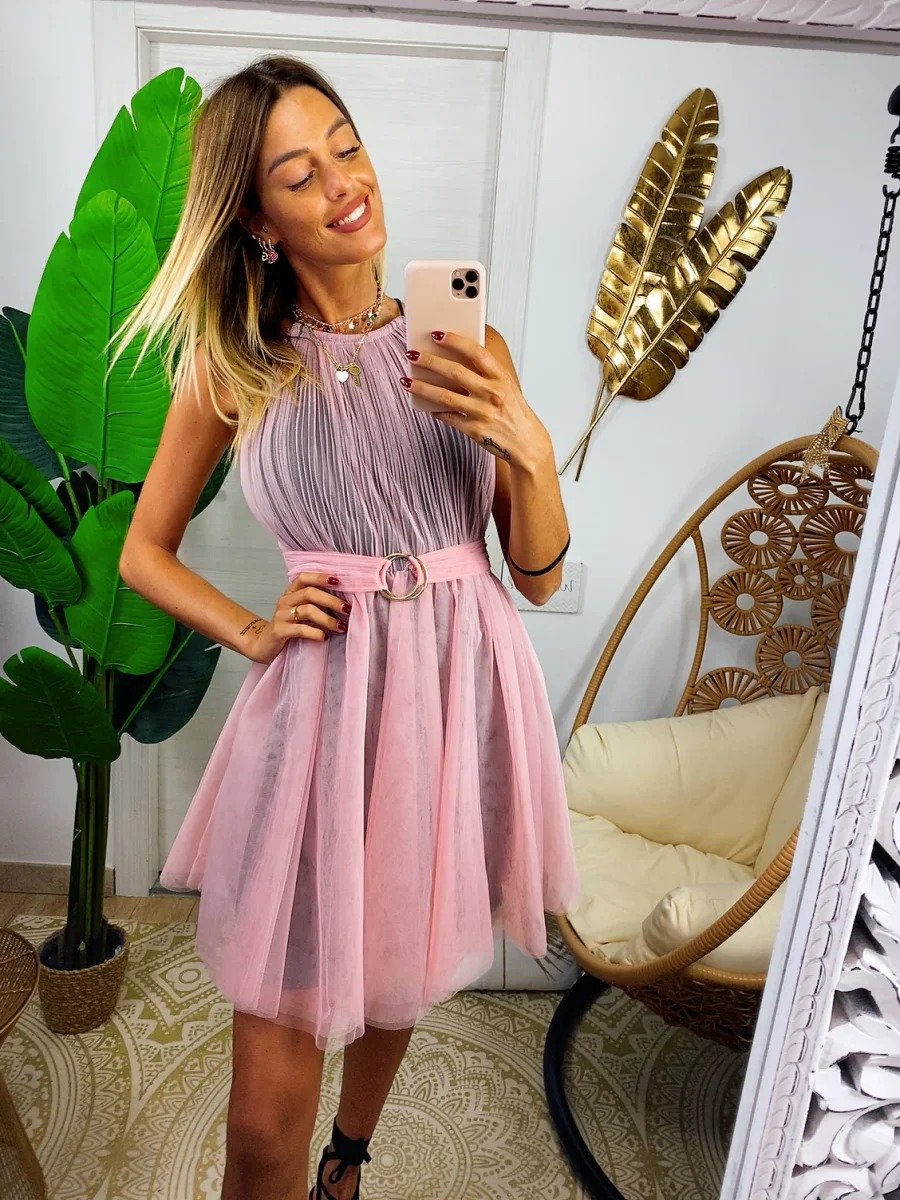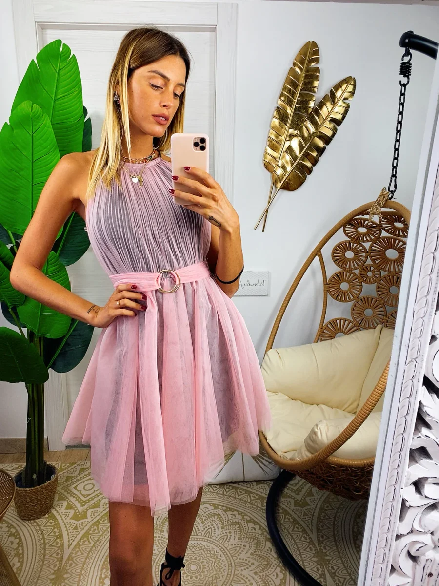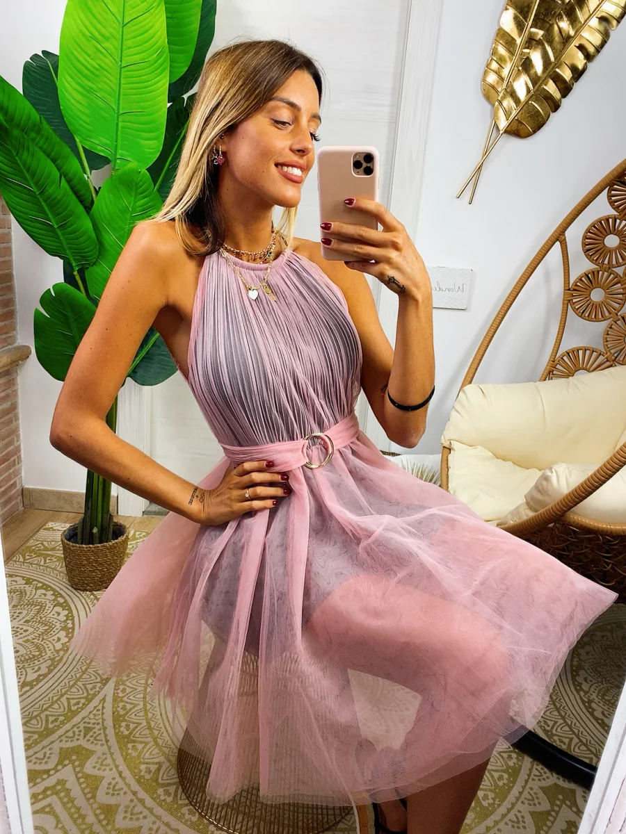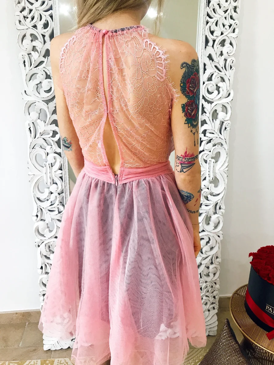 Abito da cerimonia Corto in tulle altissima qualità con occhiello al centro per stringere la vita e schiena leggermente aperta rifinita in pizzo.