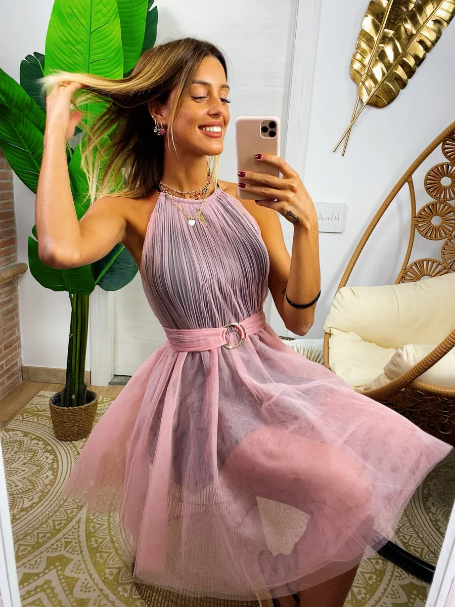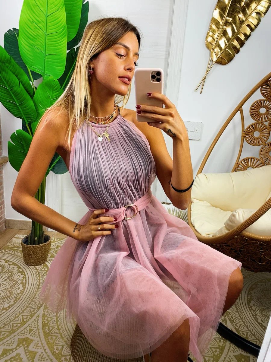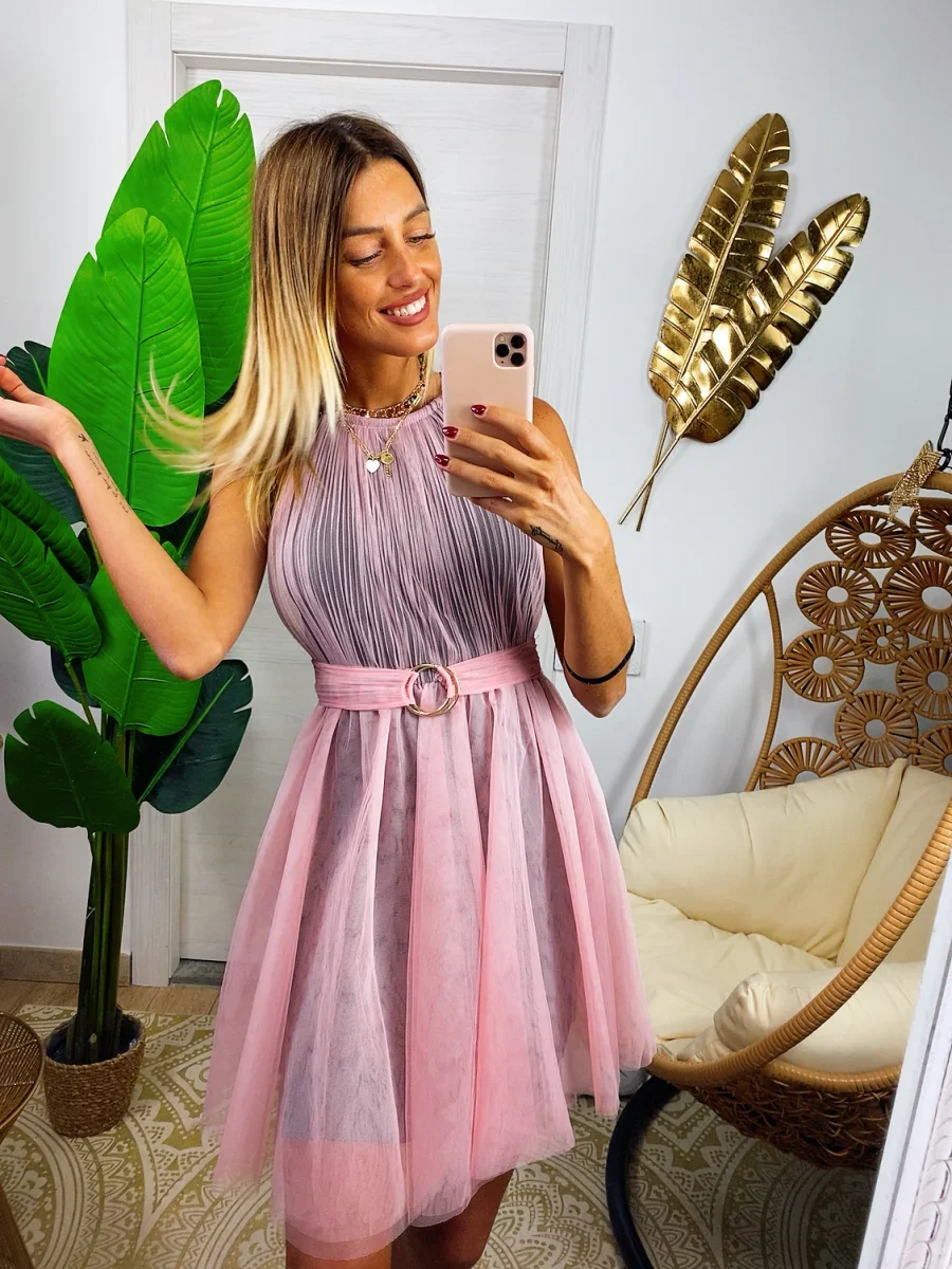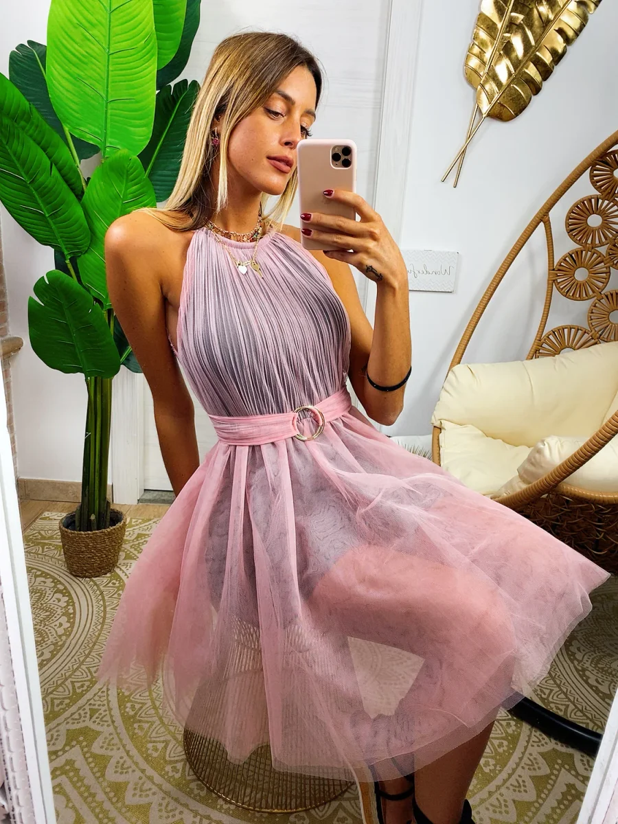 Abito da cerimonia Corto in tulle altissima qualità con occhiello al centro per stringere la vita e schiena leggermente aperta rifinita in pizzo.