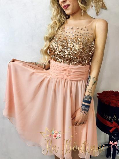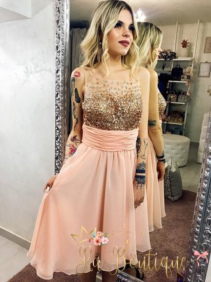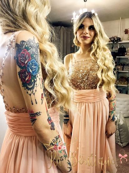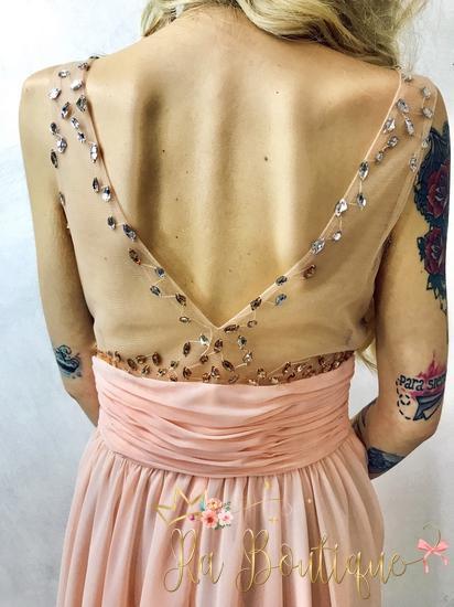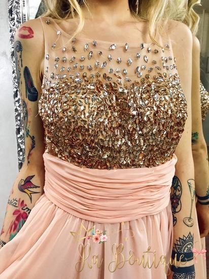 Abito da cerimonia di altissima qualità paillettes a cristallo incastonate sul petto che si presenta con trasparenze. Presenta coppe e zip posteriore con cintura in vita per rifinire e schiena aperta a V.