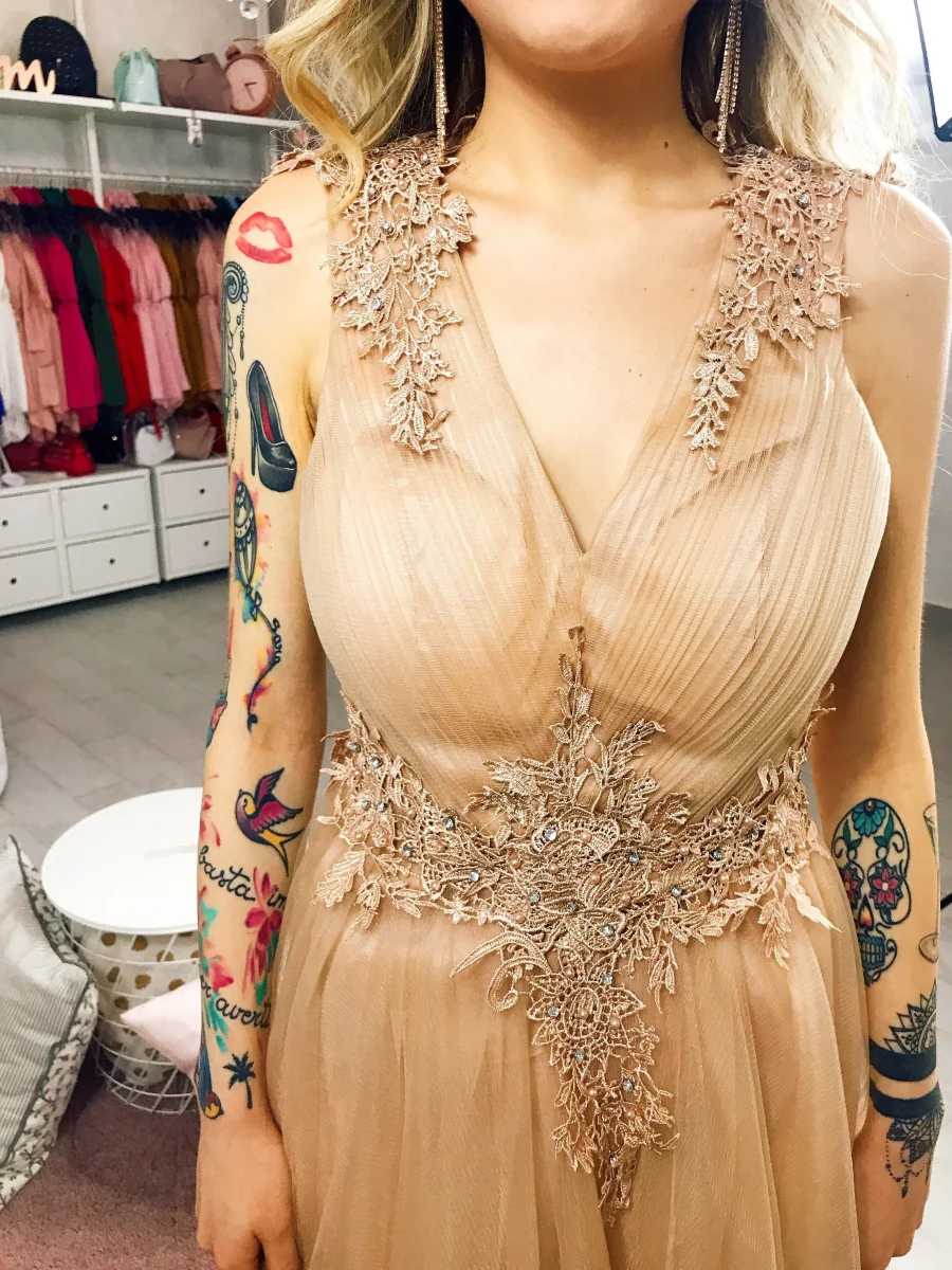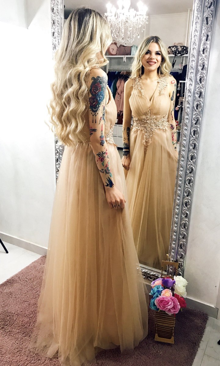 Abito da cerimonia di altissima qualità lungo con maxi gonna in tulle,smanicato con perle incastonate sulle spalle e sul girovita accompagnate da pizzo. Si presenta con schiena aperta perle sulle spalle decorate da pizzo con zip posteriore.