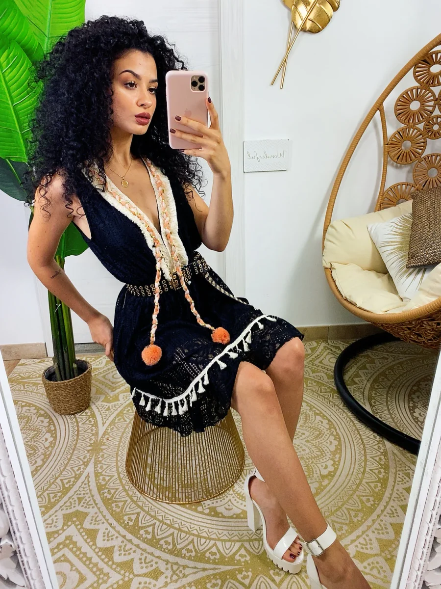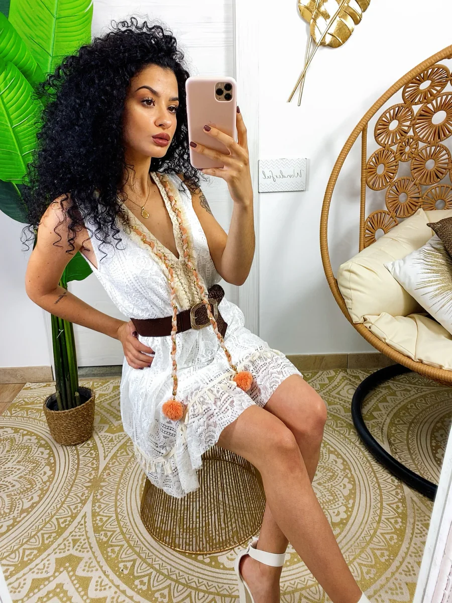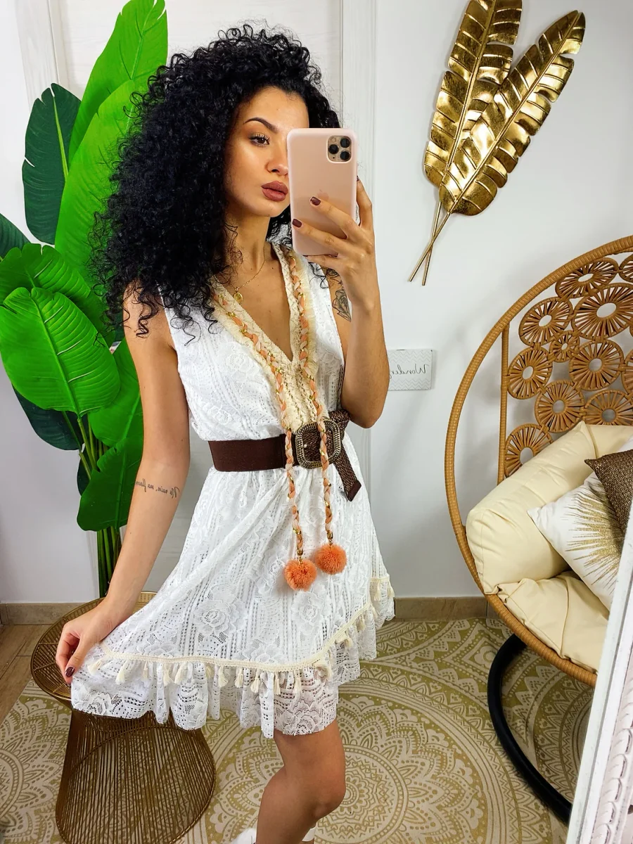 Abito in pizzo elasticizzato, fodera inclusa. Pompom morbidi in caduta
