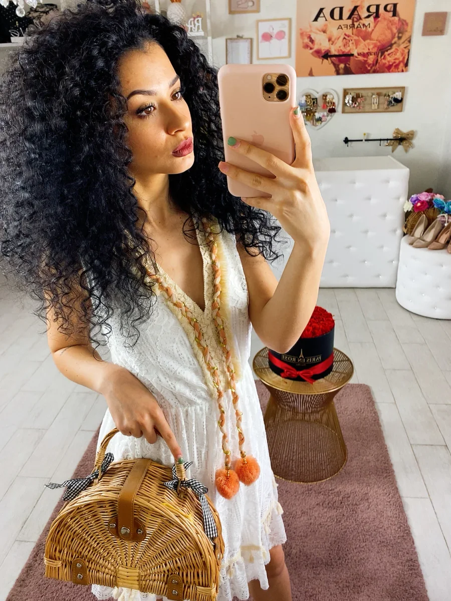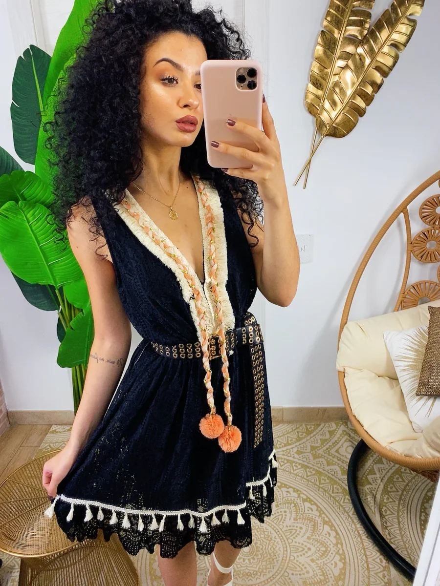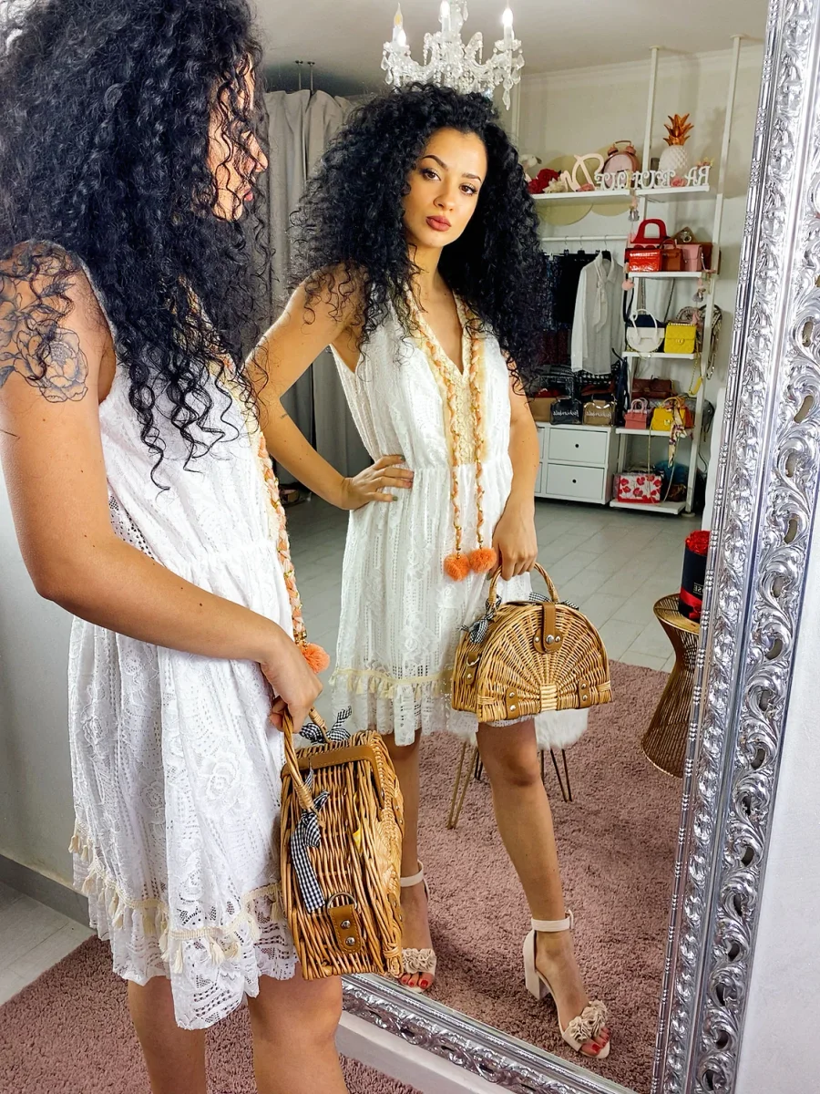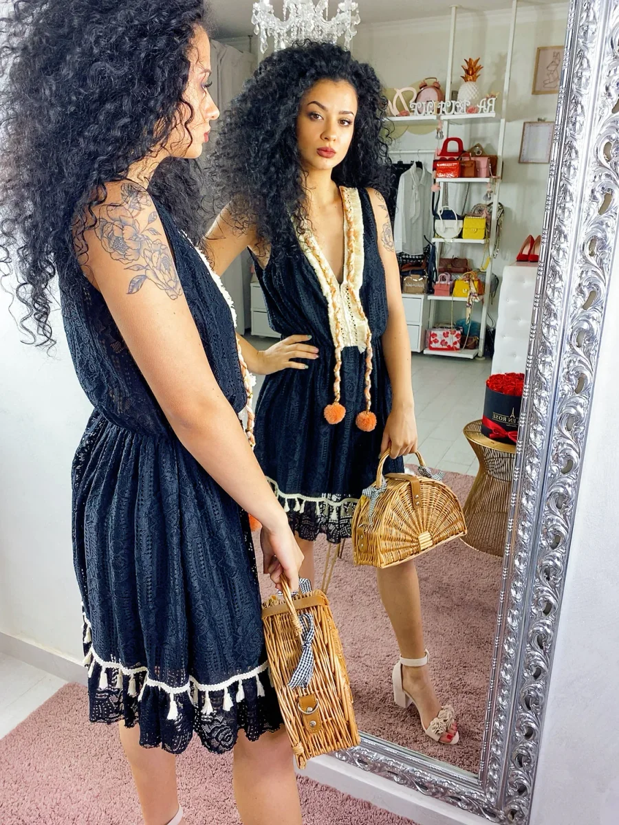 Abito in pizzo elasticizzato, fodera inclusa. Pompom morbidi in caduta