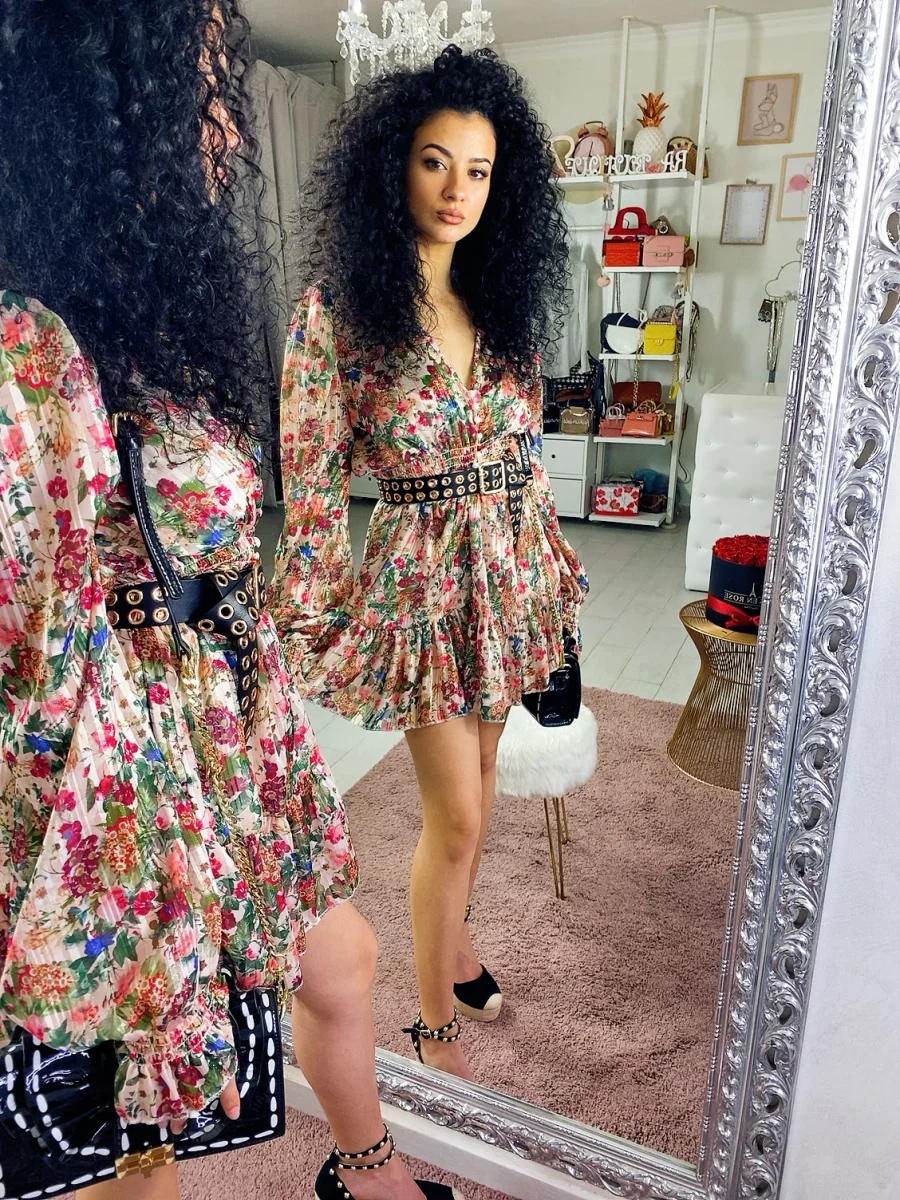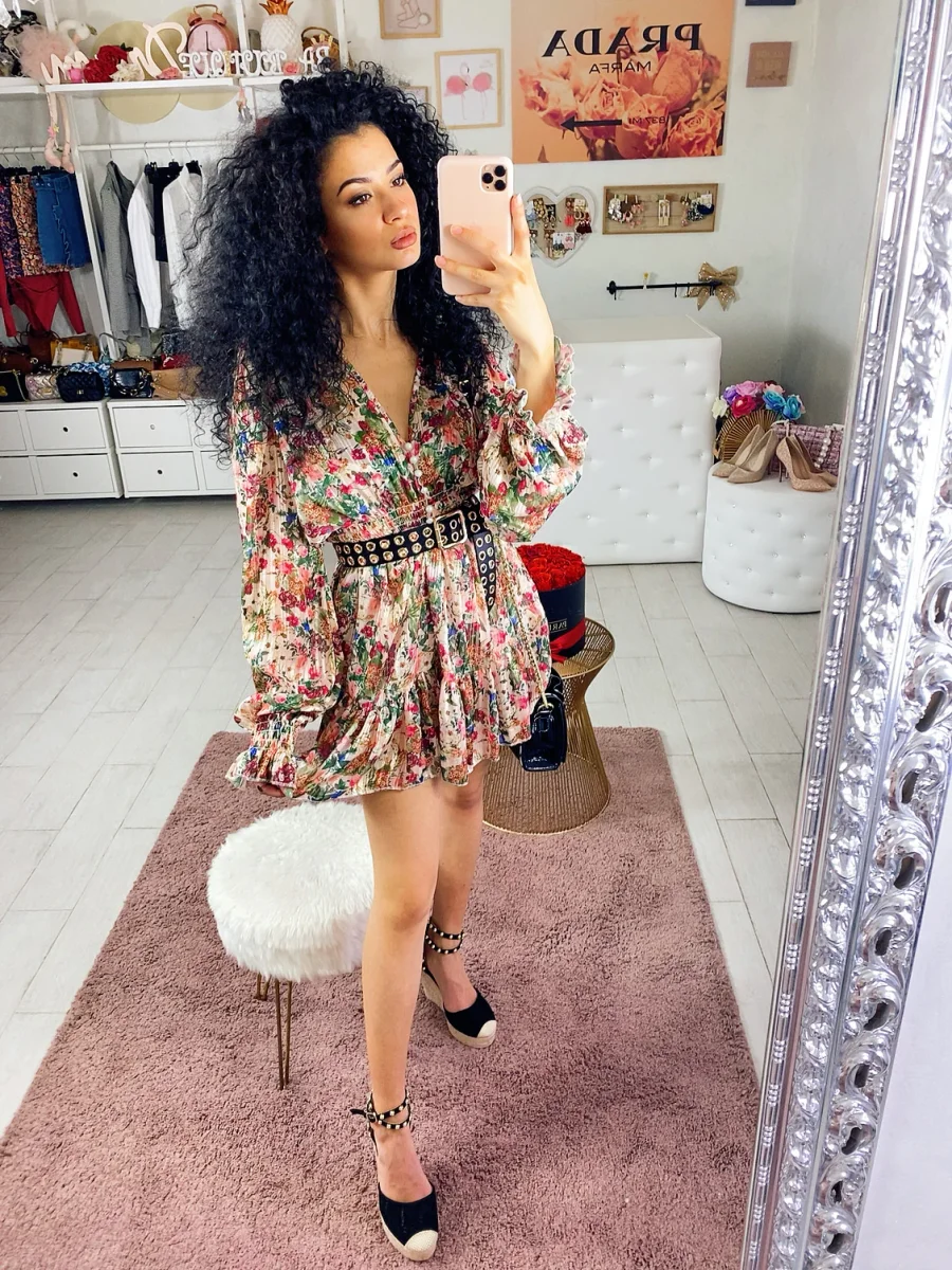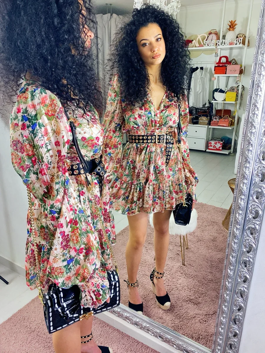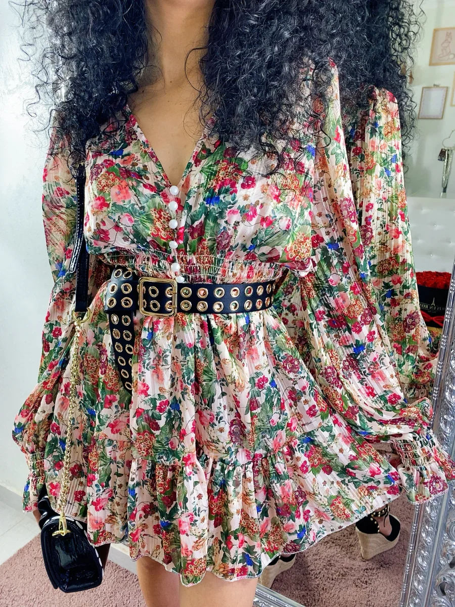 Abito a manica lunga in tessuto glitterato. Arricciato in vita e bottoncini neri. Perfetto per le serate estive