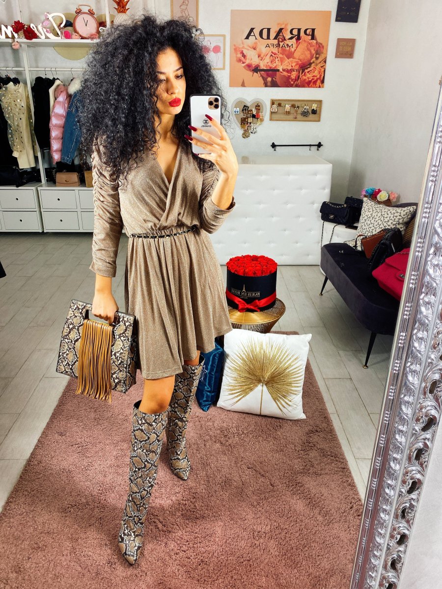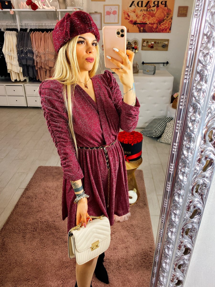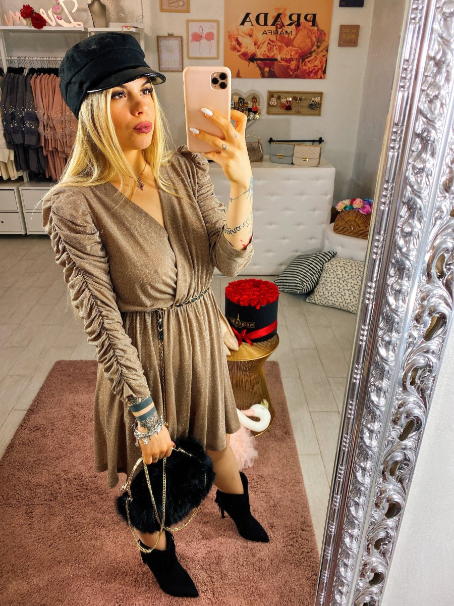 Abito in tessuto glitterato con manica arricciata. Tessuto elasticizzato. Cinturino incluso