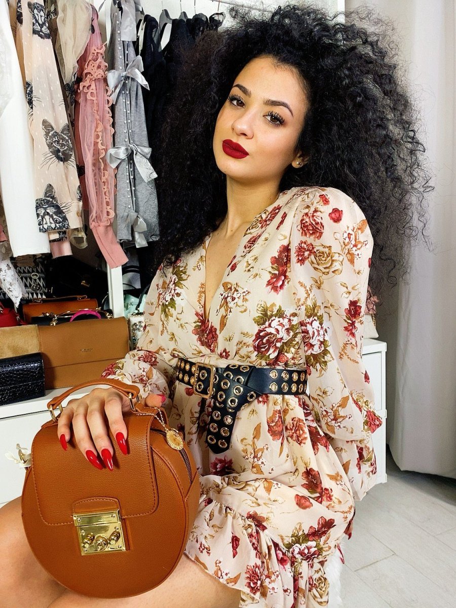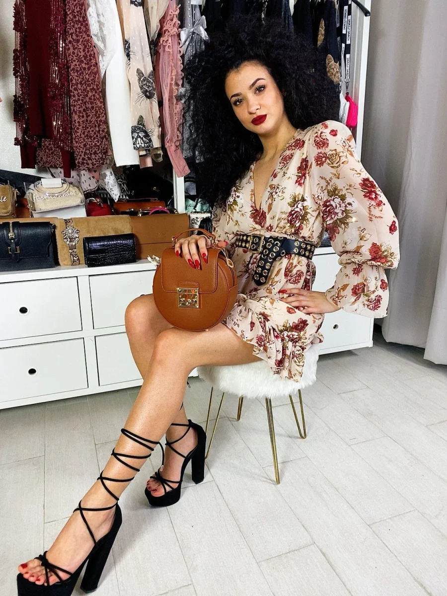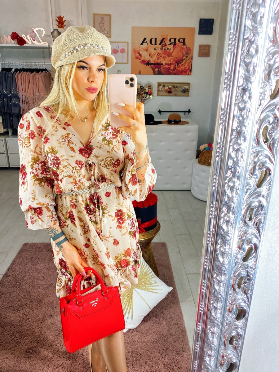 Abito fluido con stampa a fiori. Laccetto sotto seno e mini rouge nel fondo