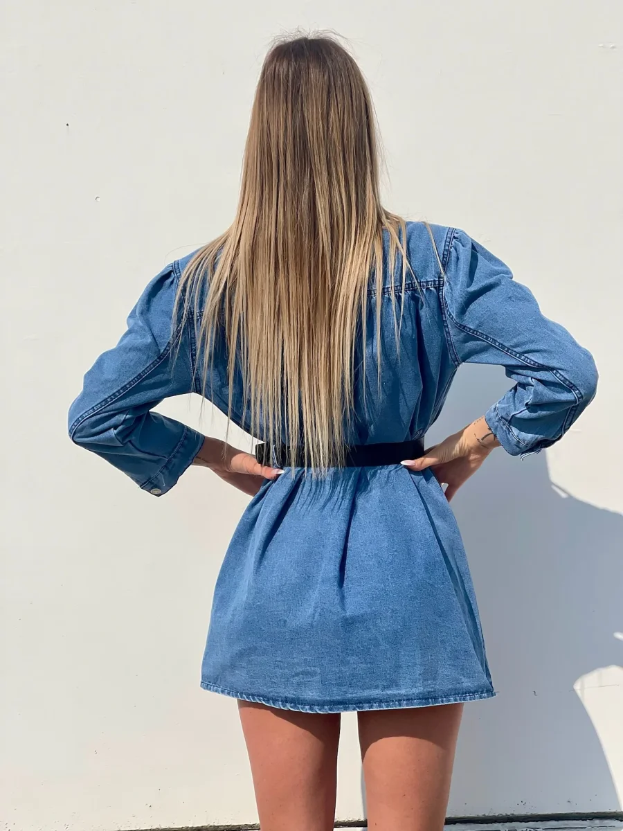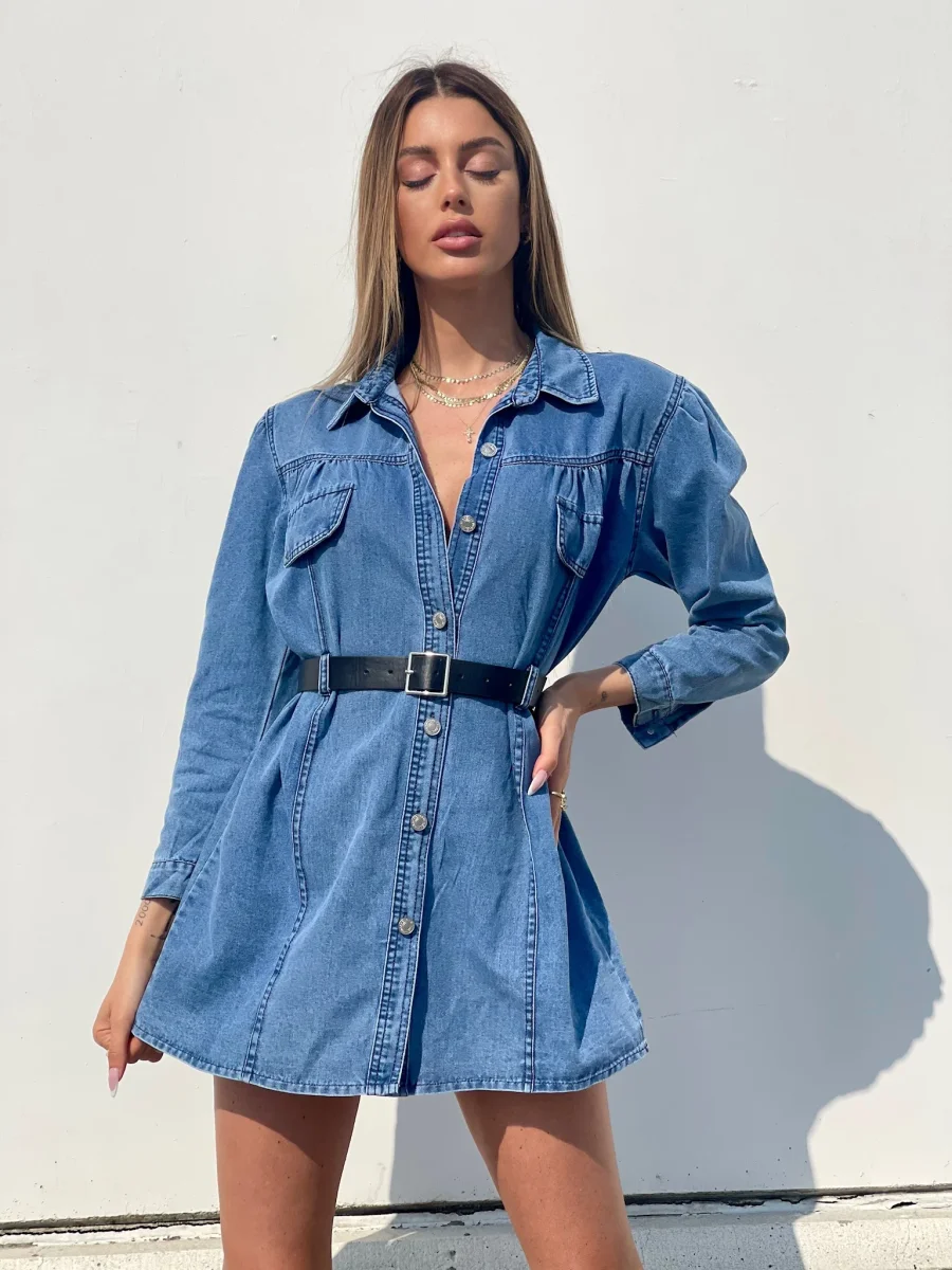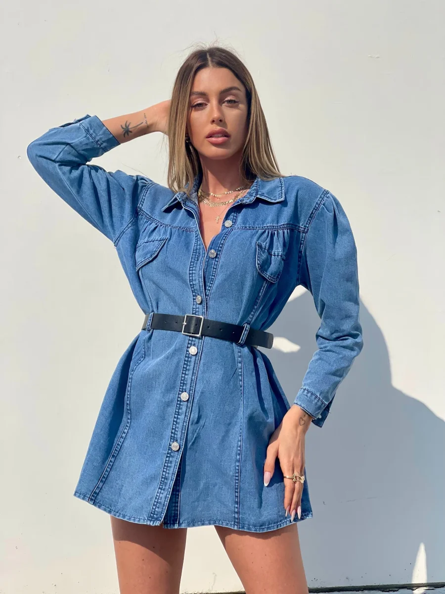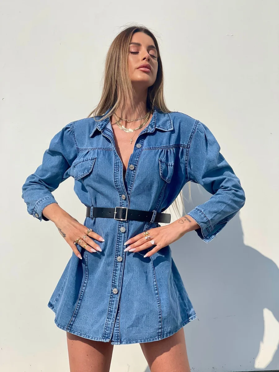 Maxi camicione a manica lunga e spalline bombate. Cintura nera inclusa nel capo