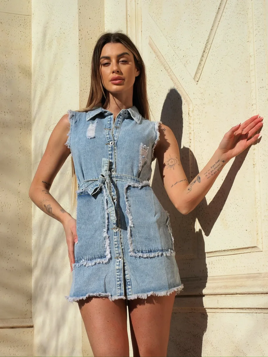 Mini dress in jeans effetto sfrangiato con cintura inclusa