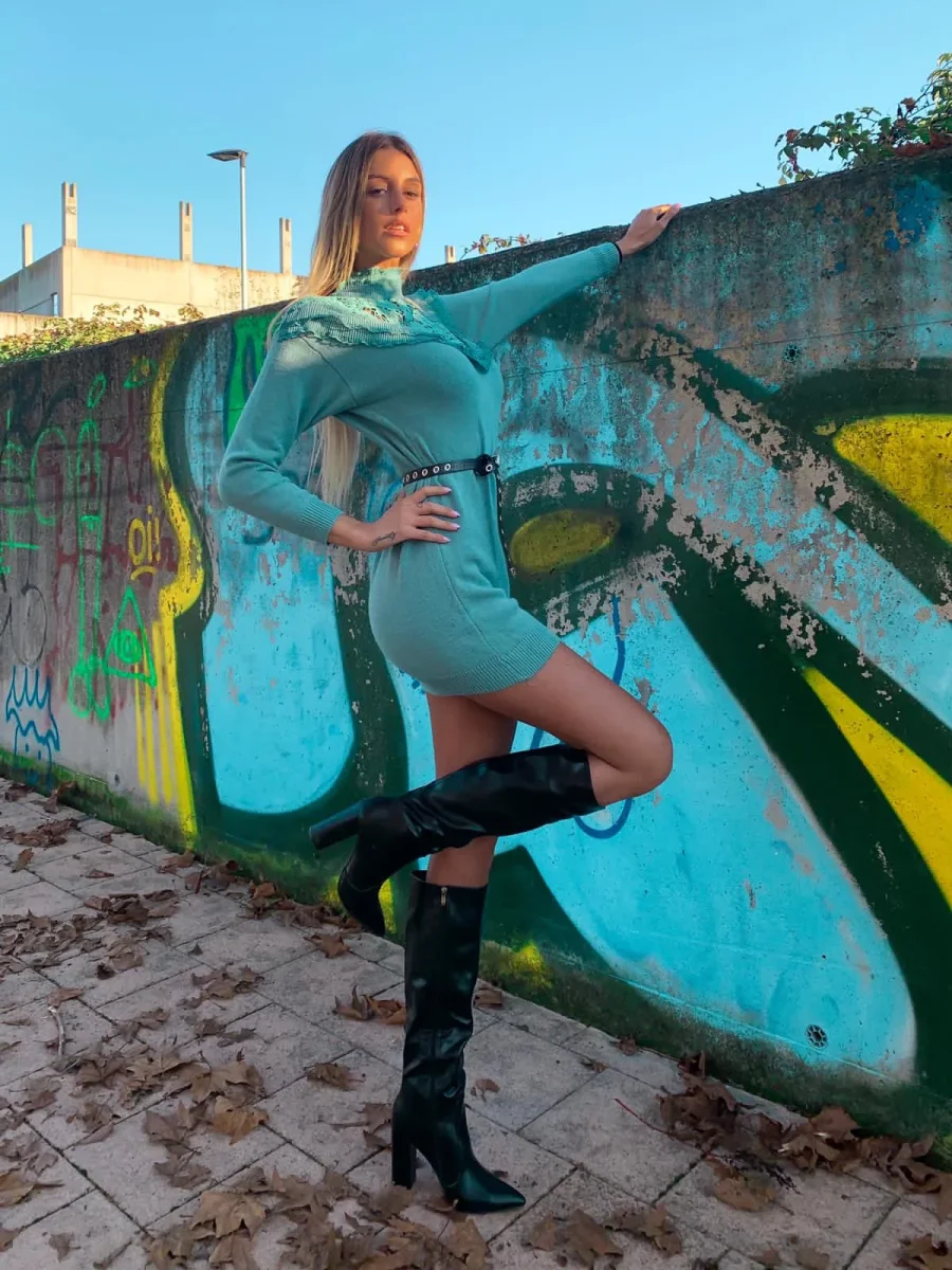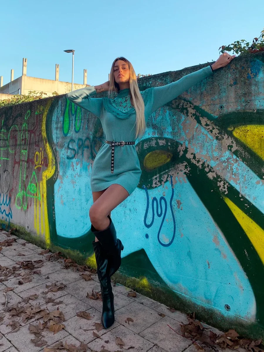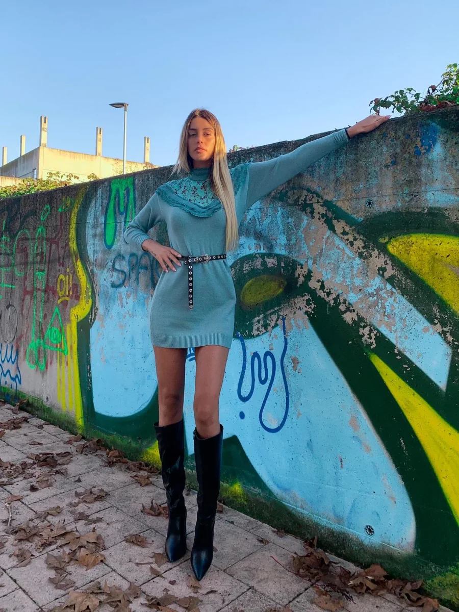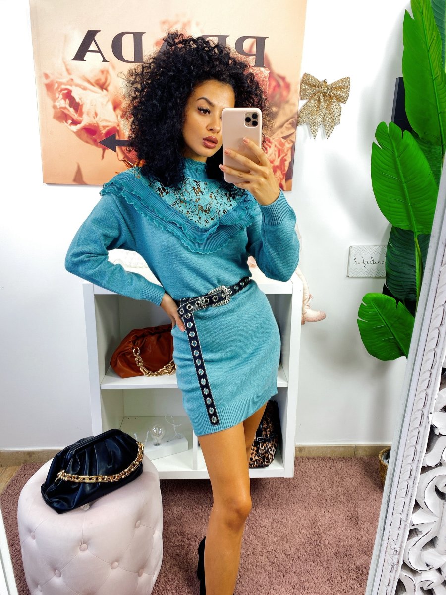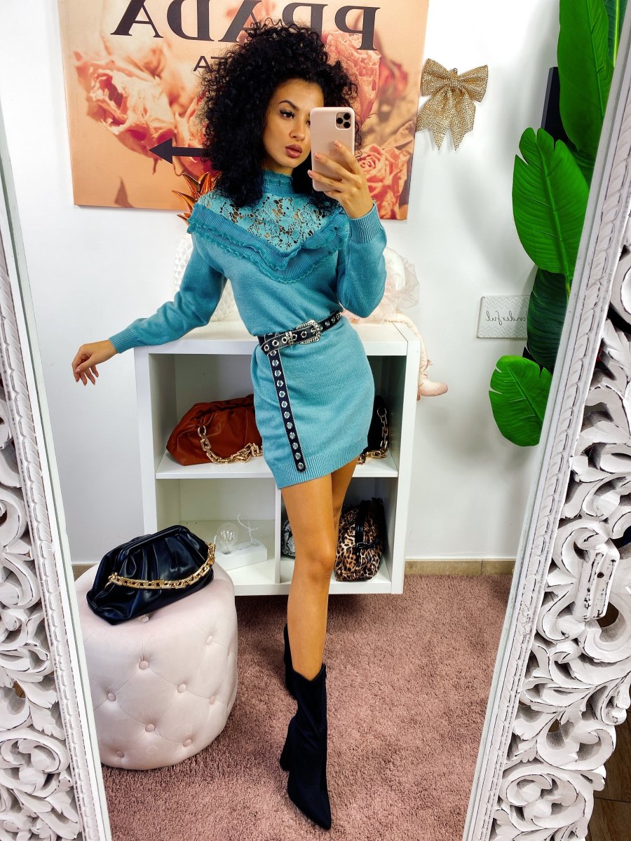 abito a manica lunga in lana, tessuto alta qualità rifinito da pizzo e Rouge con collo leggermente alto. Puramente invernale da abbinare con una bella cintura o marsupio