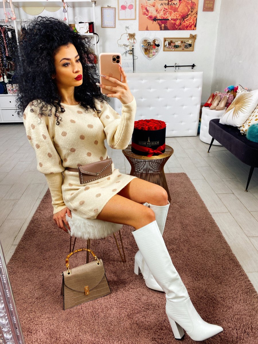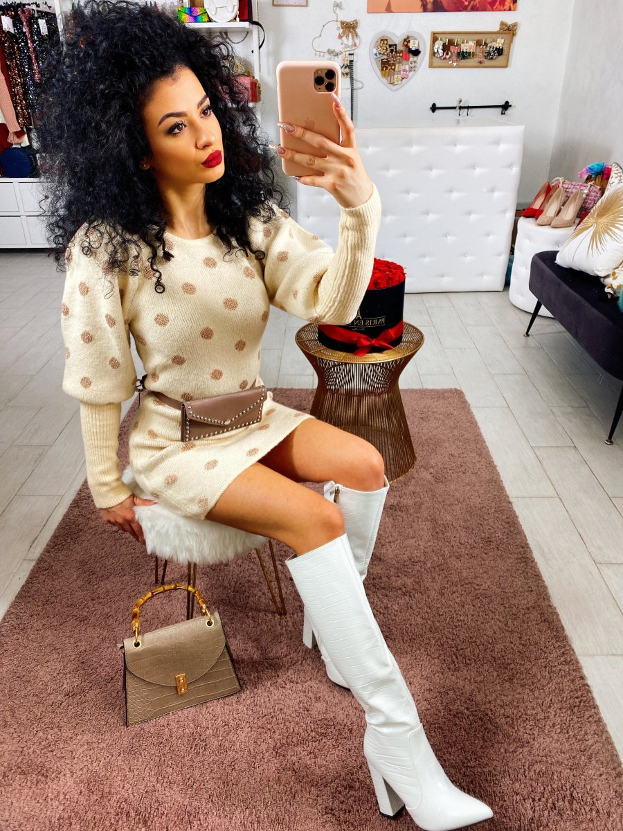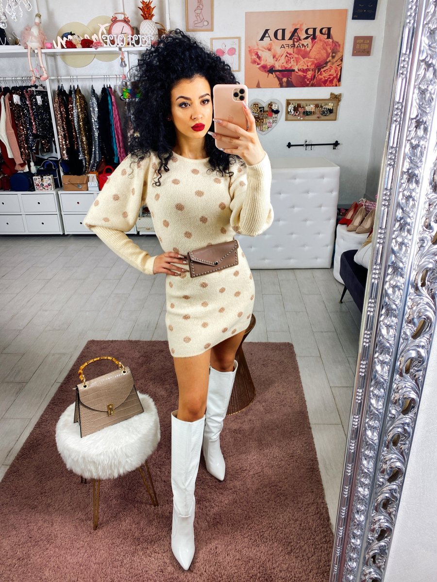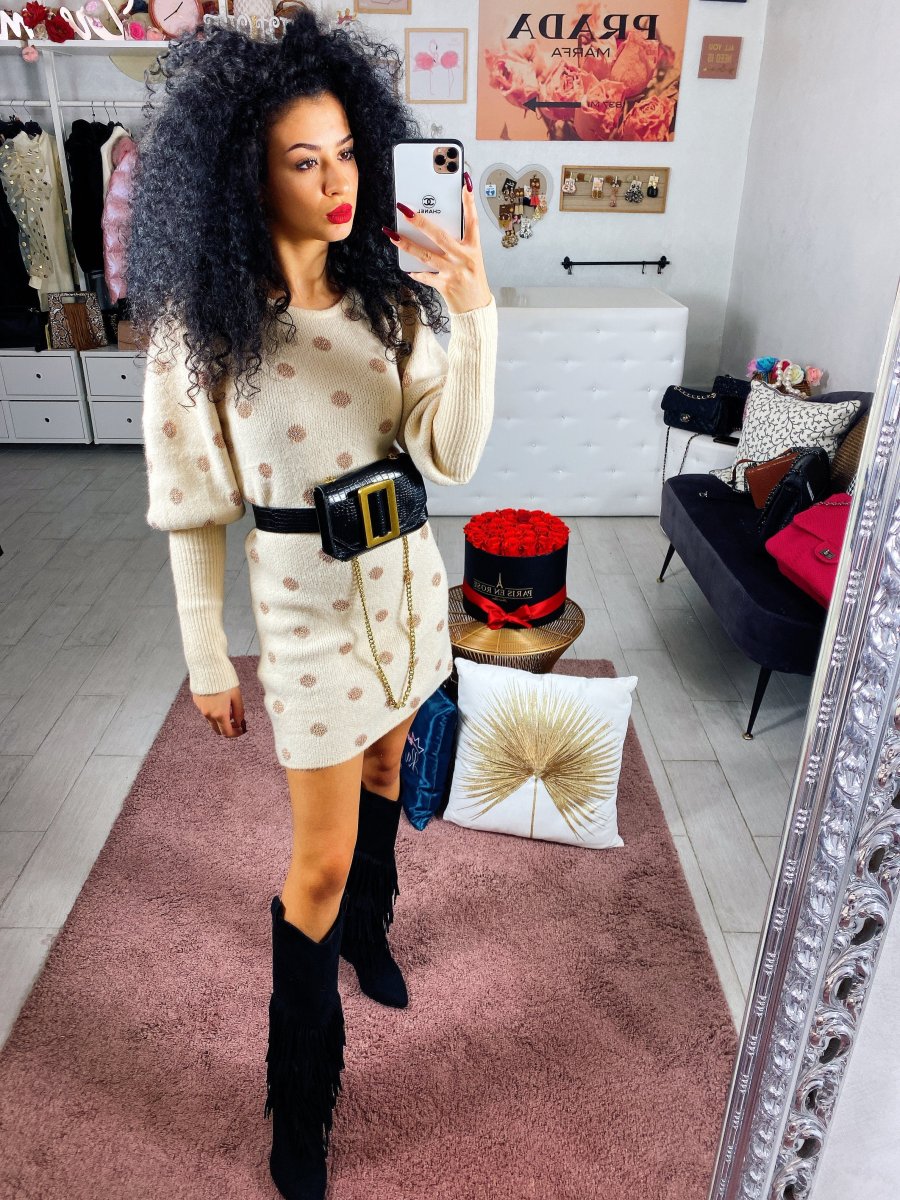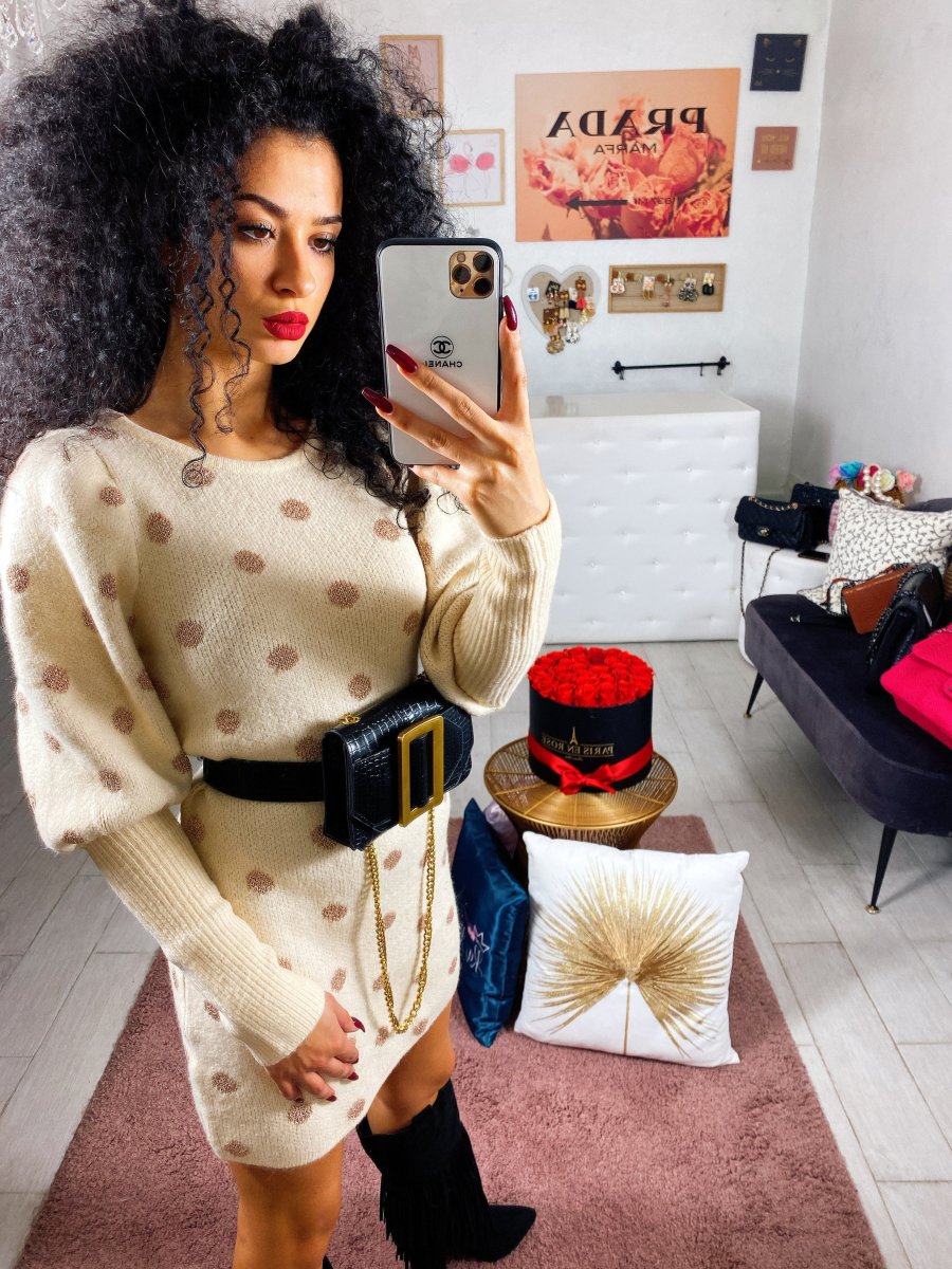 Abito in lana con maxi pois oro. Tessuto aderente ma morbido.