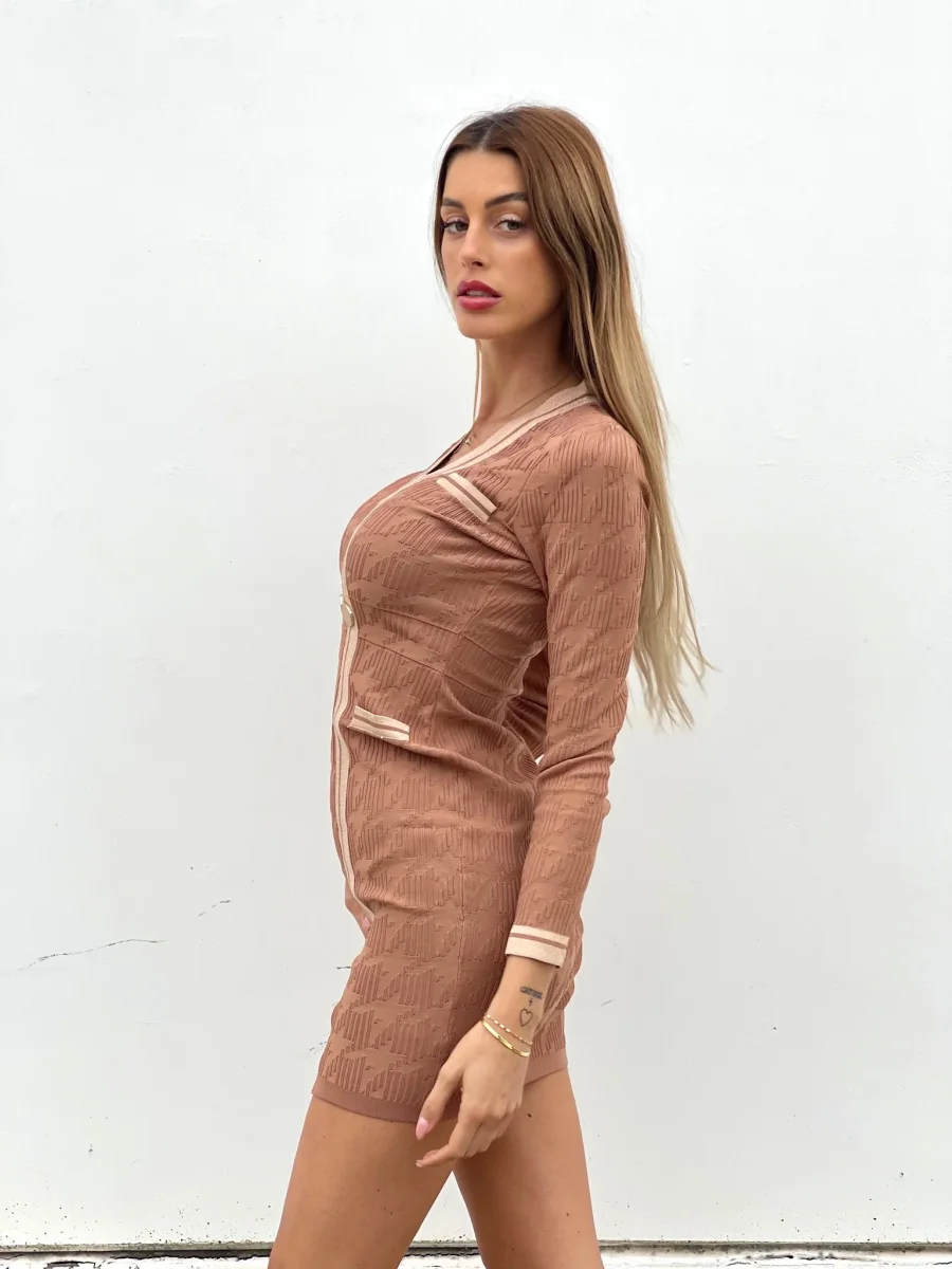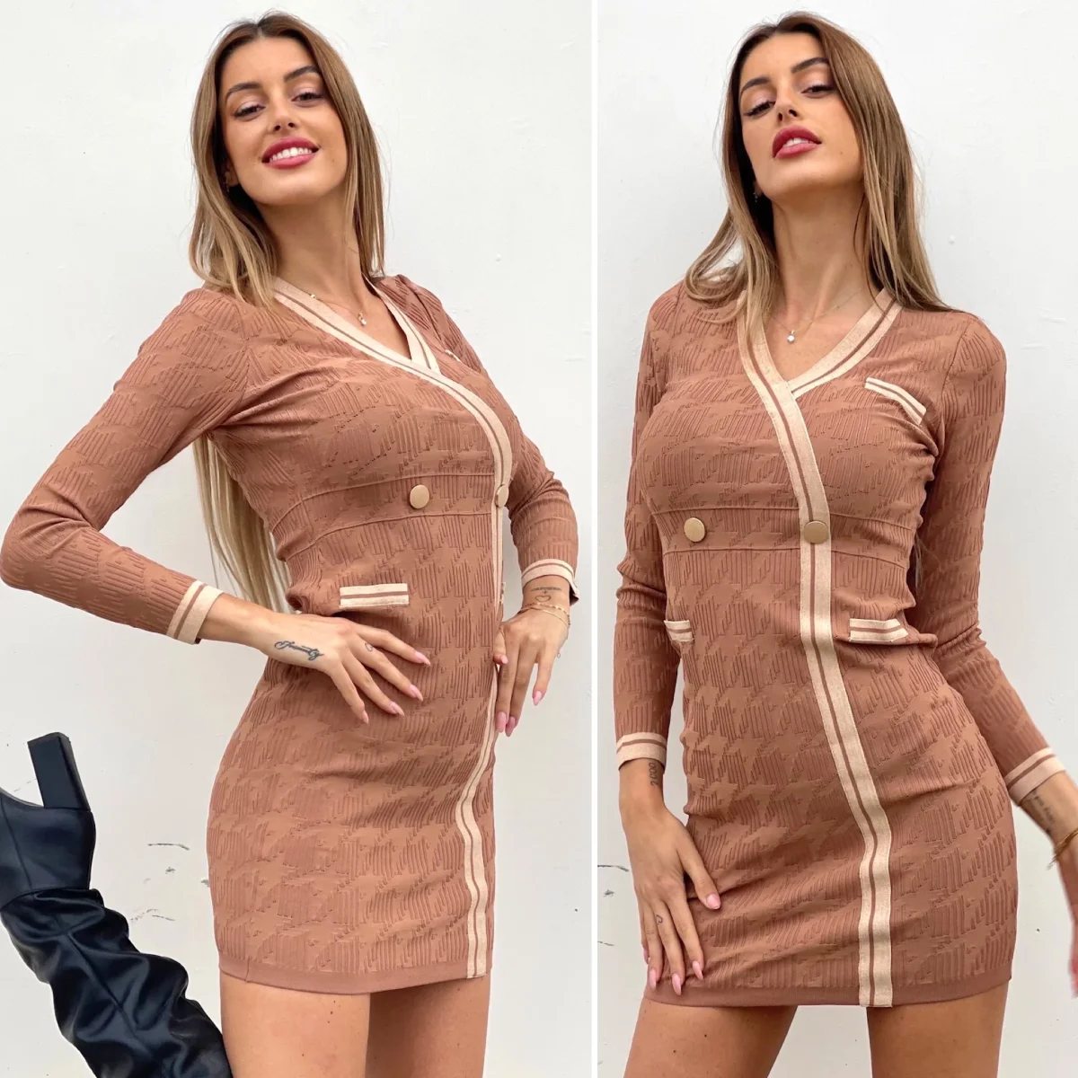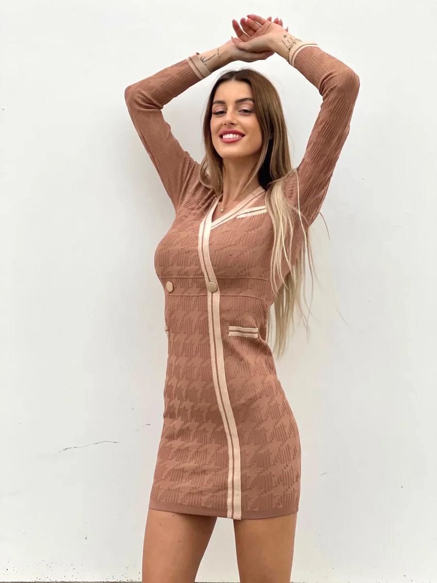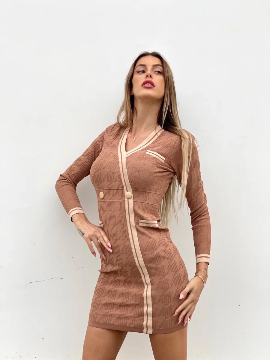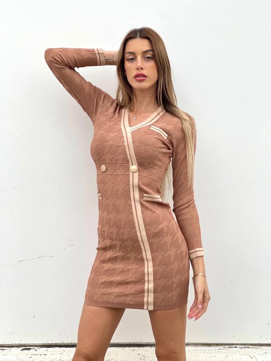 Abito in maglia aderente in trama pied de poule con chiusura a bottoni oro. Elegante e super sexy