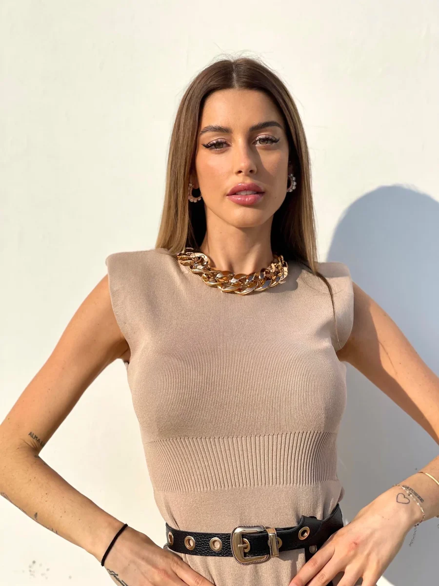 Abito in maglia beige con spalline rinforzate e catena sul collo.