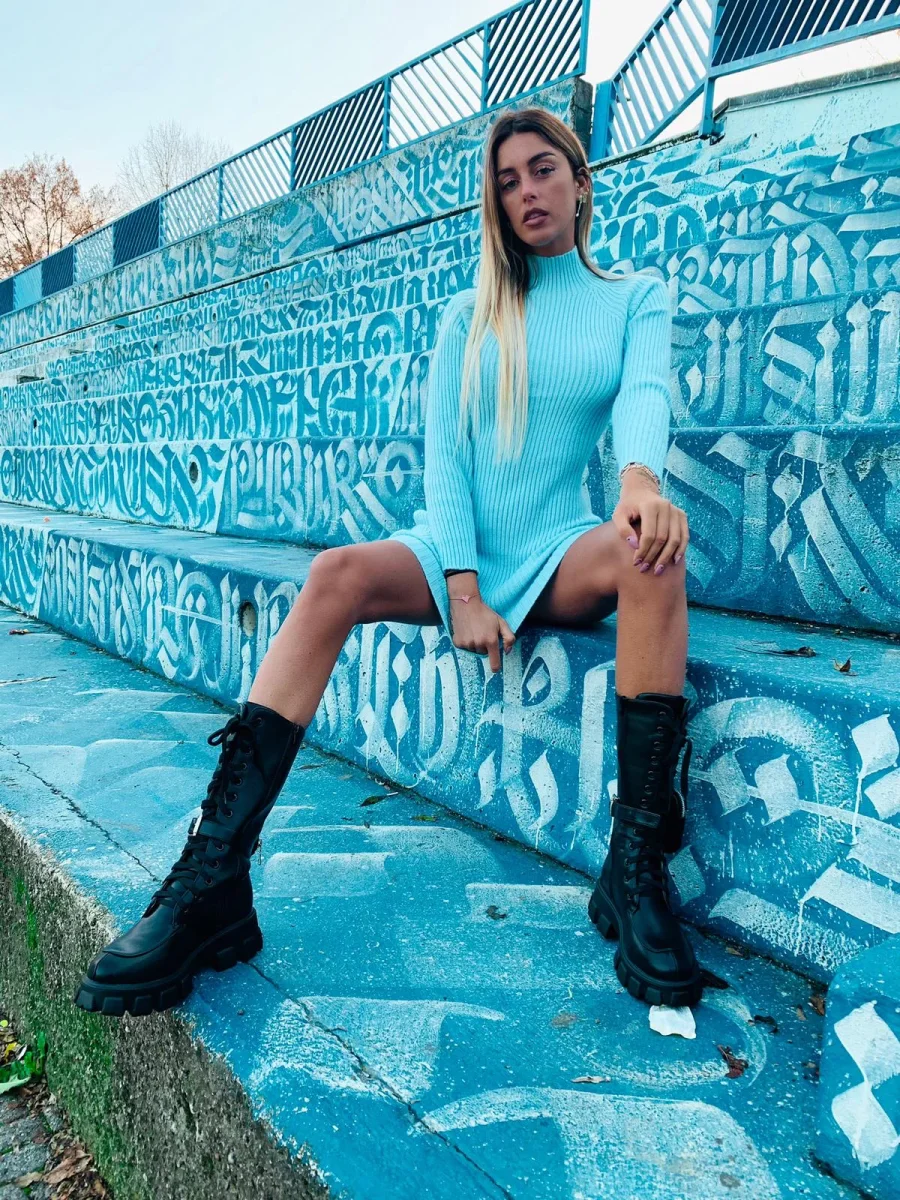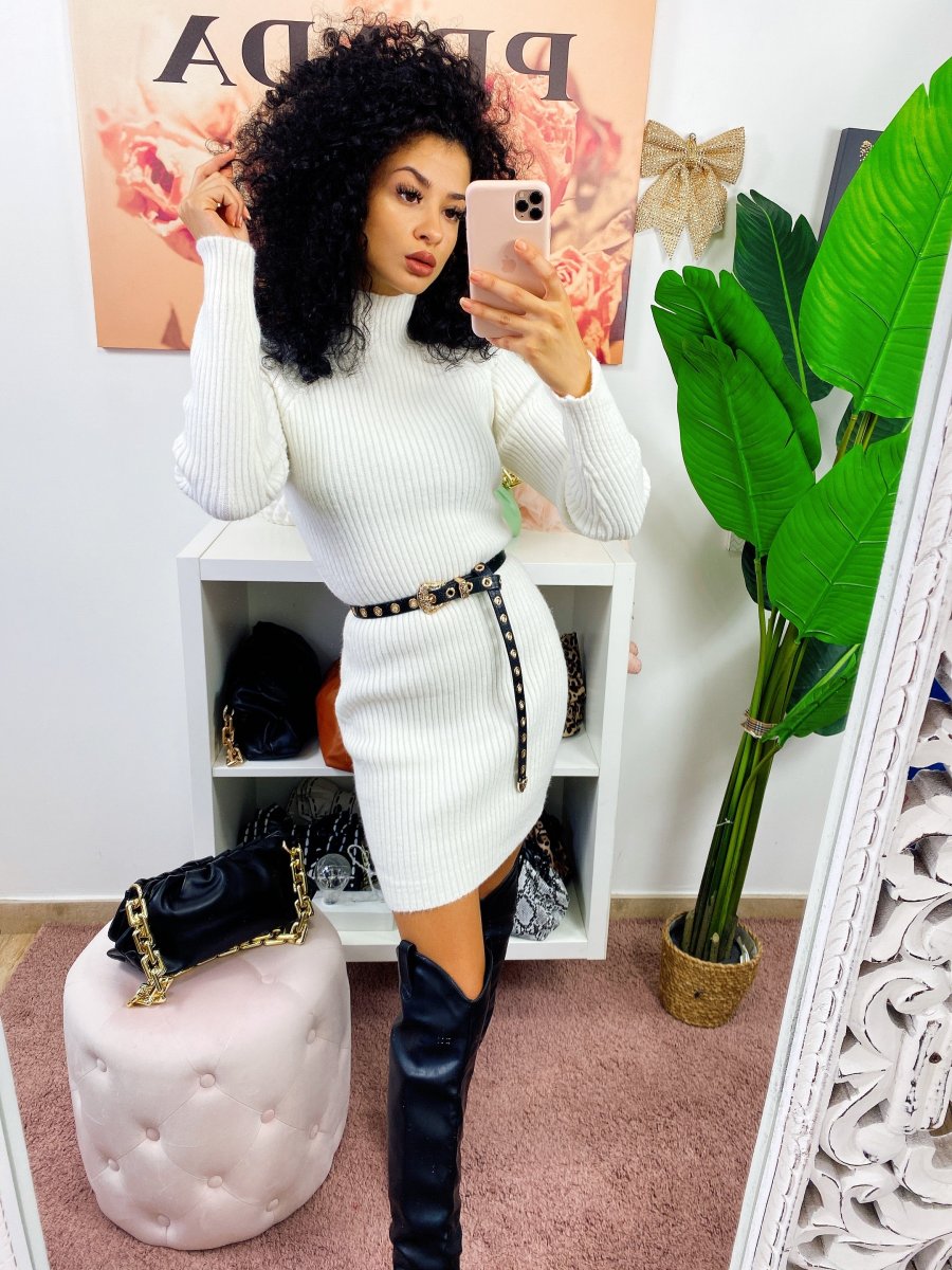 Semplice abito in lana rasata con collo alto e incrocio sulla schiena/