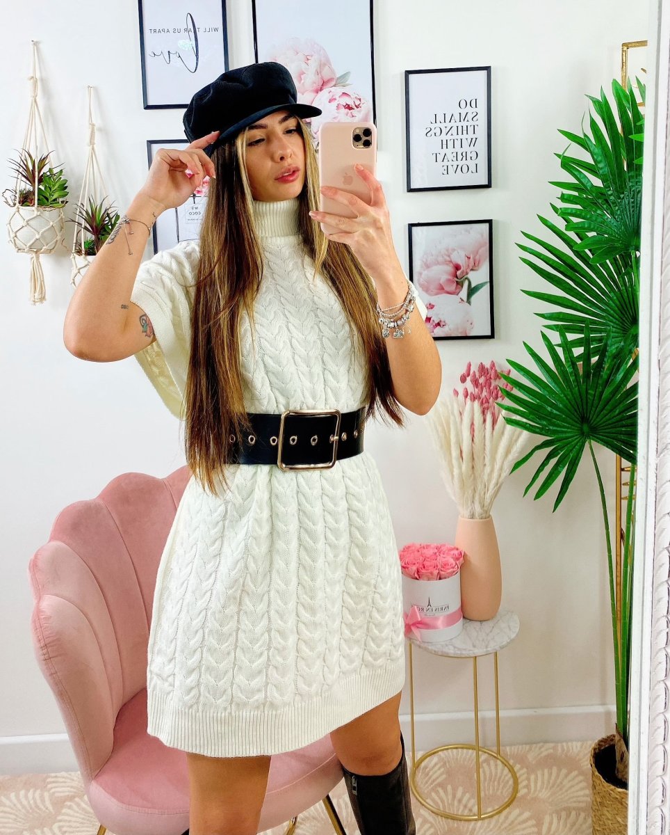 Abito o maxi maglione in tessuto caldo e morbido smanicato e trama a trecce.