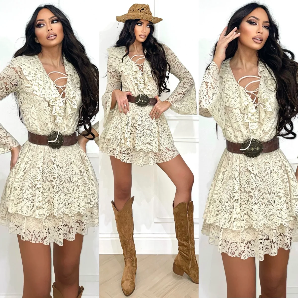 Abito in pizzo a balze trasparente con fodera interna, laccio al collo regolabile