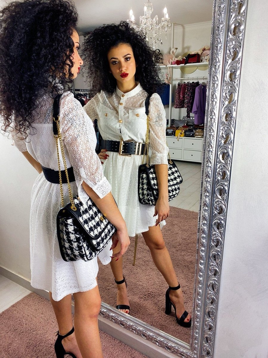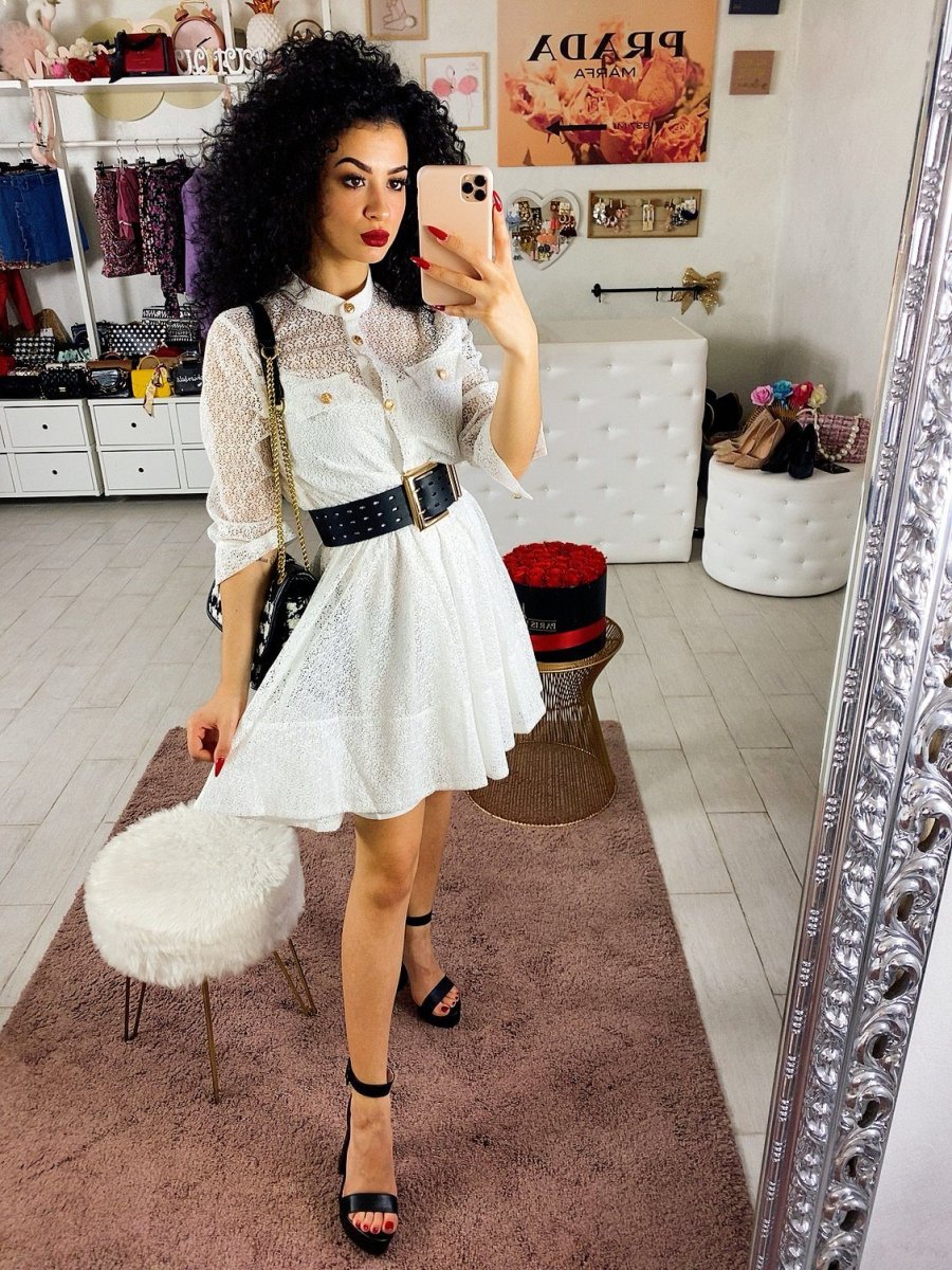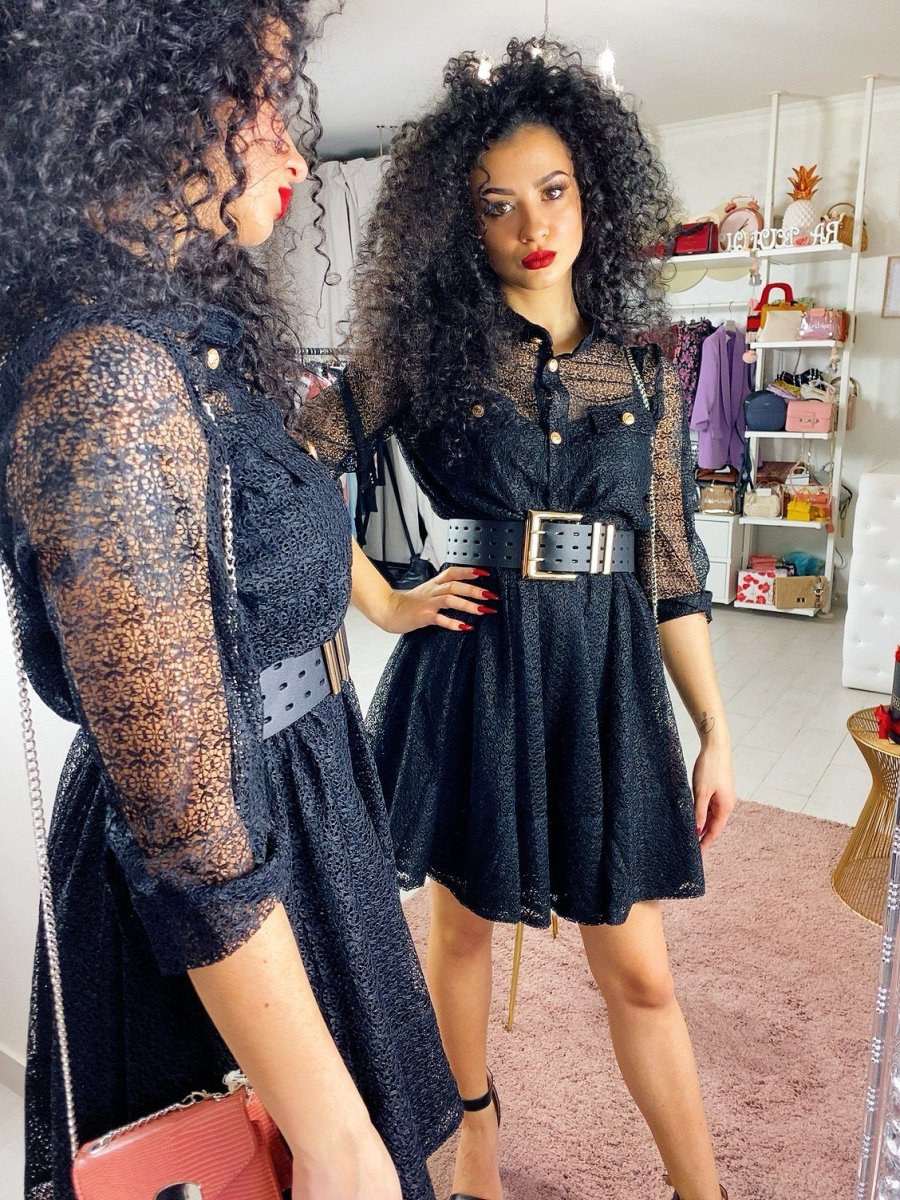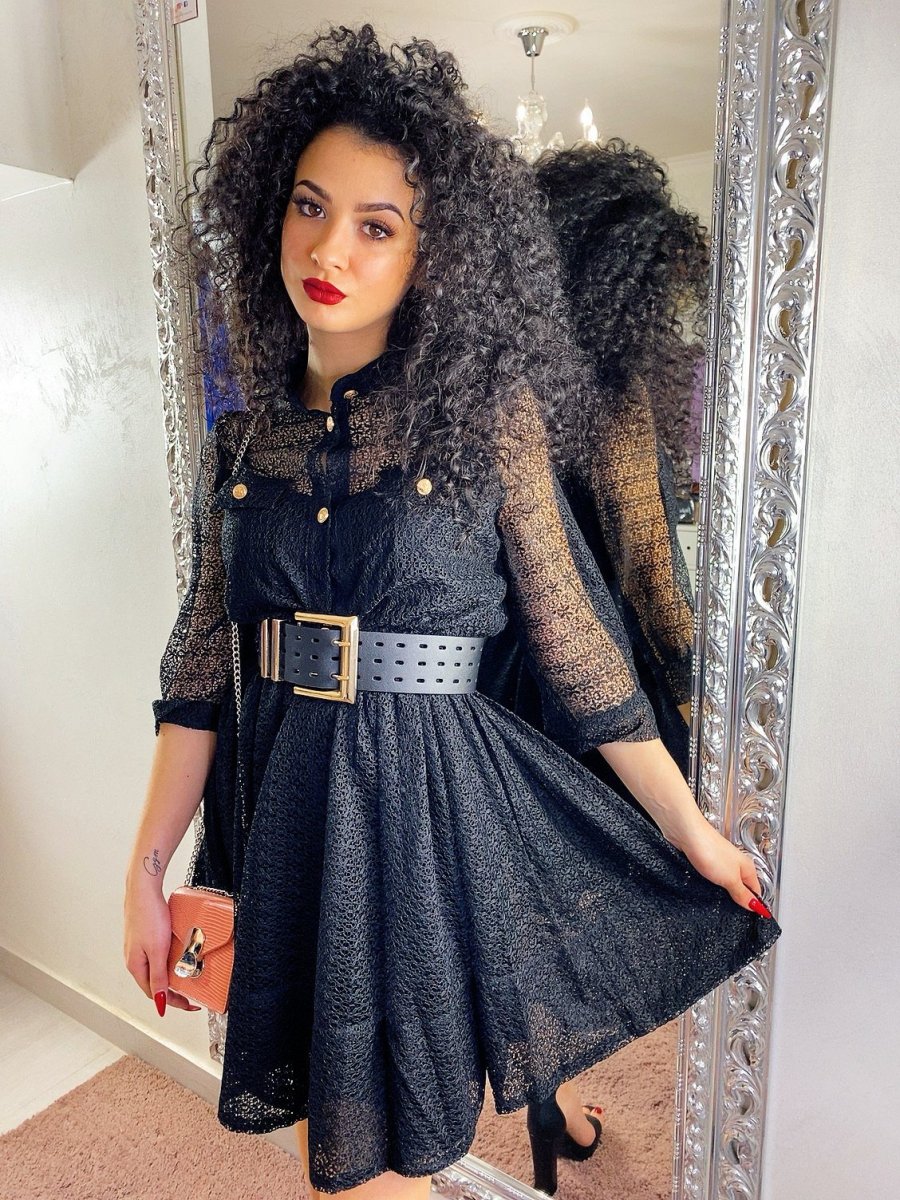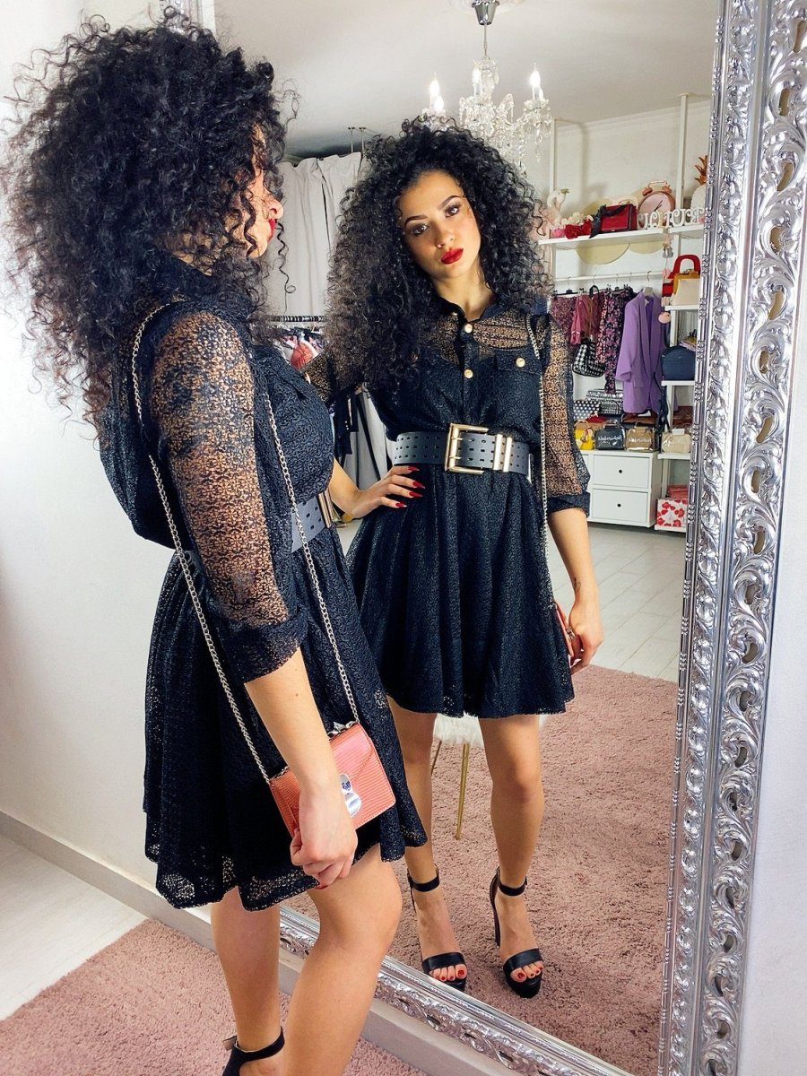 Elegantissimo abito in pizzo foderato con gonna a ruota. Bottoni oro come dettaglio.