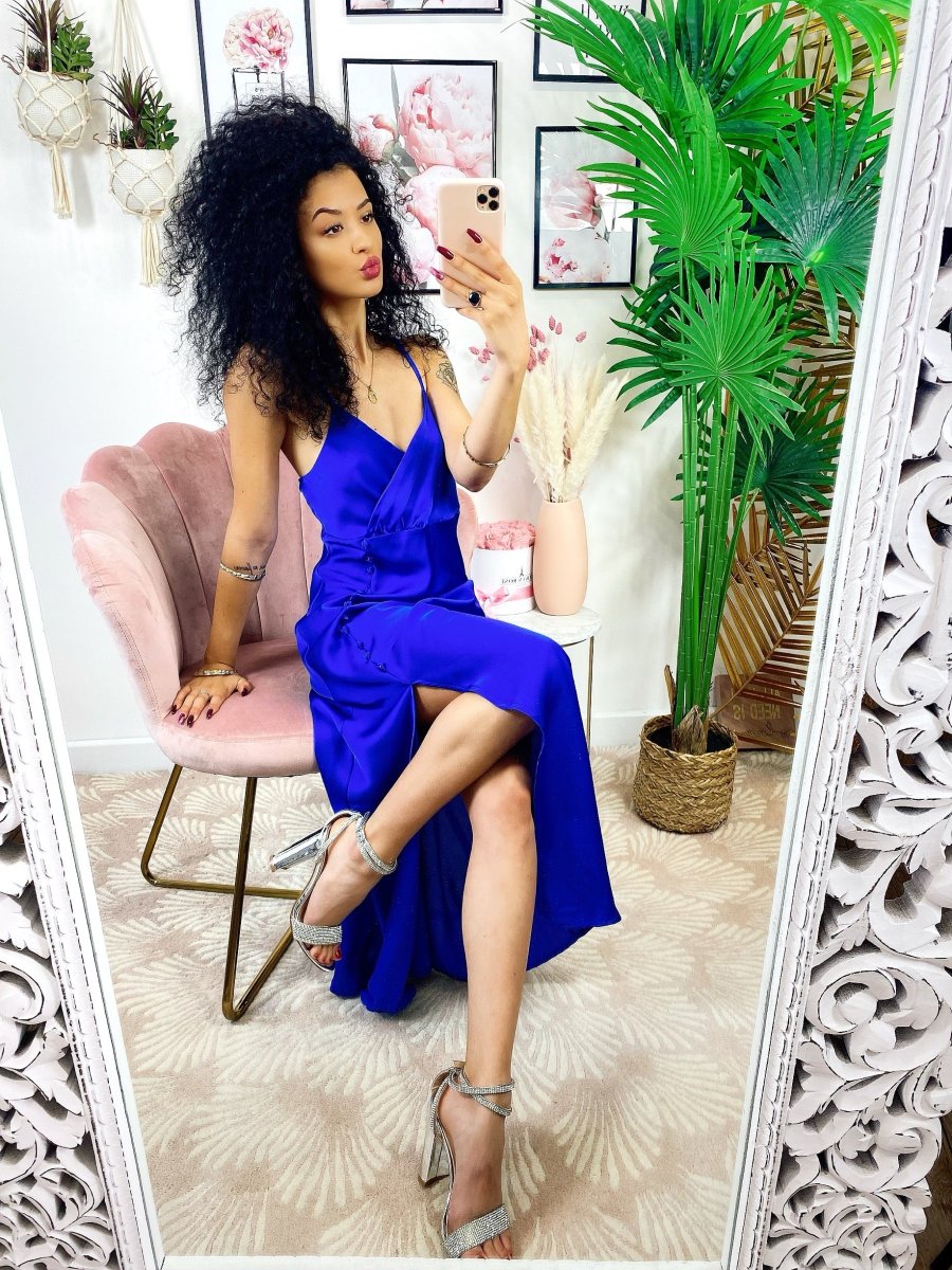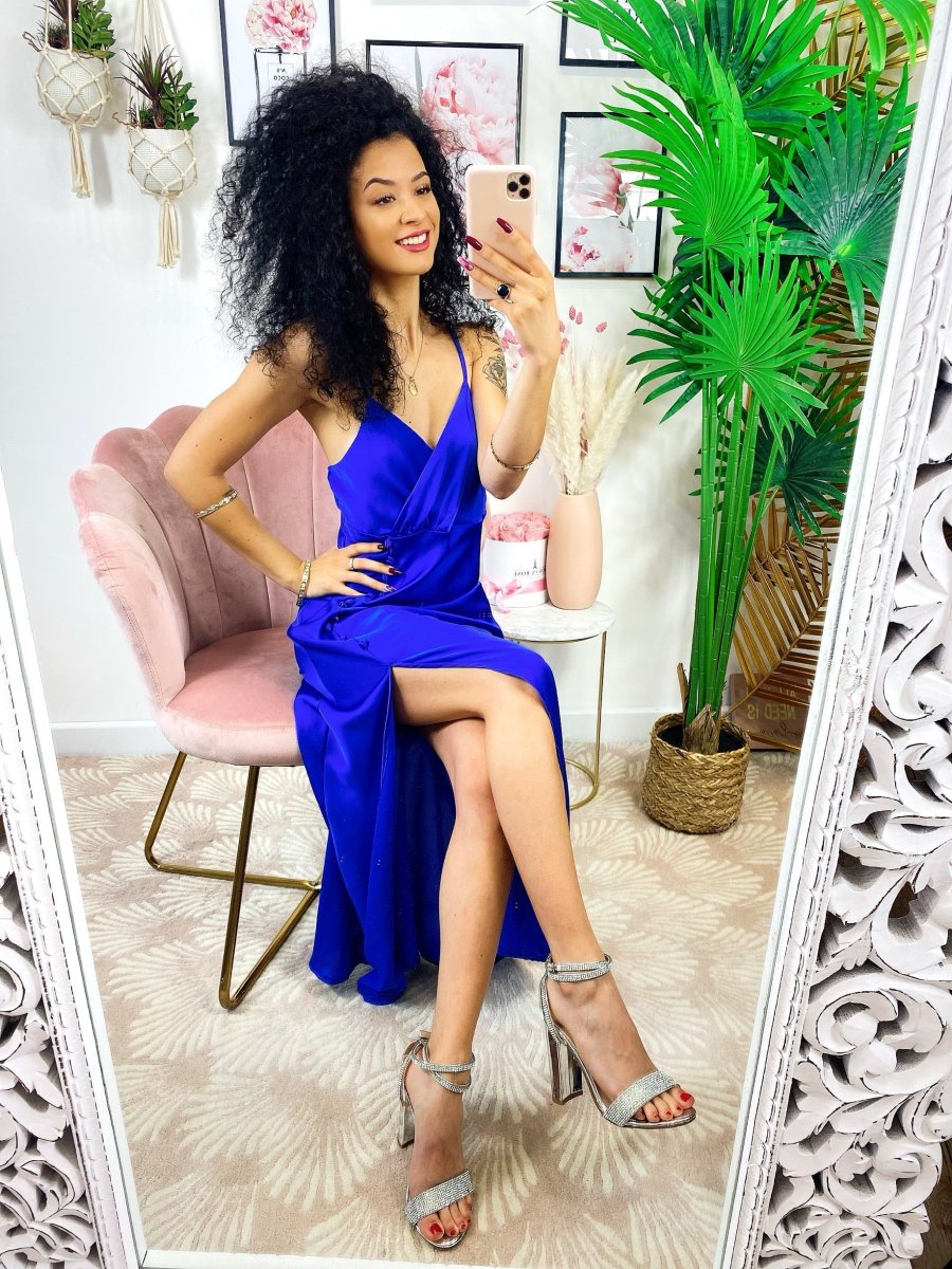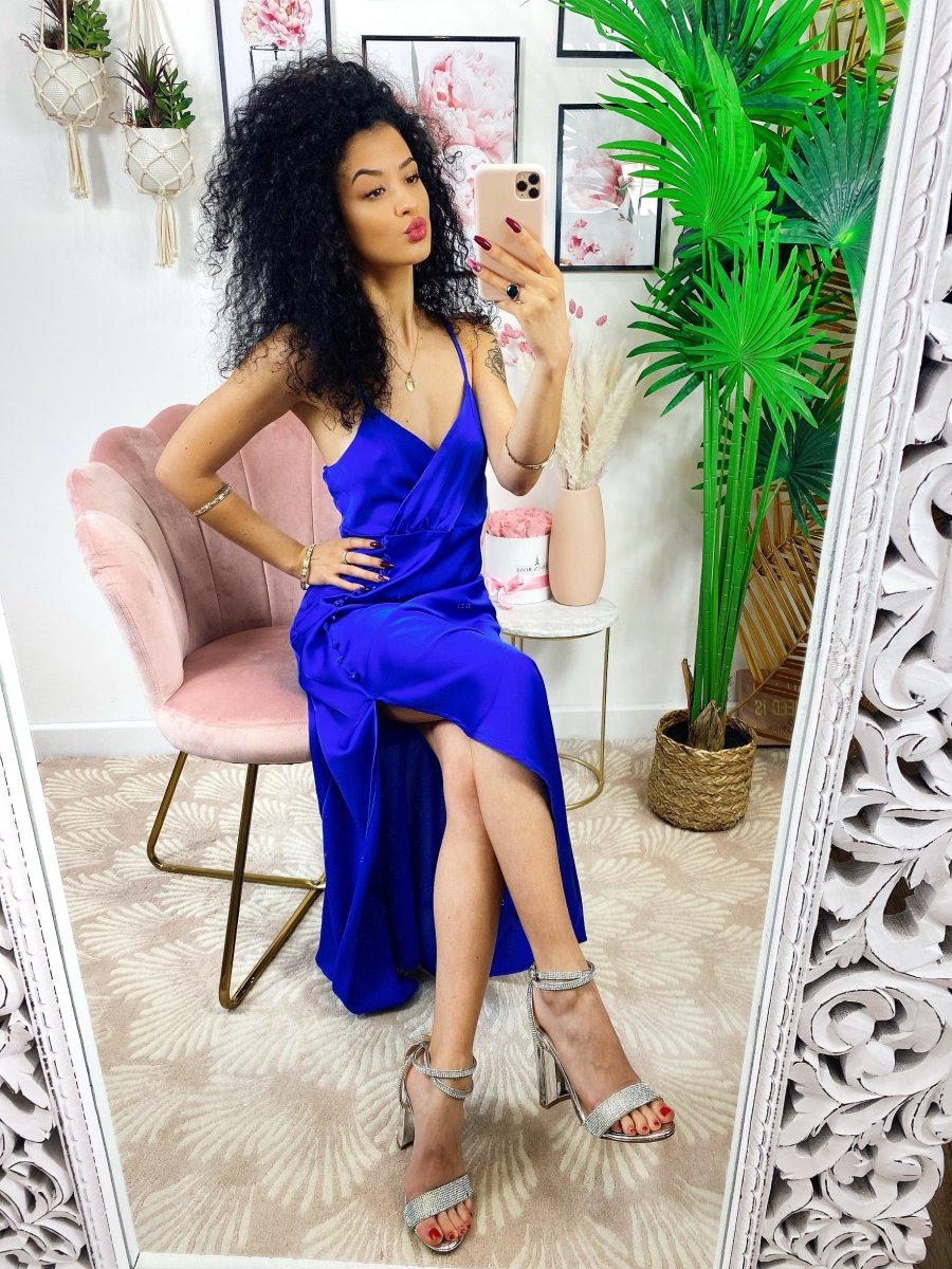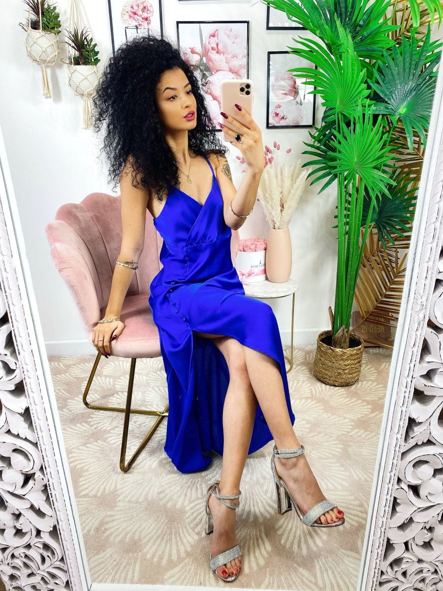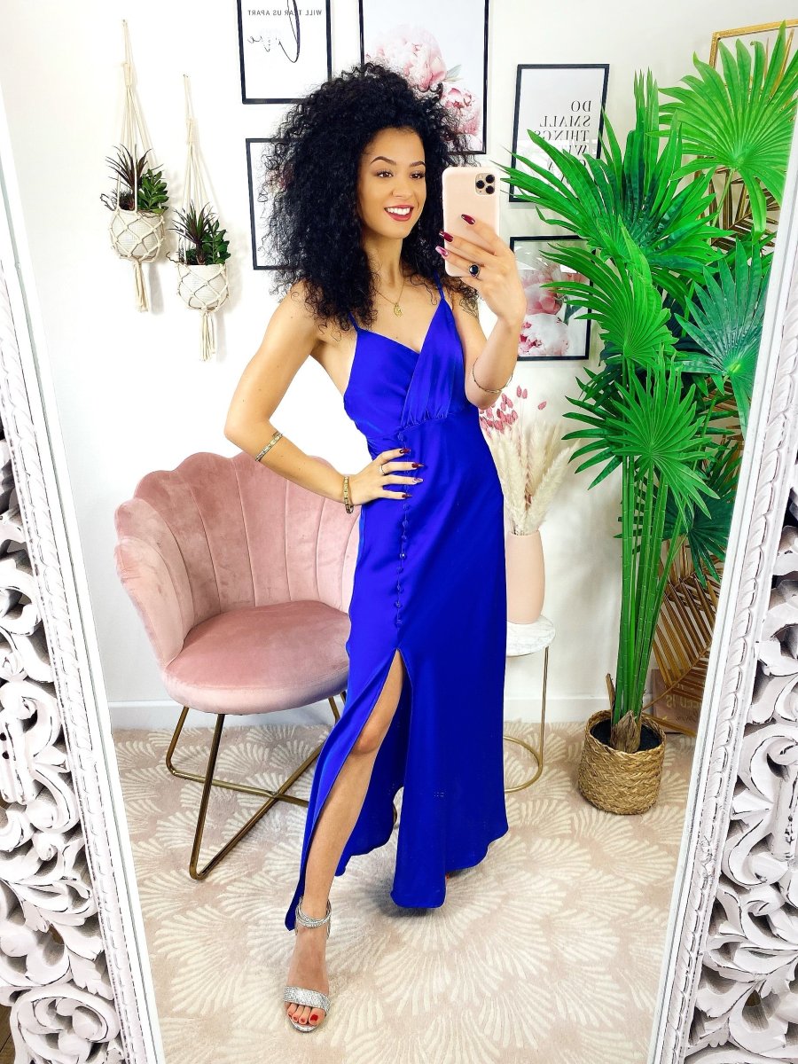 Abito in raso lungo con bretelline spacco e bottoncini. Fresco e comodo sia da giorno che da sera.
