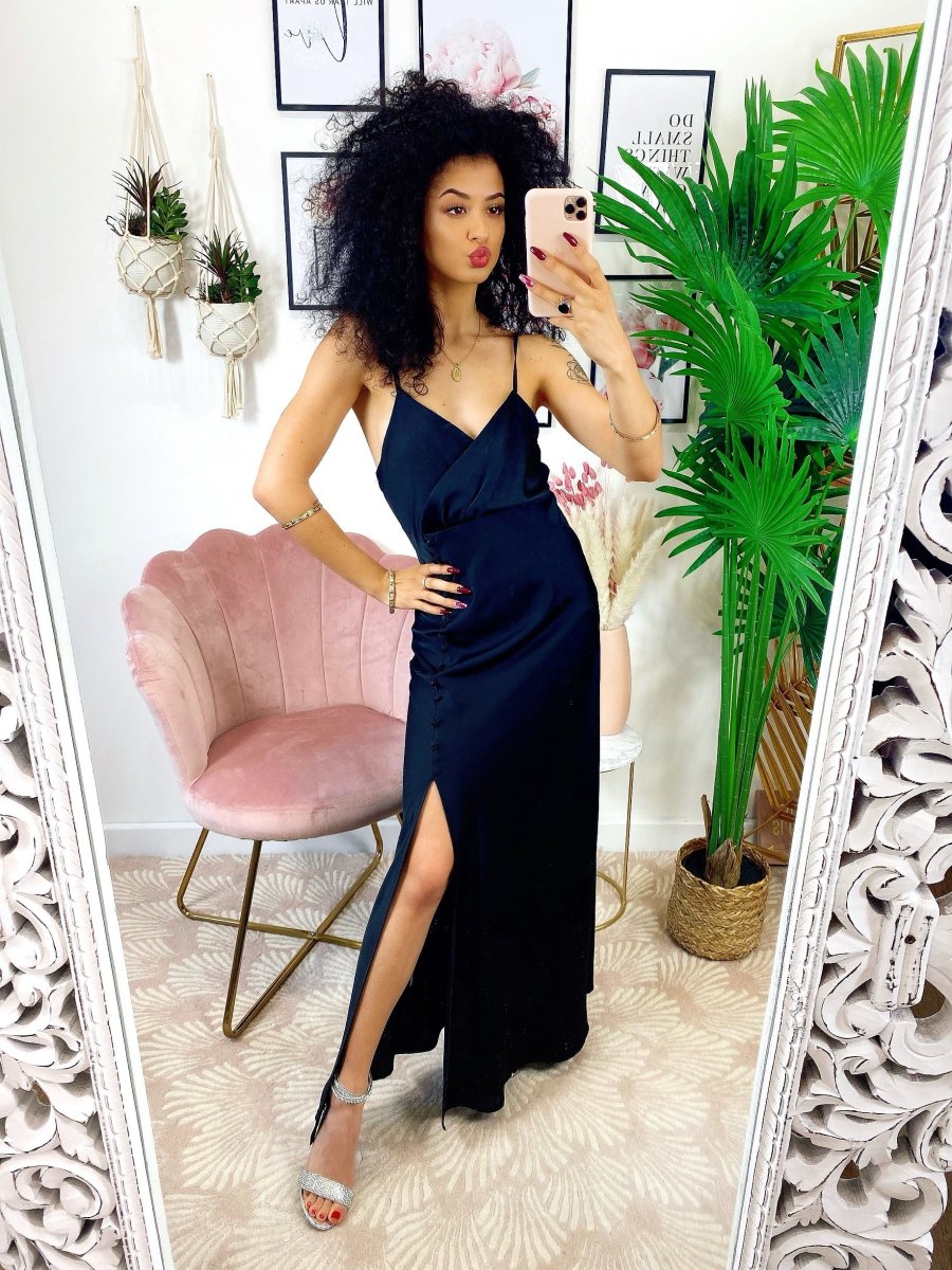 Abito in raso lungo con bretelline spacco e bottoncini. Fresco e comodo sia da giorno che da sera.