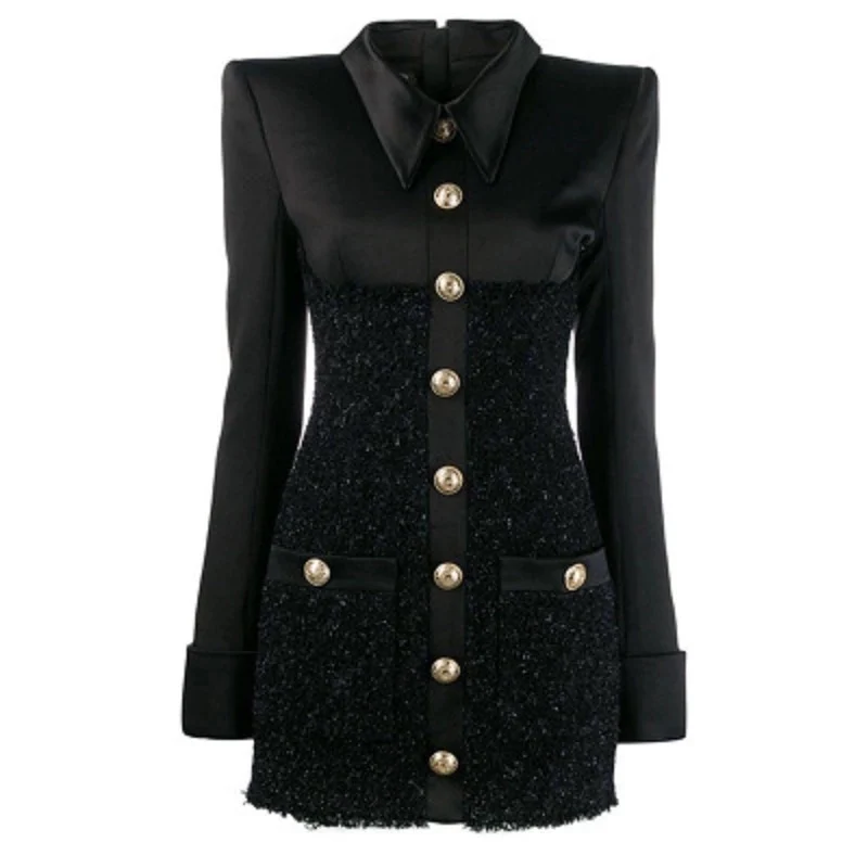 Abito in raso con dettaglio glitter e paillettes. Maxi bottoni e taschine a filetto. Perfetto e elegante per una serata Chic