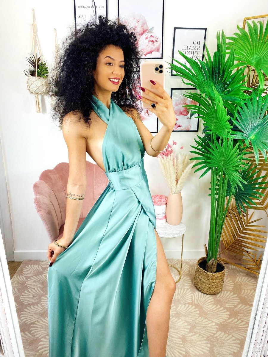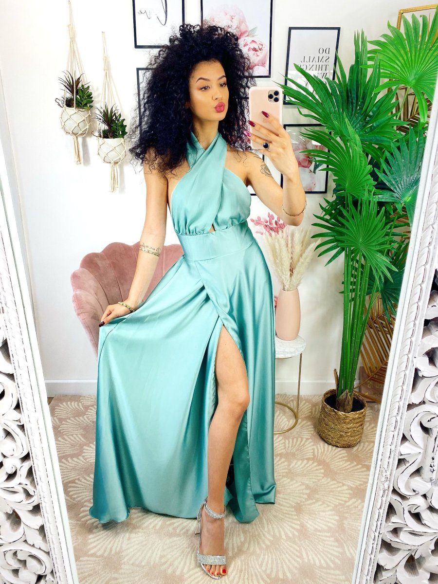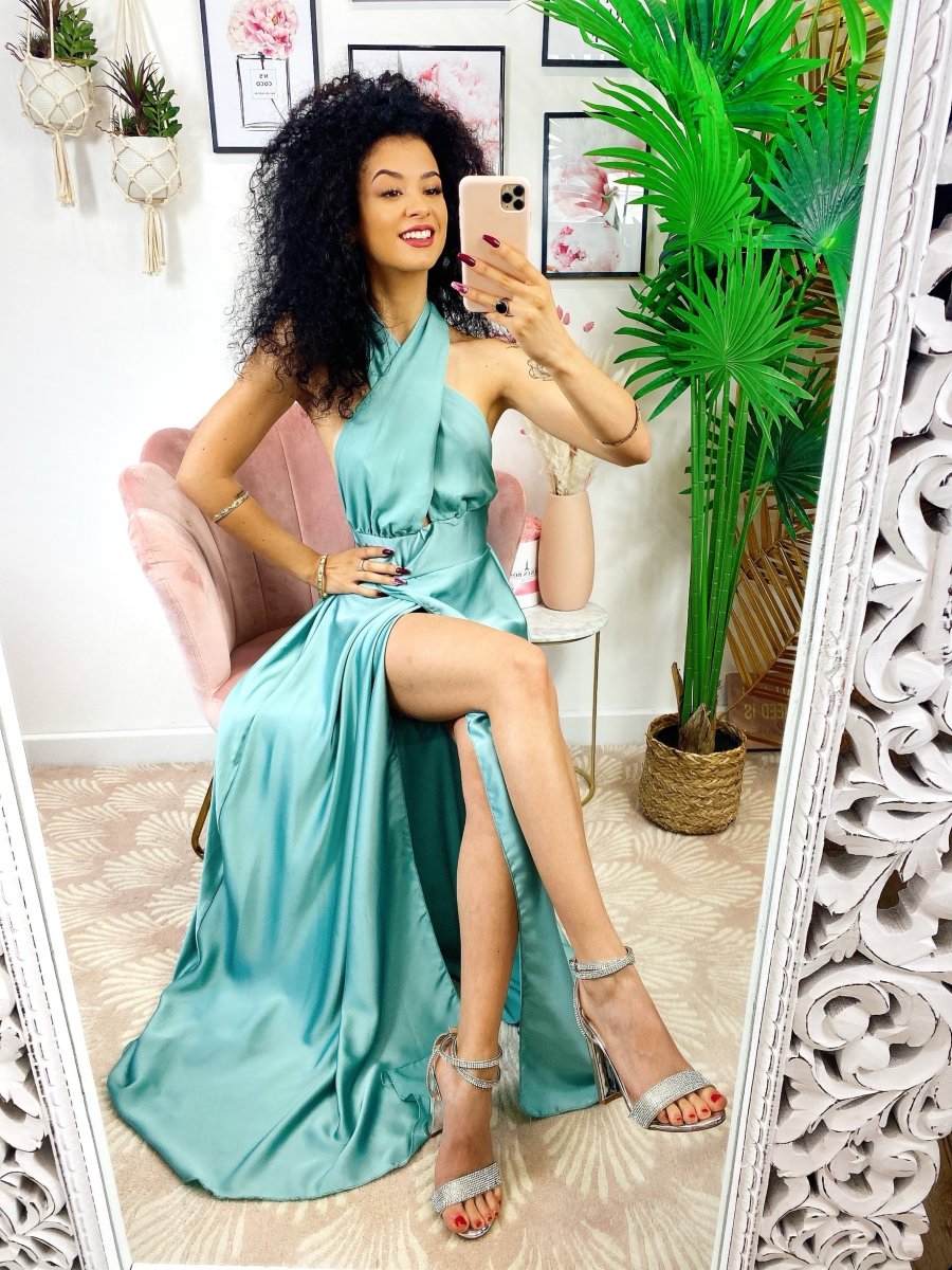 Recensisci per primo “Abito in raso con maxi spacco incrociato tiffany”