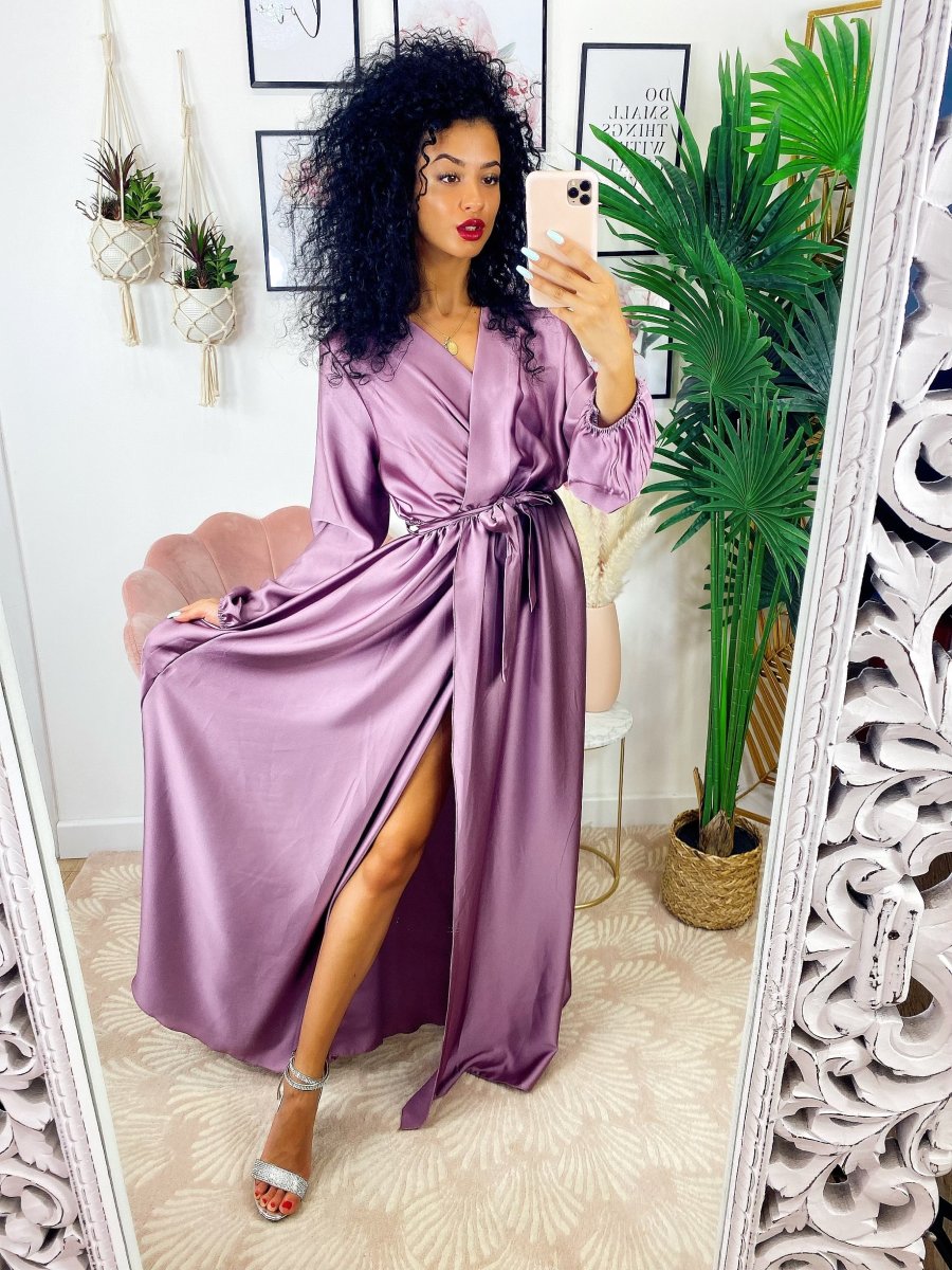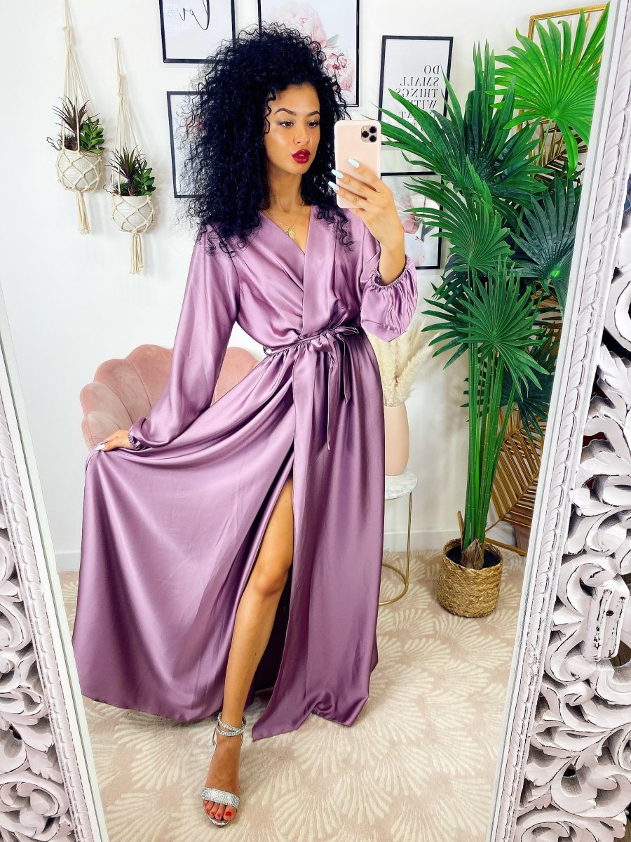Abito in raso con maxi spacco manica lunga glicine