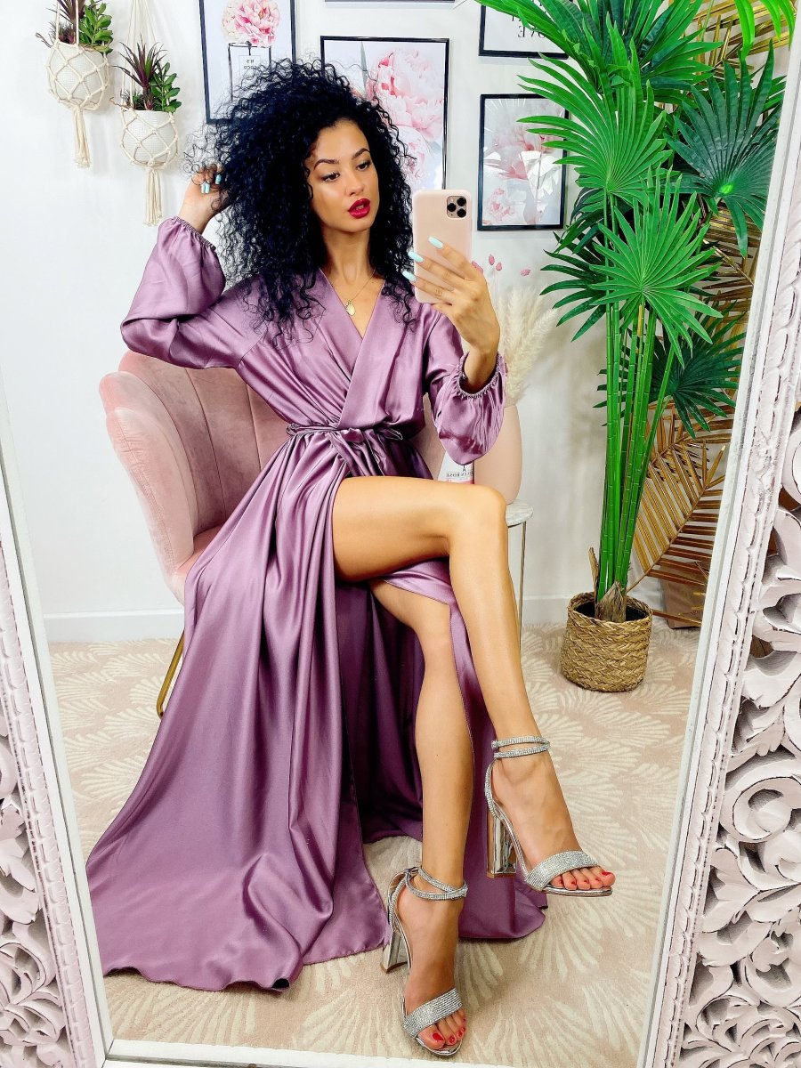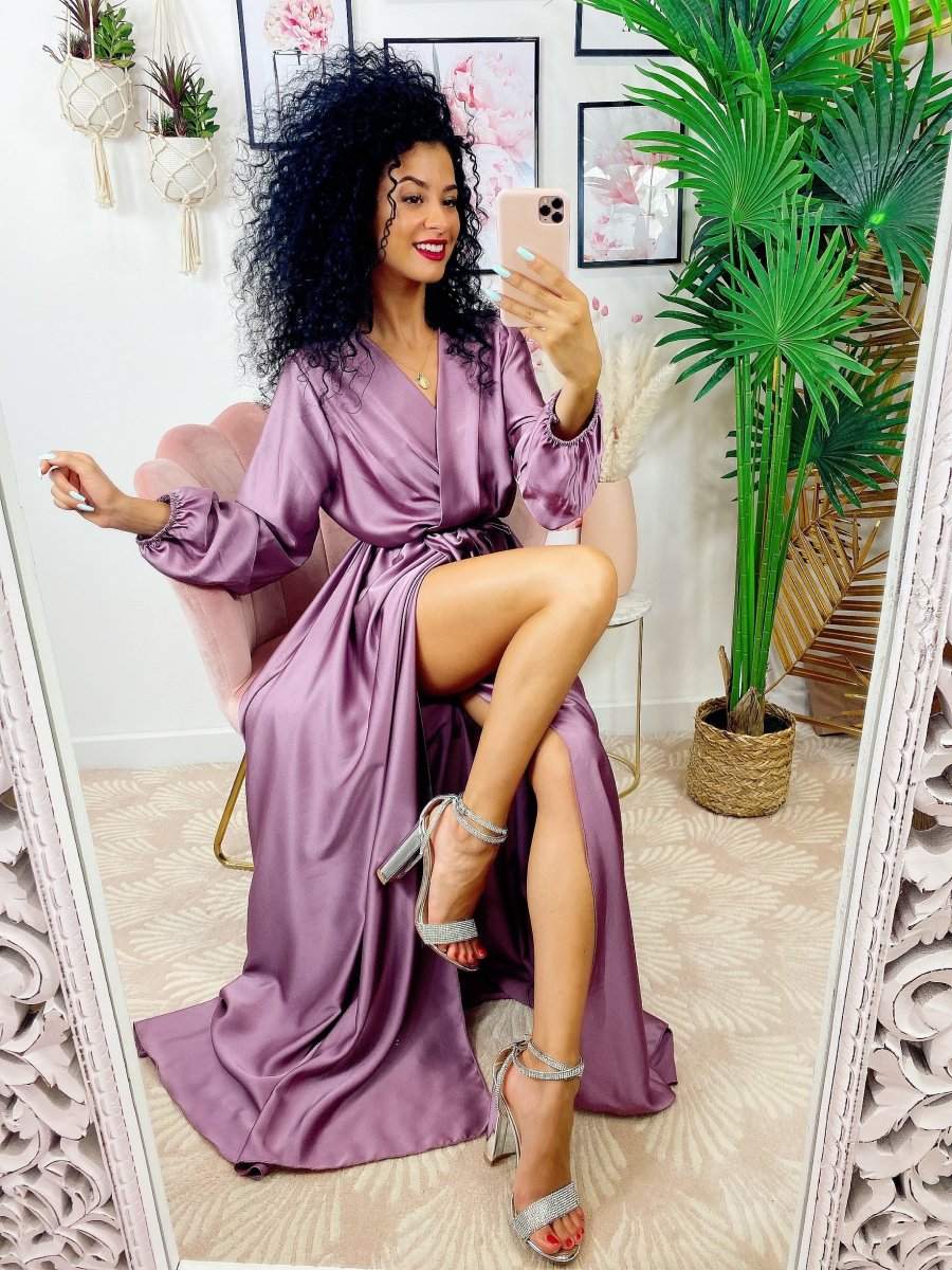 Recensisci per primo “Abito in raso con maxi spacco manica lunga glicine”