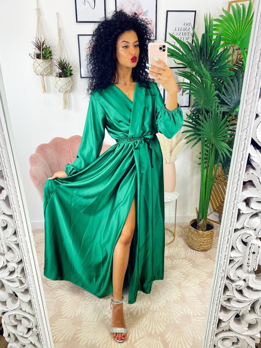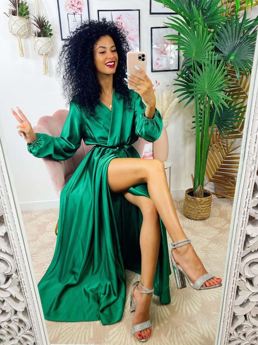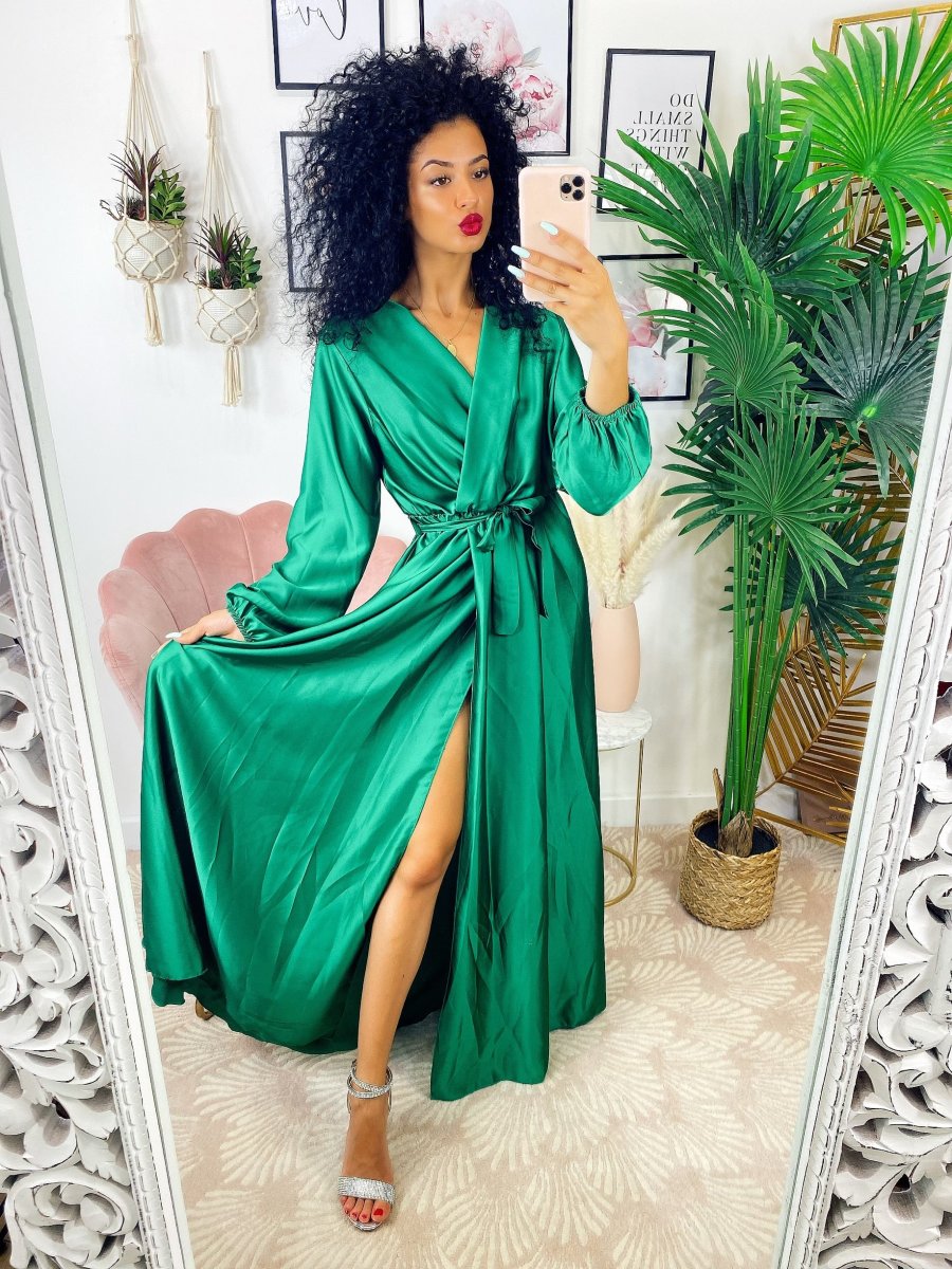 Recensisci per primo “Abito in raso con maxi spacco manica lunga verde”