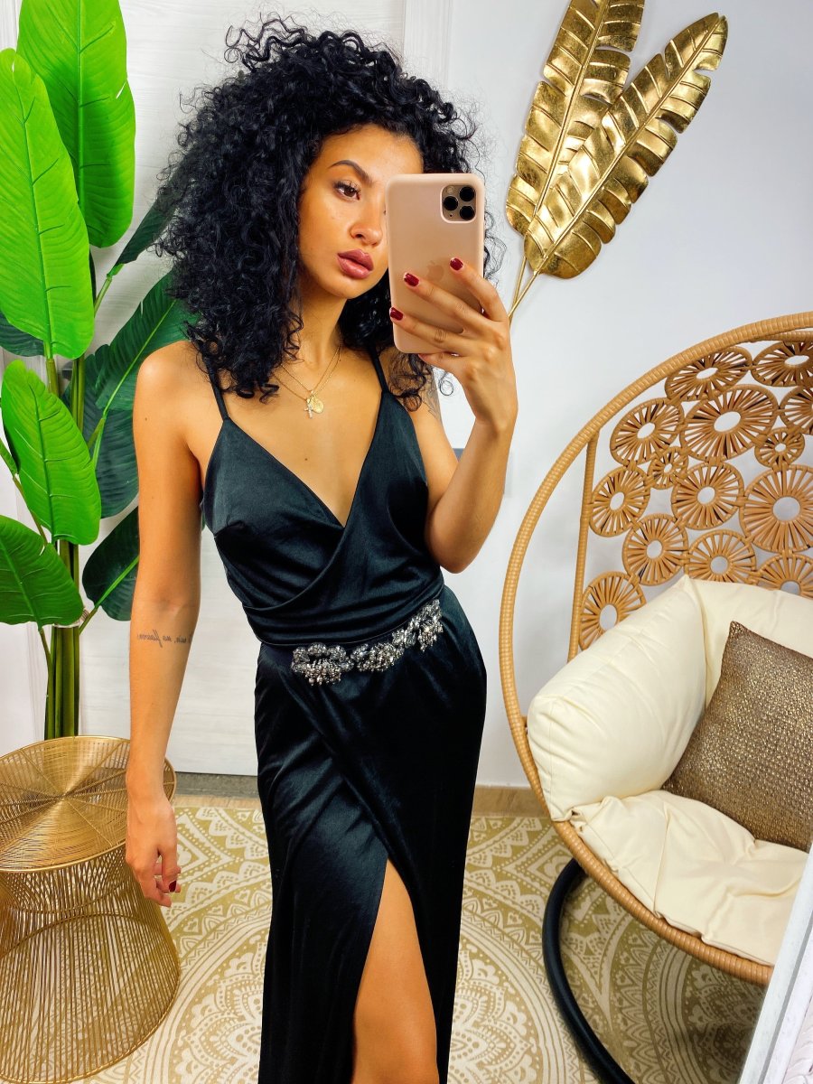 Abito in raso con maxi spacco nero di alta qualità. Fantastico abito molto lungo da indossare con un bel tacco per le serate più glamour. Tira fuori la tua sensualità e voglia di essere donna, sarai la più amata della serata !!