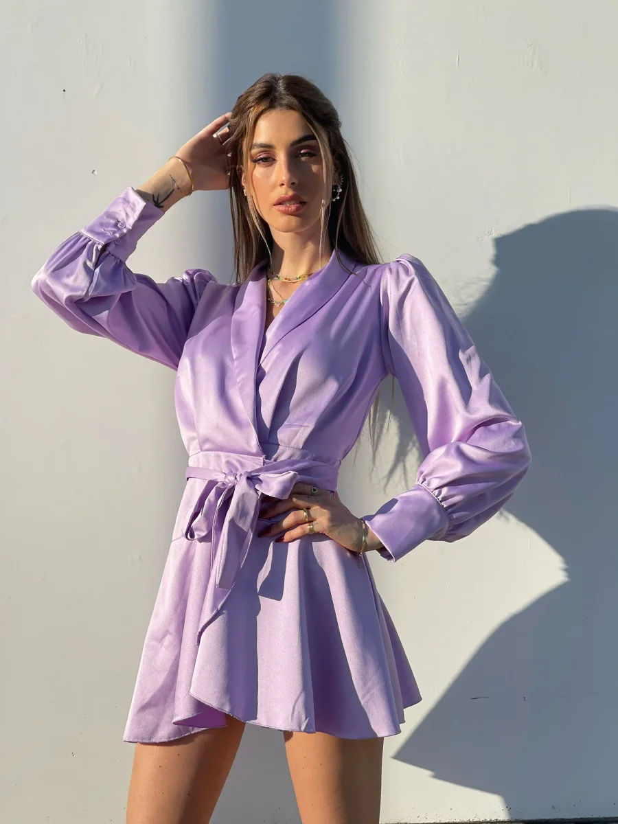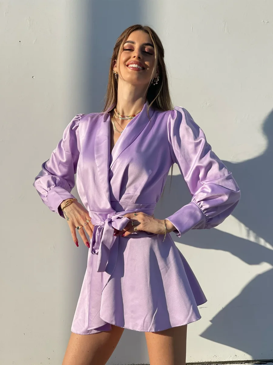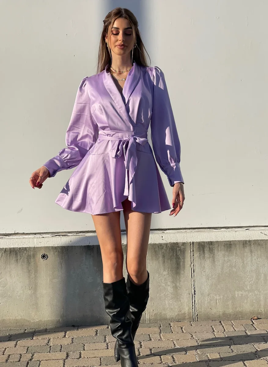 Abito in raso in un lilla pastello, chiusura a portafoglio e gonna asimmetrica. Fusciacca in vita tono su tono.