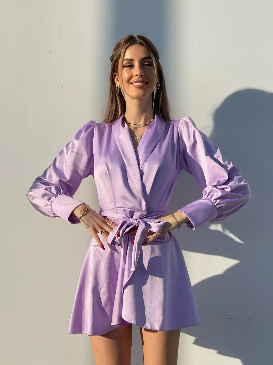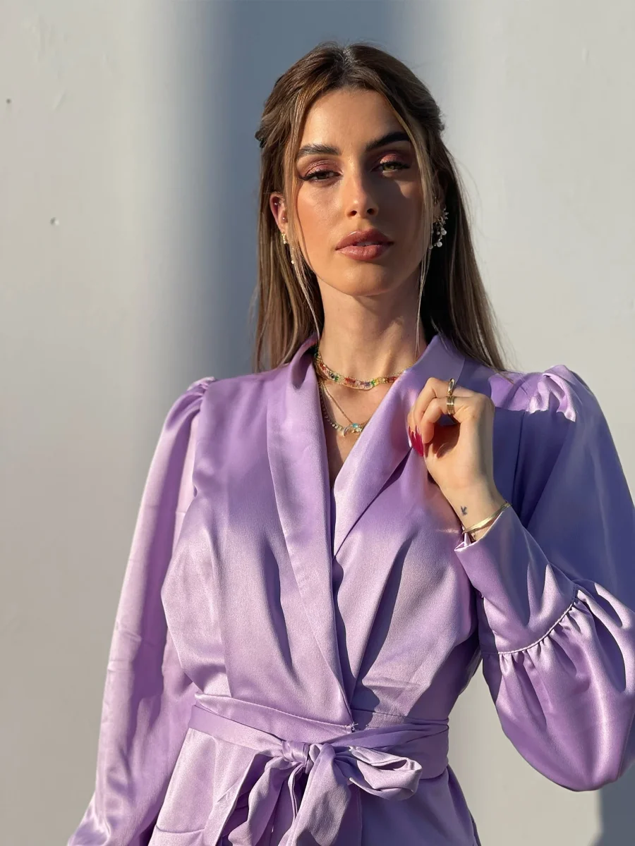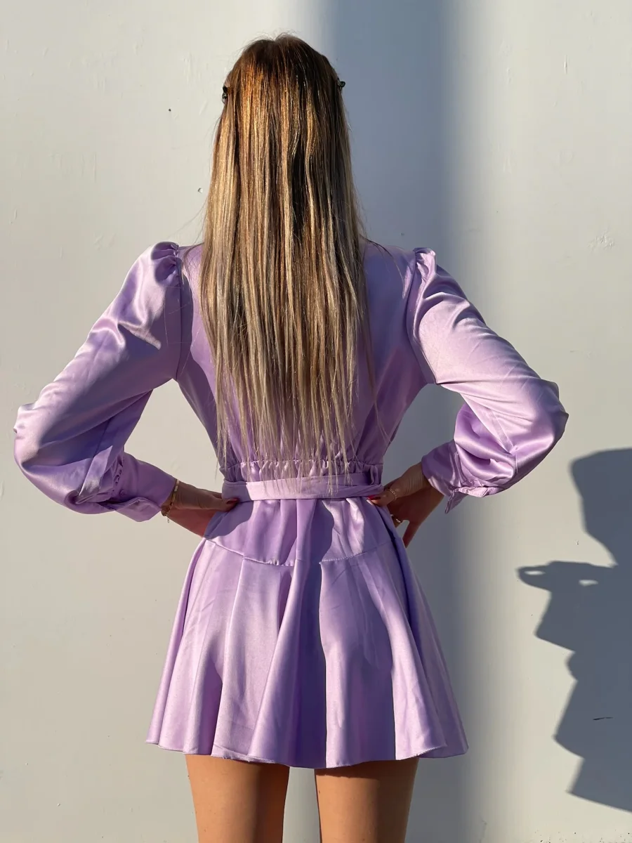 Abito in raso in un lilla pastello, chiusura a portafoglio e gonna asimmetrica. Fusciacca in vita tono su tono.