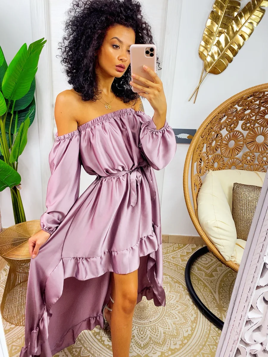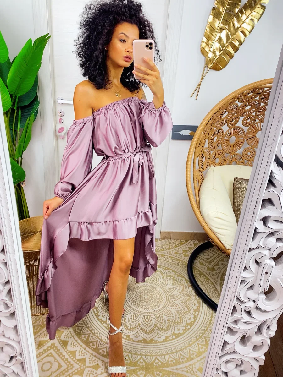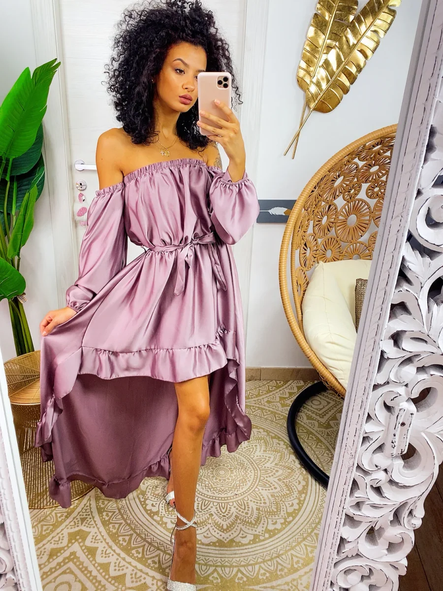 Abito in raso lungo con scollo a barchett elasticizzato. Gonna più corta sul davanti e lunga nel dietro. Fresco e comodo sia da giorno che da sera, dotato di cinturina.