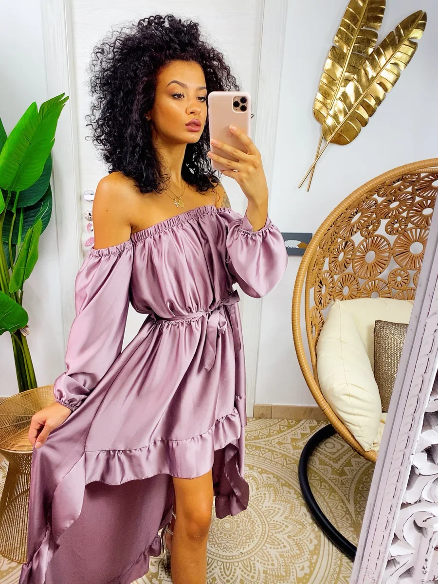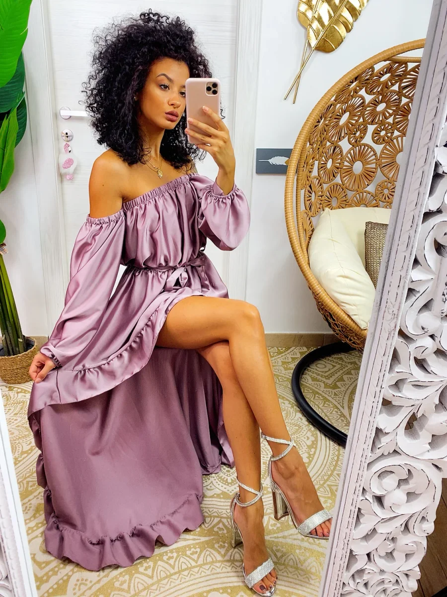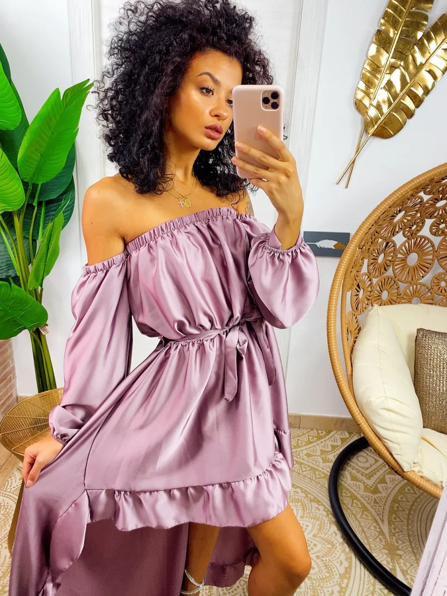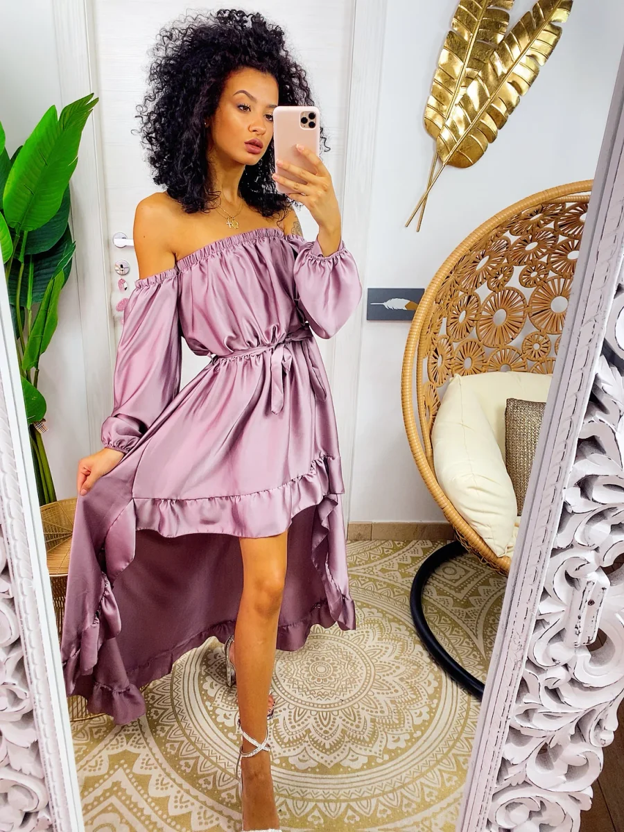 Abito in raso lungo con scollo a barchett elasticizzato. Gonna più corta sul davanti e lunga nel dietro. Fresco e comodo sia da giorno che da sera, dotato di cinturina.